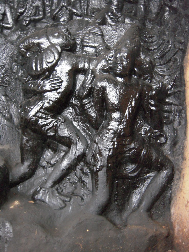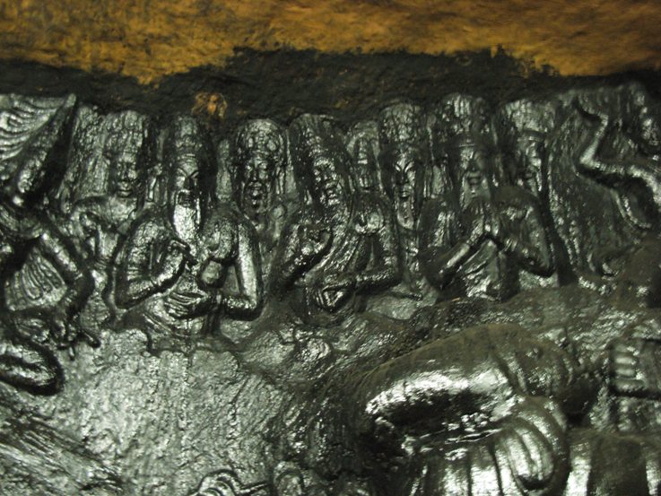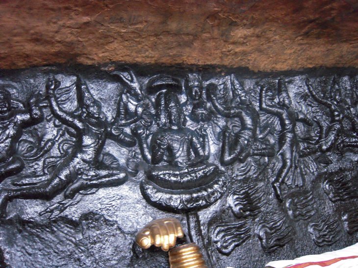 சிற்பங்கள் இக்குடைவரையிலுள்ள சிற்பங்களைப் பள்ளி கொண்ட பெருமாளின் தலைப்பக்கச் சிற்பங்கள், திருவடிப்புறச் சிற்பங்கள், வடசுவர்ச் சிற்பங்கள் என மூன்றாக வகைப்படுத்தலாம். பள்ளி கொண்ட பெருமாள் ஆதிசேஷனில் படுத்திருக்கும் விஷ்ணுவின் வலக்கை மேலே நீண்டு, சேஷனின் தலையருகே கீழ்நோக்கித் தாழ்ந்து, பாம்புடலைத் தொட்டவாறுள்ளது. இடக்கை வயிற்றருகே மேல்நோக்கி மடங்கிக் கடகமாய் விரல்களை வயிற்றை நோக்கித் திருப்பியுள்ளது.16 வலப்பாதம் சேஷனின் மீது சாய்ந்திருக்க, இடப்பாதம் நிமிர்ந்துள்ளது. இடையில் கணுக்கால்கள்வரை நீளும் பட்டாடை. அதை அரையிலிருத்தும் அரைக்கச்சின் மேலும் கீழும் முத்துவரிகள். இடைக்கட்டு நன்கு சரிந்து பக்கவாட்டில் முடிச்சுகள் கொண்டுள்ளது. உதரபந்தம், முகப்புடன் அமைந்த தோள் வளைகள், முத்துக்கள் பதித்த கைவளைகள், முழங்கையருகே கடகவளைகள், மகரகுண்டலங்கள், செவிப்பூக்கள், சரப்பளி, பெருமுத்துமாலை, ஆரம் என அணிமணிகளுடன் விளங்கும் இறைவனின் திருவடிகளில் தாள்செறிகள்; விரல்களில் மோதிரங்கள். முத்துமாலை படர்ந்துள்ள மார்பில் வலப்புறம் ஸ்ரீவத்ஸ மறு. இடுப்பில் தொங்கு சரங்களுடன் மேகலை. தலைப்பக்கச் சிற்பங்கள் விஷ்ணுவின் தலைக்குப் பின்னால் கருவறைத் தரையில் தென்பார்வையாய் இளமைக்கோலத்துடன் அமர்ந்திருப்பவர் மார்க்கண்டேயர். அவருக்குப் பின்னால் நின்றநிலையில் கருடன். இருவருக்கும் இடையில் ஆடவர் ஒருவர் சிற்பம். அவருக்கு மேலே, கருடனுக்கு இடப்புறமாய்ப் பின்சுவரில் 'பொந்து' போலக் கோளவடிவில் குடைந்து மூன்று முனிவர் சிற்பங்கள் வடிக்கப்பட்டுள்ளன. மார்க்கண்டேயர் கருடாசனத்தில் இளமைக்கோலத்துடன் சடைமகுடம், சரப்பளி, வஸ்திர முப்புரிநூல் இவற்றுடன் காட்சிதரும் மார்க்கண்டேயர் இடைக்கட்டுத் தழுவிய பட்டாடையணிந்துள்ளார். ஒன்றையொன்று நெருங்கியுள்ள கைகள் கடகத்தில் உள்ளன. கருடன் மார்க்கண்டேயருக்குப் பின்னால் கரண்டமகுடம், முப்புரிநூல் இவற்றுடன் நிற்கும் கருடனின் இறக்கைகள் இருபுறத்தும் மடிந்துள்ளன. சடைக்கற்றைகள் மகுடத்தை மீறிப் புறந்தள்ளியுள்ளன. செவிகளில் பனையோலைக் குண்டலங்கள். இருகை களையும் குறுக்கீடு செய்து பெருமாளுக்குப் பணிவு காட்டினாலும், இடக்கை மார்பருகே தர்ஜனியாக அச்சுறுத்துகிறது. வலக்கை இடத்தோளில் படிந்துள்ளது. கடைவாய்ப் புறத்தே கோரைப்பற்கள். கைகளில், மேற்பகுதியில் முகப்பணியுடனான நாகத் தோள்வளைகள்; மணிக்கட்டுகளில் வளைகள். கழுத்தில் கண்டிகை, சரப்பளி. இடையாடை கணுக்கால்வரை நீண்டுள்ளது. அரைப்பட்டிகையின் முடிச்சுத்தொங்கல்கள் தொடைகள் மீது தவழ, இடைக்கட்டு இருபுறத்தும் முடிச்சிடப்பட்டுள்ளது. ஆடவர் சிற்பம