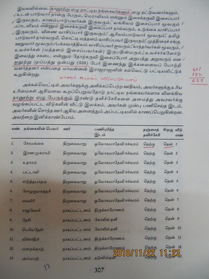 நலந்தானே. நெடிய இடைவேளைக்குப் பிறகு எழுதுவதற்காகப் பொறுத்துக்கொள். பல எழுத விழையினும் பல போதுகளில் அந்த விழைவு துளிர்விடினும் பணிச்சூழல் தடையாகிவிடுகிறது. இப்போதும்கூட மலைக்க வைக்கும் மாடக்கோயில்கள் முற்றுகையிட்டுள்ளன. எனினும், வரலாறு மின்னிதழிற்கு எழுதுமாறு தம்பி கமலக்கண்ணன் கேட்டபோது, வாருணியே கேட்பது போல் உணர்ந்தேன். உன் பெயர் முன் நிற்கும்போது பணியாவது, சூழலாவது! எழுத எவ்வளவோ இருந்தபோதும் அந்த வரிசையில் முதலாக நிற்பது தளிச்சேரிக் கல்வெட்டுதான். 23. 4. 2010 அன்று வெளியான இந்து நாளிதழில் சுகந்தி கிருஷ்ணமாச்சாரி, 'Voyage of Discovery' என்ற தலைப்பில், 'Rajarajechcharam is Kudavayil Balasubramanian's Tribute to Rajaraja Chola' என்ற குறிப்புடன் எழுதியிருந்த கட்டுரையைப் படித்தேன். 'The book is the result of his 40 year obsession with the big temple' என்றும் சுகந்தி குறிப்பிட்டுள்ளார். முனைவர் அவ்வை நடராசனுடன் நிகழ்த்திய உரையாடலின்போது நண்பர் பாலசுப்ரமணியனே, இந்த நூல் தம்முடைய இருபதாண்டுக் கால உழைப்பு என்றும் தஞ்சைப் பெரிய கோயிலை அங்குலம் அங்குலமாகத் தாம் ஆய்ந்துள்ளதாகவும் 110 கல்வெட்டுகளையும் முப்பது துண்டுக் கல்வெட்டுகளையும் இந்நூலின் ஆய்வுக்காகத் தாம் எடுத்துக் கொண்டதாகவும் குறிப்பிட்டுள்ளதாக தினமணியின் 2010 தீபாவளி மலரின் படப்பிடிப்புக் காட்டுகிறது. சுகந்தி கிருஷ்ணமாச்சாரியின் கட்டுரையைப் படித்ததும் நண்பர் பாலசுப்ரமணியனுடன் தொலைபேசி நூலை விலைக்குப் பெற்றேன். நண்பரின் இருபதாண்டு உழைப்பு 518 பக்கங்களாக மலர்ந்துள்ளது. இந்த இருபதாண்டுகள் அவருடைய பார்வையில், பரிமாணத்தில், ஆய்வு நுட்பத்தில் வளர்நிலைகளை உருவாக்கியிருக்கும் என்ற தளராத நம்பிக்கையுடன் நூலிற்குள் நுழைந்தேன். பல இடங்களில் தடுமாறி நின்றாலும் பக்கம் 306ல் தொடங்கும், 'நாட்டியக்கலை' அதை முடித்த நிலையில், மேற்கொண்டு தொடரமுடியாதபடி என்னை நிறுத்திவிட்டது. முதலாம் இராஜராஜர் தஞ்சாவூரில் தாம் எடுப்பித்த கற்றளியாம் இராஜராஜீசுவரத்தில் பணியாற்றச் சோழமண்டலத்துத் தளிச்சேரிகளில் இருந்து கொணர்ந்து தஞ்சாவூர்த் தளிச்சேரிகளில் குடியேற்றிய பெண்டுகளின் எண்ணிக்கை 400. 1995ல் வெளியாகியுள்ள தம்முடைய 'தஞ்சாவூர்' (திருவாவடுதுறை ஆதீன வெளியீடு, ப. 269) எனும் நூலிலும் பாலசுப்ரமணியன் இதே எண்ணையே குறிப்பிட்டுள்ளார். ஆனால், தம்முடைய புதிய நூலில் இந்த எண்ணிக்கையை மாற்றி 407 என்று குறிப்பிட்டுள்ளார். 'நானூற்று ஏழு நாட்டிய நங்கையர்களும்' என்று நூலின் பக்கம் 307ல் தொடங்கும் நாட்டியக்கலை பற்றிய அவருடைய தொடர், அந்நங்கையர்களுடன் இராஜராஜீசுவரத்திற்கு நிவந்தக்காரர்களாய் இராஜராஜரால் வழங்கப்பெற்ற இசைக்கலைஞர்களாக 132 பேரை இணைத்து, 'ஐநூற்று முப்பத்து ஒன்பது (539) ப