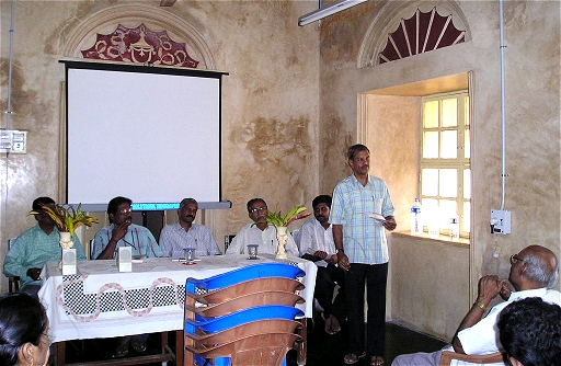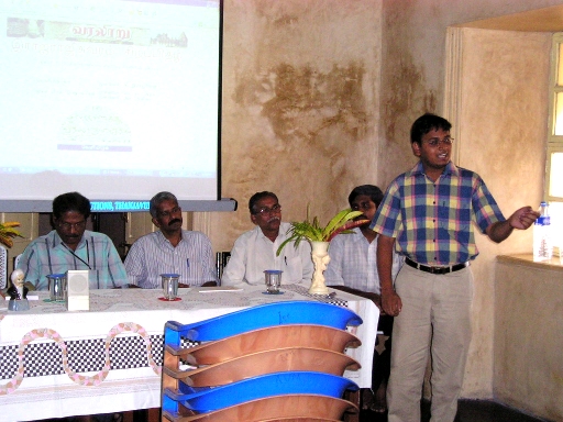 தஞ்சையில் ஜனவரி 30, 2005 அன்று நடைபெற்ற முப்பெரும் விழா மாபெரும் வெற்றிவிழாவாக அமைந்ததற்கு இறையருளும் நல்லோர் ஆசிகளும் நேயர்களின் மகத்தான ஆதரவுமே காரணம் என்றால் அது மிகையில்லை. விழாவிற்கு சில நாட்களுக்கு முன்னதாக முன்னணி செய்தித்தாள்களான தி இந்து மற்றும் தினமணி வரலாறு டாட் காம் பற்றியும் நமது குழுவின் நடவடிக்கைகள் பற்றியும் ஜனவரி30ம் தேதியன்று வெளியிடப்படப்போகும் சிறப்பிதழ் பற்றியும் செய்திகளை வெளியிட்டு நமது பணியை கெளரவித்தன. இந்தச் செய்திகளை தொகுத்து தனிக் கட்டுரையாக இதே இதழில் வெளியிட்டுள்ளோம். விழா சோழ நாட்டில் நித்தவினோத* வளநாட்டில் தஞ்சாவூர் கூற்றத்தில் வரலாறு கண்டிராத பேரரசர் இராஜராஜர் எடுப்பித்த இராஜராஜீஸ்வர திருக்கற்றளி வளாகத்திலேயே நடைபெற்றது நமது பாக்கியம். இதற்கு அனுமதியளித்து உரிய ஏற்பாடுகளை செவ்வனே செய்துகொடுத்த மத்திய தொல்லியல் அளவீட்டுத் துறைக்கும்(Archaeological Survey of India) அதன் தென்னிந்தியத் தலைவர் திரு.தியாக.சத்தியமூர்த்தி அவர்களுக்கும் விழாவிற்கு வந்து சிறப்பித்த துறையின் கல்வெட்டு ஆய்வாளர் டாக்டர்.கா.இராஜவேலு மற்றும் திருக்கற்றளியின் முதுநிலை அலுவலர் திரு.பரமநாதன் அவர்களுக்கும் நமது நெஞ்சம் நிறைந்த நன்றி உரியது. * இராஜராஜரின் ஒரு பட்டப்பெயர் நித்தவினோதன் என்பதாகும் விழாவிற்கு வந்திருந்து நம்மை சிறப்பித்து மனமார்ந்த வாழ்த்துரை வழங்கிய தஞ்சை ஆய்வாளர் திரு.குடவாயில் பாலசுப்பிரமணியத்திற்கு வார்த்தைகளில் நன்றி சொல்வது கடினம். நமது குழுவின்மேல் மிகுந்த அன்பும் பற்றும் கொண்ட இந்தப் பெரியவர் விழா முடிந்ததும் தனியே நம்மை சந்தித்து பொழிவின் அருமையையும் நமது குழுவின் முயற்சியையும் வாழ்த்தியது நமக்குக் கிடைத்த பெரும் பேறு. விழா ஏற்பாடுகளில் நம்முடன் தோள் கொடுத்து உதவிய பொன்னியின் செல்வன் குழு நண்பர்கள் திரு.பாலாஜி நல்லதம்பி, திரு.சதீஷ் அருண், திரு.சசி மற்றும் திரு.சங்கரனுக்கு நன்றிக் கடப்பாடுடையவர்கள் ஆகின்றோம். காலை 9.30 மணிக்கே விழா நடக்கப்போகும் அரங்கம் களை கட்டிவிட்டது. ஆய்வாளர்கள் ஒரு பக்கம், பத்திரிக்கையாளர்கள் ஒரு பக்கம், வரலாற்றின்பால் காதல் கொண்டு நெடுந்தொலைவு கடந்து வந்திருந்த நல்நெஞ்சங்கள் ஒரு பக்கமென கூட்டம் சூழ ஆரம்பித்துவிட்டது. சரியாக 10.10 மணிக்கு தமிழ்த்தாய் வாழ்த்தினை திருமதி.இரா.இலலிதாம்பாள் மற்றும் செல்வி மு.லாவண்யா பாட விழா தொடங்கியது. திரு.கிருபாசங்கர் வந்திருப்போரை வரவேற்று வெண்பா பாடினார். ![]() பெண் தெய்வ வழிபாடு புத்தகத்தை திரு.பரமநாதன் வெளியிட, திரு.சுந்தர் பரத்வாஜ் பெற்றுக்கொள்கிறார் டாக்டர் இரா.கலைக்கோவனின் "பெண் தெய்வ வழிபாடு - தோற்றம