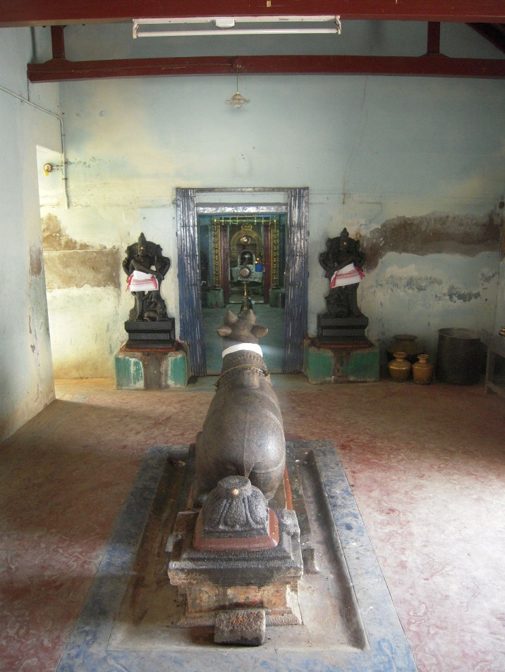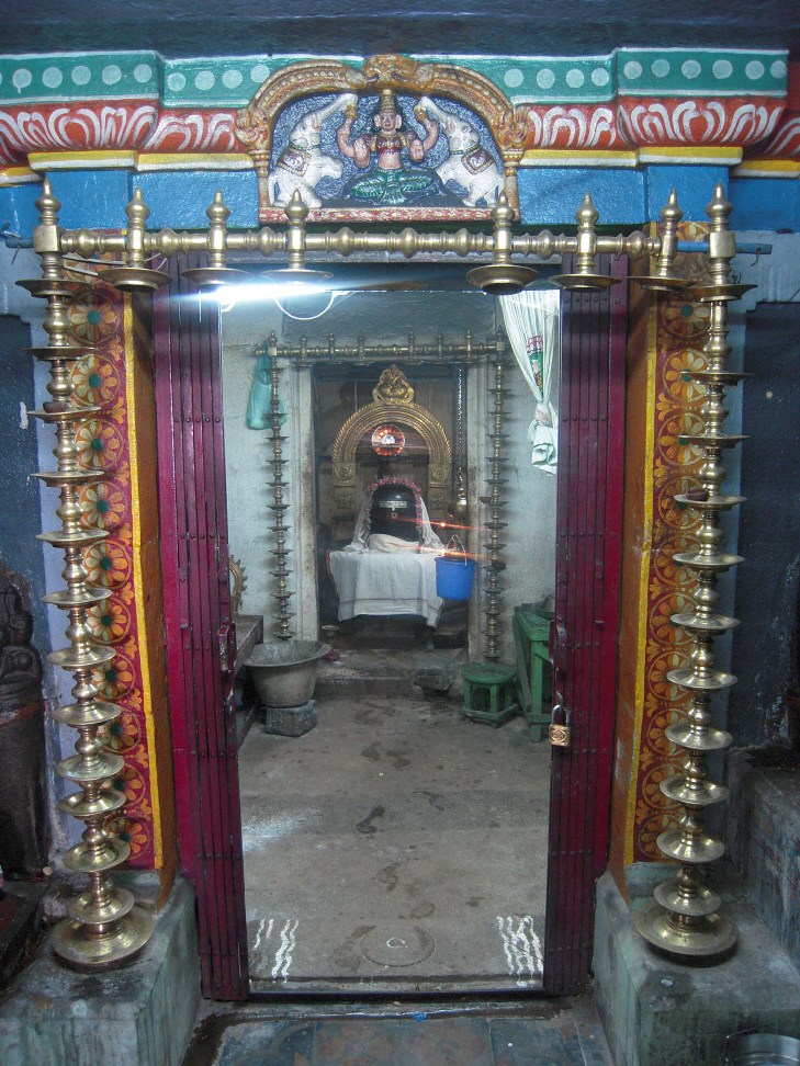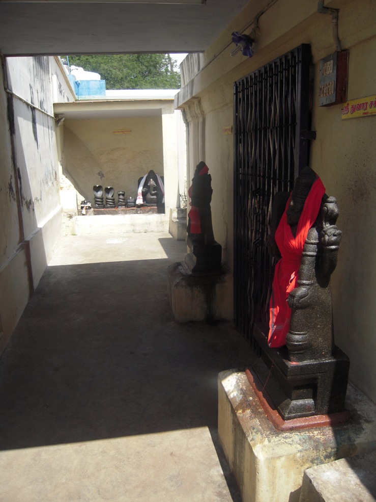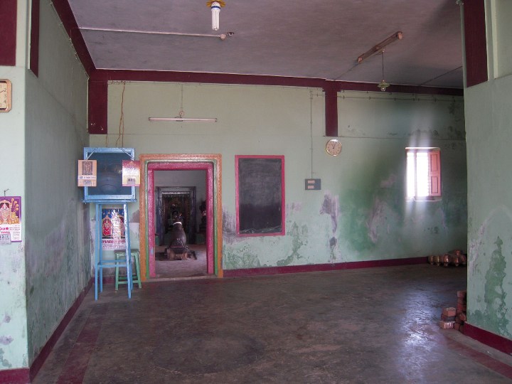 THE FRONT VIEW OF THE TEMPLE COMPLEX THE TEMPLE COMPLEX The main entrance to the temple is on the east. The first mandapa is known in the name of its sponsor Aa.Ra.Ramasamy Chettiyar. The vahana of the temple is kept on northern side of this mandapa. The first mandapa leads to a passage where Nandi and balitala placed in the center facing the sanctum. The passage has doorway both on the north and south to reach the open prakara. The northern doorway leads to the northern prakara where the shrines of Bhairava and Navagraha are seen, followed by a shrine for Linga and a shrine in the north-west houses Muruga and his consorts. Sarasvathi, Mahalakshmi and Durga are kept in a separate shrine. The first mandapa, the passage and the shrines in the prakara are of very late origin with cement flooring and roofing. ![]() THE FRONT MANDAPA ![]() THE NANDI IN THE PASSAGE The passage leads to the mukha mandapa where the entrance is flanked by dvarapalas. The mukha mandapa is a pillared hall, in which, on the northern side is a shrine for goddess Sri Mangala Nayaki Amman facing south and on the west, north and south are seen closed provisions on a raised platform, where bronze icons are kept. The pillars of the mandapa are four in number and are sectioned as three squares and kattu in between. The faces of the squares are adorned with miniatures and the corners of the lower squares are adorned with nagabandhas. The potikas are vettu and hold the prastara above. The roof of the mandapa is paved with stone slabs. ![]() THE MANGALA NAYAGI AMMAN SHRINE The Mangala Nayagi Amman shrine consists of a single tier vesara vimana and a mukha mandapa. The goddess is standing on a pedestal in sama with her right hand carrying a flower and the left hand dola to her left. Another entrance to the mukha mandapa is on the south opposite to the Amman shrine where dvarapalikas are kept. The mukha mandapa is partly stone and cement construction and decorated with rich colours of paintings and patterns. The mukha mandapa leads to the ardha mandapa where in its entrance on either side is seen the bas-relief sculptures of Ganesa and Muruga. The ardha mandapa is a small stone structure that adjoins the anterior wall of the rock cut shrine. ![]() ![]() THE PRAKARA ![]() THE SANCTUM The anterior wall of the sanctum is 2.17mts in the north-south direction and an aperture to a height of 1.67mts and to a width of .84mts is formed in the centre. The sanctum entrance has rock cut door jambs, lintel and sill. Adjoining the door jambs on both side two rims are shown; the outer rim is thin strip and the inner rim is little big and formed as rudra. Kapota is shown above the entrance. Fragments of inscriptions of Tamil and Telugu are found on the anterior wall of the sanctum and the mandapa wall. THE SANCTUM The sanctum is cubical with 2.70 mts in length and breadth. The shrine cell houses rock-cut Linga. The avudaiyar is .58mts and the bana is .55mts. The octagonal avudaiyar has padabandha features of jagati, rudra kumuda, kantha with pada flanked by kampa on either side and pattika. A small gomukha is on the north under it a scroll like support is shown.4 The sill is partly chiseled out to form an outlet to sanctum water which also continues along the northern side of the ardha mandapa. Vajana is running throughout the sanctum roof. The rock cut shrine is crowned by the newly constructed upper structures, a tala and dravida shikara above it. Footnotes : 1. Field visit on 19-06-2011. 2. www.earth.google.com. Latitude : 10014' 21.42N Longitude : 78048' 28.30E 3. At present the deity and the temple is known in this name. 4. மு.நளினி, இரா.கலைக்கோவன், புதுக்கோட்டை மாவட்டக் குடைவரைகள், டாக்டர் மா. இராசமாணிக்கனார் வரலாற்று ஆய்வு மையம், திருச்சிராப்பள்ளி p – 18., measures as mentioned by the authors. g.245.this is txt file |