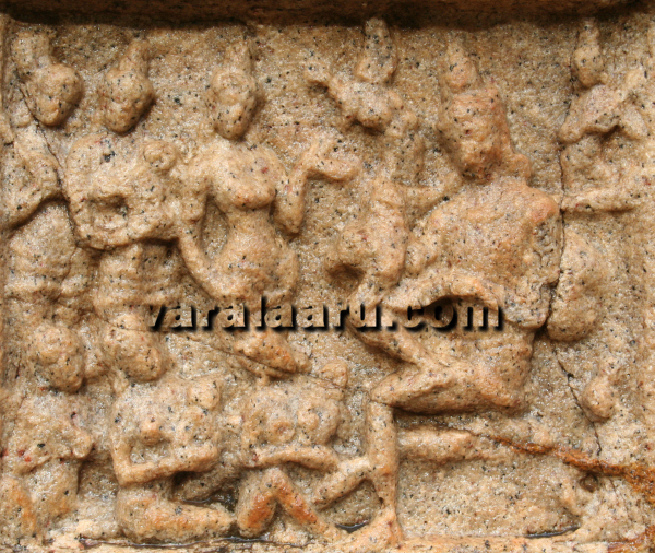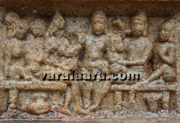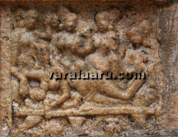 At Kumbakonam, the event is captured in two independent panels- the birth of Rama and presentation to the King. At Pullamangai, the panels directly proceed to royal presentation after the distribution of Pinda. Here, the birth of princes is indirectly implied but not explicitely sculpted. The Birth of Rama - Kumbakonam Queen Kausalya is lying on a couch and is breast feeding her baby. Her right hand is resting on a pillow while the left hand is gently held around the baby’s hip – supporting his head. This posture should have been directly inspired by contemporary brestfeeding moms of Chola period and this is how moms should have held their babies then. Rural woman breastfeed their babies in such positions to this day. ![]() The long and slender legs of the queen are resting on another pillow and her tired feet are gently massaged by a maid. The slender waist, long legs and broard shoulders of the queen are skillfully sculpted by the Chola sculptor – bringing out the beauty of Kausalya with verve and vigor. Various vessels (possibly made out of brass) are seen below the couch – once again drawing inspiration from contemporary assets. Three maids are seen in the background. The distance between these three maids and the queen has to be assumed. The one in right hand corner of the panel is holding something in her left hand. She is attentively listening to the conversation between the other two maids, which is in progress. Among the conversing maids, the one on the left side (of the spectator) is resting an unidentifiable object (possibly a musical instrument) in her left shoulder; the other is simply talking to her with raised right hand. These four maids should be considered as intimate companions of the chief queen and they are keeping her in good humor after the delivery. Compositional aspects The panel is divided into two horizontal segments. The bottom half is occupied by the brestfeeding mother and her baby – who are the central figures of the panel. The upper half is allocated to four maids who are companions of the queen. The overall mood of the sculpture is that of gentle joy and the satisfaction provided by the arrival of newborn. This scene is conspicuous by its absence at Pullamangai and other locations. The Royal Presentation - Kumbakonam King Dasaratha is seated in a chair with his favourite queen by his side. One of the new born babies (possibly Rama) is seated in his thigh and is anxiously looking at his father. The king’s left arm is supporting the baby. The joy and compassion of Dasaratha is very explicit in the panel and needs no further elaborations. ![]() His favourite queen Kaikeyi, who is seated next to him, is enjoying the scene. Her left hand is held in her breasts. The other two queens are seated in another chair, in front of the King. The broad smile on the first queen is clearly visible, in spite of a thousand year passage of time. Both are breastfeeding their babies. A maid is overlooking the scene from the background. Surprisingly, the babies add up to just three. The forth one (possibly Shatrugna) is not sculpted. It is noteworthy that Shatrugna is not portrayed in any other panel at Kumbakonam. Two vessels are kept under the chairs. Both of them resemble brass vessels used in ancient Hindu temples to this day. A male figure is seen in the middle of the panel, in the background. He is clearly not a character in the scene depicted in the front; this is borne out by the fact that his legs are going well below the floor level. He is possibly a narrator or Shutradari - standing in the backstage and explaining the significance of the event to the spectators. His left hand is raised with index finger pointing above while the right hand is directed towards the queens. This repeated two layered composition (characters in the front and narrator in the background) met with at Kumbakonam suggests a strong influence of contemporary dramas on the narratives. The Royal Presentation - Pullamangai King Dasaratha is confidently seated in a chair in Virasana, holding one of the babies (Rama?) in his arms. His posture is relaxed and assertive - as compared to the earlier one (Pinda distribution). He is visibly enjoying the presence of royal offspring in his arms. The baby is looking restless, trying to pull the ear ornamemt of the king. ![]() Two maids are shown in small sizes behind the king. They seem to be holding musical instruments in their hand and playing auspicious music (Mangala vadya). A third maid, also of smaller size, is kneeling in front of the king and is engaged in some unidentifiable activity. The three queens are seated on the floor - their heads anxiously turned towards the king. The first two are holding babies in their arms while the third one is simply sitting. Strangely, none of them are breastfeeding. Three female figures are seen in the background. The first one standing next to the king is announcing the birth of babies to the king. Her right hand is held in her thigh while the left hand is raised. Her headdress, attire and ornamentation imply that she is not a common maid but a member of the royal household. The assertion with which she is addressing the king is striking; it is likely that she is not just yet another royal member – but possibly one of the second level queens of King Dasaratha. The many curvatures of her physique make her appearance captivating; her dominant posture and the occation in question call for several subtle possibilities. The second female is holding one of the babies in her arms. Her attire once again suggests that she is another queen – but her posture is not as dominant as the first one. The third female standing behind the two seems to be a maid or attendant. She is holding a lengthy object (possibly a music instrument) which is resting on her right shoulder. It is noteworthy that Pullamangai includes all the four sons of Dasaratha unlike Kumbakonam which portrays only three. Compositional aspects At Kumb