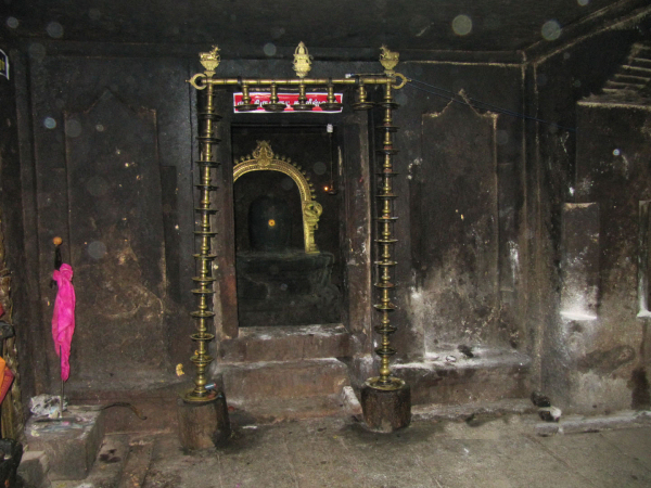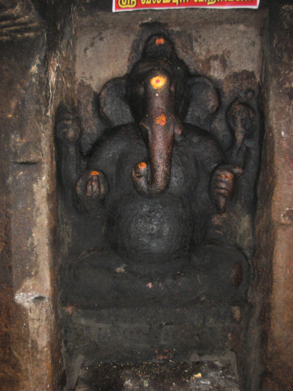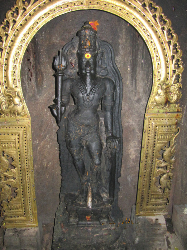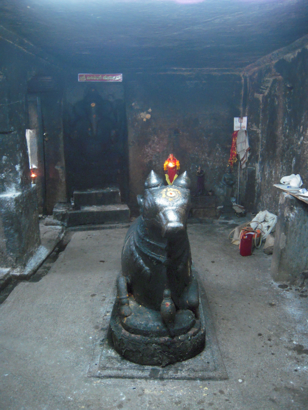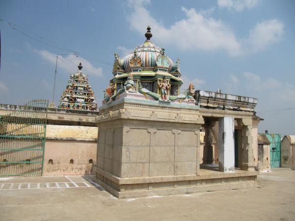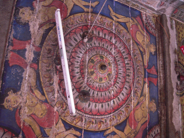 The Hillock and the Temple Tank The hillock houses two rock cut shrines; one on its southern precipice and the other one on its eastern precipice. The rock cut cave on the southern precipice is mandapa type while the eastern one is simply a cellar with rock cut extension in the front. There are also four other structural shrines in and around the southern rock cut cave which are all of later origin. At the apex of the hillock lies the Subrahmanya temple complex with a huge compound around it. Apart from it, to the east of the southern rock cut shrine a niche housing a rock cut Linga is seen. Another noted feature of the temple complex is the temple tank, lying between the two rock cut caves. It is a massive structure with steps on all its four sides leading to the pool inside, but at present it is half dry and muddled. The rock cut cave on the south houses the deity Okkaliswara, the inscription mentions the deity as Thiruvokalisvaramudaiya Nayanar and the name of the village as Kulamangalam.3 The eastern rock cut cave though anonymous at present, the inscription mentions the deity as Srivaramudaiya Nayanar,4 and the rock cut Linga in the niche is known as Malaikoluntheswarar. Both the rock cut shrines lack foundation inscription. Among the two the Okkaliswaram still receives good patronage in the surrounding. THE SUBRAHMANYA TEMPLE IN THE SUMMIT OF THE HILLOCK THE FRONTAGE OF THE SHRINE The Sri Okkaliswara shrine is a mandapa type cave scooped on the southern precipice of the hillock. It has a facade, a rectangular mukha mandapa facing south and the sanctum scooped on the eastern lateral wall of the mandapa facing west. In addition in front of the rock cut shrine it has a structural mandapa and around it an open pillared mandapa. SRI OKKALISWARA THE OPEN PILLARED MANDAPA The open pillared mandapa encompass the inner mandapa on the east, west and south. It has opening on the south and west with single row of pillars on the edges but on the east and southeast the wall raise along the pillars which creates a closed provision between the inner and the outer mandapa walls. Inside this closed provision on the mother rock a small niche housing a rock cut Linga is carved and known in the name ‘Malaikoluntheswarar’. The niche is 0.96mts height, 1.06mts width and 0.49mts depth. The avudaiyar of the Linga is square with 0.49mts width and 0.36mts breadth to a height of 0.12mts and the rudra bana is 0.29mts height. Apart from this in the closed provision the Navagraha, deities like Saniswara and Bhairava also seen. As like, on the western side also adjoining the mother rock a grill provision where Dakshinamoorthy and Chandeswara are kept. PAINTING ON THE CEILING OF THE MANDAPA MALAIKOLUNTHESWARAR THE INNER MANDAPA The open pillared mandapa leads to the inner mandapa which has wall on three sides leaving the north and entrance in the south. The wall has a upapitha and sectioned by pilasters and the vettu potika bearing the prastara components. The roofs of both the mandapas are covered with slabs and the ceiling of the outer mandapa is decorated with paintings. Window provisions are also shown in the eastern and western side of the mandapa. Inside, the mandapa is a pillared hall with two rows of pillars, three on each side. The pillars are decorated as three squares and kattu between them. The lower squares are adorned with nagabandhas. The potikas are vettu and taranga and holds the uttira, vajana and valabhi which bear the roof slabs covering the mandapa and also end adjoining the kapota of the rock cut cave. The rear pillars of the mandapa veil the pillars of the facade. The mandapa floor adjoins the rock cut floor extension of the facade and prastara of the mandapa partly inserted inside the kapota and the roof of the mandapa rests 0.35mts above the kapota. Three superstructures are shown above the roof of the mandapas; the middle one for Sri Okkaliswara, one for the deities in the eastern enclosure and one for the deities in the southern enclosure, which all are of late origin. THE FACADE The facade is raised to a height of 0.04-0.06mts range and extending 0.73mts in the north-south and 5.89mts in the east-west directions. It consists of two pillars in the middle and pilasters each one at the ends formed 0.04mts inside in the raised floor. The pillars and pilasters are sectioned as squares at the top and bottom and octagonal kattu in the middle. The lower square and the kattu are long comparing the upper square. The potikas are angular with taranga and plain patta. Five waves are shown for the angular section and three for the base, in which the intersecting taranga is extending as a contour scroll on face of the potika. The hands of the potikas extend to bear the uttira and the vajana buffer the roof and the uttira. The vajana also extends along the pilasters on both the sides and also the kapota extension.5 The rock cut extension in front of the faவூade is 0.79mts in the east, 0.82mts in the west and 0.92mts in the roof forming the side walls and kapota respectively. The kapota though lacks outer finishing it is well formed inside, its canopy is flat and the side walls are neatly framed to the level of kapota. The rock cut floor extension is partially done with stone slabs in the east. THE MUKHA MANDAPA THE MUKHA MANDAPA The facade leads to the mandapa which is 3.55mts in the north-south and 6.07 in east-west directions. The northern wall of the mandapa is sectioned into three divisions, Ganesa is shown on the western wall, sanctum is scooped on the eastern wall and a Nandi is placed in the centre. On the eastern side of the mandapa in front of the sanctum a platform to a height of 0.22mts made of stone slabs is extending between the hind wall and the facade to a length of 1.85mts towards west. The Nandi is placed above a rock cut oblong pitha facing the sanctum.6 A stone slab is placed above the rock cut pitha above which the Nandi is placed. A bird is seen pecking the dewlap of the na