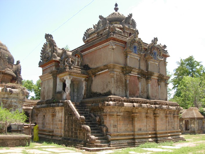 வெற்றுத்தளம் 2. 98 மீ. உயரமுள்ள வெற்றுத்தளம் தாமரைக்கட்டுத் தாங்குதளம், நான்முக அரைத்தூண்கள் தழுவிய சுவர், வெட்டுப் போதிகைகள் தாங்கும் கூரையுறுப்புகள் பெற்று, சிற்றுருவச் சிற்பங்களுடனான கூடுவளைவுகள் கொண்ட கபோதத்துடன் திகழ்கிறது. அச்சிற்பங்களுள் தென்புறமுள்ள சிவபெருமானின் ஆனந்தத் தாண்டவம் குறிப்பிடத்தக்கது. விரிசடையுடன் பின் கைகளில் உடுக்கையும் தீயகலும் கொண்டு இடக்காலையும் இட முன் கையையும் வீசி ஆடும் இறைவனின் வலக்கை காக்கும் குறிப்பில் உள்ளது. சோழர் கபோதக்கூடுகளில் இது போன்ற கண்கவர் சிற்பங்கள் இயல்புதான் என்றாலும் ஆடவல்லானின் இருப்பு சற்று அருமையான காட்சியே. ![]() ![]() தெற்கு, கிழக்கு, மேற்கு ஆகிய முத்திசைகளிலும் வெற்றுத்தளம் புறந்தள்ளிய இரண்டு சாலைப்பத்திகளைப் பெற்றுள்ளது. கோட்டங்களற்ற இப்பத்திகள் பல்லவர் காலச் சாலைப்பத்திகளை நினைவூட்டுகின்றன. வெற்றுத்தளத்தின் மேலமைந்துள்ள விமானத்தை அடைவதற்கான படிக்கட்டுகள் பதினைந்தும் பிடிச்சுவருடன் வடபுறத்தே அமைந்துள்ளன. கீழ்ப்படி சந்திரக்கல்லாக அமைய, பிடிச்சுவர் மேலிருந்து கீழாக உள்ள எட்டாம் படியருகே துளைக்கைச் சுருளாய்த் தாங்கலின் மேல் அமர்ந்துள்ளது. அத்தாங்கலின் கீழிருந்து தொடரும் மற்றொரு துளைக்கைப் பிடிச்சுவர் கீழ்ப்படிகளுக்கு அணைவாகிச் சந்திரக் கல்லின் இருபுறத்தும் உள்ள தாங்கல்களில் நிறைவடைகிறது. படிக்கட்டுகளின் முடிவிலுள்ள மேற்குப் பார்த்த வாயிலின் முன்னுள்ள முன்றில் கூரையை இரண்டு முச்சதுர, இருகட்டுத் தூண்கள் வெட்டுப் போதிகைகளுடன் தாங்குகின்றன. கூரையின் மேலுள்ள இரண்டு வளைவுகளில் வடக்குப் பார்த்த வளைவில் பிள்ளையாரும் மேற்குப் பார்த்த வளைவில் இறைவனும் இறைவியும் சுதையுருவங்களாக உள்ளனர். விமானம் வெற்றுத்தளத்தின் மீதமர்ந்துள்ள விமானம் ஒரே அளவாய் அமைந்த இரண்டு தளங்கள் பெற்றுள்ளது. இரண்டுமே செங்கல் கட்டுமானங்கள். 2. 87 மீ. பக்கமுடைய சதுரமாக அமைந்துள்ள கீழ்த்தளம் வேதிகை, நான்முக அரைத்தூண்கள் தழுவிய சுவர், கூரையுறுப்புகள் பெற்று, வடக்குத் தவிர்த்த முத்திசை களிலும் வெற்றுத்தளம் போலவே திசைக்கு இரண்டு புறந்தள்ளிய சாலைப்பத்திகள் பெற்றுள்ளது. கிழக்கில் இச்சாலைப்பத்திகளுக்கு இடைப்பட்ட சுவர்ப்பகுதி வலைச்சட்டம் பெற்ற திறப்பாக உள்ளது. இத்திறப்பின் பக்கநிலைகள் போல் காட்டப்பட்டுள்ள நான்முக அரைத்தூண்கள் மேலே உத்திரம், வாஜனம், கூரை, கபோதம் பெற்றுள்ளன. சாலைப் புறந்தள்ளல்கள் மூன்று திசைகளிலும் ஆரஉறுப்புகளாகப் பஞ்சரங்களைப் பெற்றுள்ளன. இப்பஞ்சரங்கள் இரண்டாம் தளச் சாலைப்பத்திகளை நிறைத்துள்ளன. முதல் தளம் போலவே அமைந்துள்ள இரண்ட