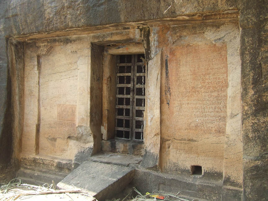 The rock cut cave on the southern precipice is mandapa type while the eastern one is simply a cellar with rock cut extension in the front. The rock cut cave on the south houses the deity Okkaliswara and the eastern rock cut cave though anonymous at present, the inscription mentions the deity as Srivaramudaiya Nayanar(1). Stone blocks are arranged to form a platform in front of the rock cut shrine to reach it. In the open space a nandi is placed facing the sanctum. ![]() THE HILLOCK WITH THE ROCK CUT CAVES The anterior wall of the shrine is 3.78mts width and has an adhishthana, bhitti and prastara. The adhishthana is padabandha type formed on either side and in the middle below the entrance two small rock cut steps are formed to reach the sanctum. But the adhishthana and the steps are partly inhumed by the stone blocks arranged in the front and on the south the components of jagati, octagonal kumuda, gala complex and pattika are visible. The rock cut steps are overlapped by a stone slab. The adhishthana itself is partly formed in which the kumuda remain incomplete, upari kampa is absent and the pada is shown only for the corner pilasters in the gala complex. Above the adhishthana raises the wall sectioned by four pilasters with the components of square, kattu, square and the octagonal kattu is long comparing the squares. The middle pilasters are damaged at their base and a stroke is shown on the face of the northern corner pilaster and the middle southern pilaster. ![]() THE SRIVARAMUDAIYAR ROCKCUT CAVE ![]() THE ANTERIOR WALL OF THE ROCK CUT CAVE WITH INSCRIPTIONS The aperture to the sanctum is formed between the middle pilasters to a height of 1.84mts and 0.88mts width. Jambs, lintel and sill are arranged above the rock cut entrance. Jambs and lintel are ornamented as lotus petals in the ridges. On either side of the entrance spaces are formed between the pilasters. The potikas that rest above the pilasters are angular and taranga with patta and the intersecting taranga is extended as a contour scroll on the face of the potika. The single limbs of the potikas extend inside forming a vaulted space and bear the uttira above. The vajana buffer the roof and the wall. The spaces on either side are 1.92mts height to a width of 0.90mts in the south and 0.93mts in the north and to a depth of 0.09mts. Inscriptions are inscribed over the walls of the niches.2 The mother rock extension in front is 0.55mts in the south, 0.27mts in the north and in the roof the extension range between 0.36mts-0.59mts. The roof extension forms the kapota of the sanctum in which the canopy is well formed. ![]() THE OCTAGONAL LINGA The cubical shrine cell is 3.26mts in the north-south and 3.22mts in the east-west directions and the height is 1.96mts. The sanctum houses rock cut Linga in the center. The avudaiyar is octagonal with a circumference of 4.75mts and the height is .66mts. It is shown as a padabandha adhishthana with the components of jagati, rudra kumuda, kantha flanked by kampa on both side and pattika. The gomukha is facing north and a rampant yazhi is shown bearing it.3 But the yazhi formation is only on the east face, it is absent in the west face. The rock cut bana is 0.67mts height. The pit below the gomukha is being closed and a small hole is tunneled on the northern side of the anterior wall as an outlet. A rock cut Linga is carved inside a niche in a rock boulder that lies in front of the shrine. The niche is 0.58mts height and 0.75mts width and housing the Linga which is 0.43mts height. To the north of the rock cut cave on the eastern face of the mother rock a niche is seen to a height of 1.27mts, width of 0.99mts and a depth of 0.60mts. ![]() PARIVADINI Both the northern and the southern spaces4 are adorned with inscriptions. The inscriptions on the southern space is published under No.4 in IPS, has three sections in it. The first part is the grantha inscription ‘Parivadini-da’5 inscribed inside a rectangular frame.6 Besides, two other Tamil inscriptions linked to the above said grantha inscription is found below.7 The term ‘Parivadini-da’ in same style and script also found at three other places viz., Thirumerrali rock-cut cave of Kudumiyanmalai, Sathyagiriswara and Thirumeyyam upper rock-cut cave. In addition Kudumiyanmalai also possess musical notations and the same has been deleted in Thirumeyyam to which its traces are found on the mother rock in Sathyagiriswara complex. These three places are contiguous to each other and it is understood that this tract must be great centers of teaching and learning Music. The inscription on the northern niche belongs to the 3rd regnal year of Jatavarma Kulasekara Pandya which begins with his prasasti ‘Puvin kizhathi’. It speaks about the cancellation of tax dues like antarayam, vari, kadamai to the devadana lands of Sri Varamudayanayanar by one Kalvayil Nadalvan. It mentions the deity as Sri Varamudayanayanar in Kananadu under Virudhurajabayangara valanadu alais Kanadu. Footnotes : 1. Field study on 19-02-10, 13-06-10. 2. சு.இராசவேலு, அ.கி.சேஷாத்திரி, தமிழ்நாட்டுக் குடைவரைக் கோயில்கள், (Cave Temples of Tamil Nadu) பண்பாட்டு வெளியீட்டகம், சென்னை 2000. 'வடகோட்டத்தில் பல்லவ கிரந்தத்தில் அழகிய கல்வெட்டு ஒன்று காணப்படுகிறது. இதையடுத்து பெண் ஒருத்தியின் புடைப்புச்சிற்பம் முற்று பெறாத நிலையில் காணப்படுகிறது'. P.147. The Grantha inscription is on the southern niche and the traces of bas-relief sculpture of woman is found nowhere. 3. Soundara Rajan, K.V., Rock-cut Temple Styles : Early Pandya Art and The Ellora Shrines, mentioned