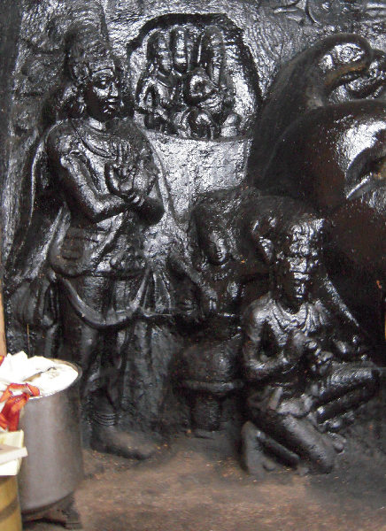 The sanctum is concaved and is 8.94mts in the east-west direction. The curvature starts at 1.90mts inside from the facade where Vishnu is reclining on Aadhisesha adjoining the back wall11 and the concaved wall is adorned with bas-relief figures portraying the Puranic theme.[12] The reclining Vishnu and Aadhisesha covers the mid portion of the sanctum.[13] The panel can be broadly divided into two; the figures in the upper stratum and the figures in the lower stratum. The figures of lower stratum can be divided into three parts viz., Aadhisesha with reclining Vishnu occupying the mid region, the figures to their west and the figures to their east. The panel in the upper echelon can be divided into three parts the figures on the western wall, eastern wall and the northern wall. In the northern wall Brahma occupies the mid region and it can be further divided as, to the east of Brahma and to the west of Brahma. The Thirumeyyam Pallikondaperumal can be classified as uttama class of depiction.[14] Sculptures in the Lower Stratum ![]() Aadhisesha and the Reclining Vishnu [15] An undulating surface[16] is shown in the middle leaving a portion on western side but extending upto the end of the sanctum wall on the east. The rippled body of Aadhisesha forms an elliptical couch above the undulating surface[17] and its raised head spread like an awning in the west. Among the five heads of Aadhisesha two are carved out as bas-relief in the northern wall and the remaining three are free standing. He looks furious with his eyes and mouth wide open exposing sharp teeth. The sacred literary tradition describes him as white complexioned, thousand headed, finely dotted indicating him a superior breed, king of snakes and capable of spitting fire.[18] Vishnu is reclining on the rug that spread above the couch. The deity is lying straight facing up with his left leg stretched straight but the right leg turned towards Aadhisesha. His left hand stretching to His left is raised upward at the elbow and showing kataka mudra19 whereas the right hand is fully stretched upward and the palm is touching the Adisesha.20 He is richly adorned with stone studded ornaments. He is clad in pattadai which is held by the pearl and stone studded waist belt. Kiritamakuta adorns His head and makarakundalas, flower studs, bangles, armlets, shoulder ornaments, udarabandha, charapali, anklets and rings are the other ornaments adorn by him. The yajnopavita is shown spreading on the couch. Srivatsa mole is shown in the right chest.21 Fire flames are shown on the northern wall of the sanctum above Vishnu.22 It is said that the ferocious Aadhisesha spit fire on the ogres Madhu and Kaithaba.23 Figures to the West of Vishnu There are six figures to the west of Aadhisesha and Vishnu and it starts with Garuda, little above Garuda is seen a niche with three figures seated inside. Adjoining Aadhisesha in the front is Markandeya and behind him is a male figure. Garuda In the lower echelon the panel starts with Garuda24 who is standing in sama with folded wings. He is partially standing on the western and northern wall. His locks are arranged as jatamakuta and few untied locks form a thick pad in the lower head. Patrakundalas, kandigai, charapali, bangles, coiled armlets and head patta are the ornaments worn by him. His lower garment is draping upto his calf which is fastened by a waist belt and its excess girdles tied as a flower knot in the center and dangling in the front. The slackly worn idaikattu has heavy knots flanking on his sides. Hands are kept crossed over his chest, while his left hand is showing darjani, his right hand rests on the chest in kataka. Thick yajnopavita is worn in upavita fashion. He is shown with sharp fangs and spewed out eyes. Figures in the Niche Three figures inside a niche are seen on the northern wall between Aadhisesha and Garuda. The niche is not a proper formation it is simply a hollow in which two seated figures are shown in the front and in between and behind them is the third one, to him only the head is visible. The front two figures are seated in cross legs and among them; the first one is an elderly sage with pot belly, beard and his locks arranged as jatamakuta, beaded mala and bangles adorn him. His hands are near his chest in kataka mudra and his slight grin reveals his excitement at the sight of the deity. The male figure next to the sage looks young with his locks decorated as Karanda makuta and decked with ornaments like kundalas, bangles and kandigai. His right hand is on his right knee and his left hand is in kataka. Both the front figures are wearing lower garment upto their ankle and their vastra yajnopavita is worn in upavita fashion. The third figure is visible only upto his neck and he is adorned with kiritamakuta. Among the three the beard figure looks aged and the other two are young and might be his disciples. Male Figure In between Markandeya and Garuda a male figure is seen behind the Aadhisesha. He is visible upto his waist.25 His left hand is eulogizing the deity whereas his right hand is in kataka holding the stalk of a lotus bud which is resting on his right shoulder. His locks are arranged as jatamakuta and also adorned with ornaments like udarabandha, charapali, coiled armlets, bangles and patrakundalas in elongated ears. Vastra yajnopavita is worn in upavita fashion. He is believed as Yama in the locality.[26] Markandeya Markandeya[27] is seated in garudasana adjoining the Aadhisesha with his hands in kataka near his chest one above the other in which the left hand is holding an object might be flower. His locks are arranged as jatamakuta, ears are elongated without kundalas and his lower garment is draping upto his ankle and his lower wear is fastened by hip belt in which the excess girdle is formed as heavy bow knot and dangle in the front. The vastra yajnopavita worn in upavitha fashion is formed a knot in the left shoulder. Charapali adorns his neck. Footnotes : 11. ibid., R.