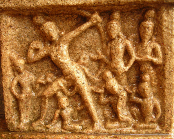 Upon reaching the royal household, Sage Sadananda, the son of Ahalya by Sage Gautama, who also happens to be the royal priest (Raja Guru) of the kingdom, receives them and reports to King Janaka. Janaka enquires upon the sage and the princes and shares his anxiety in finding a suitable bridegroom for Seetha, his only daughter. The cause of his concern is the celestial bow of Shiva, kept in his custody. Seetha was able to move this mighty bow at a young age with her divine powers; so her would be husband should be strong enough to at least lift the bow once and shoot an arrow. Unfortunately none of the princes who showed up in the past were able to move the bow – leave alone lifting it. Viswamitra consoles the King and suggests that Rama, the son of Dasaratha of Ayodhya might stand up to the challenge. Upon his instructions, Rama lifts the bow, tries to shoot an arrow and in the process of doing so, breaks it. The entire court and household of Janaka is overjoyed to see this development and soon a royal union ensues. At Kumbakonam, the panel (No.12) located next to Ahalya episode is worn out beyond recognition. Only few characters are vaguely visible and it is not possible to identify the event portrayed. The following panel (No.13) proceeds further down the storyline of Ramayana and depicts Rama leaving Ayodhya to take up the exile in the forest. This suggests that the events associated with Rama’s marriage are implied but not explicitly sculpted at Kumbakonam. On the other hand, the meeting between Viswamitra and Janaka and the subsequent events that follow are captured in great detail at Pullamangai. Since this is the first significant deviation observed in storyline between the two narratives, it will be worthwhile to discuss them in some detail. A cursory analysis of the Ramayana storyline represented in various early Chola temples suggests that they differ significantly from one another in terms of how they embody the main storyline, what events, themes and characters they project, when and where such projections occur etc. Considering that all of these narratives were sculpted more or less around the same time frame [first half of 10th Century AD], one is left to wonder at the ingenuity of Chola artisans and the cultural setting that stimulated such distinctive elucidations. Henceforth, this series will closely follow the Pullamangai panels for some time until Rama takes up his exile. Pullamangai Panel No.16 – The court of King Janaka King Janaka is seated in a royal chair, in a posture that can be placed between Utkutiasana and Sukhasana. Lack of definite posture suggests his unrest. He is wearing a Makuta and adorned with Necklaces. His left elbow is resting on his knee. His hands are raised in Padaka, indicating an active and engaging conversation with Sage Viswamitra, seated by his side. The substantial raise in hands combined with indefinite body posture suggests an anxious temperament. Obviously, the topic of conversation is finding a suitable alliance for his only daughter. ![]() Meeting with Janaka Two Chauri bearers are seen on either sides of the king, at a distance. Janaka’s concerns are readily addressed by Sage Viswamitra, seated at ease in Utkudiasana, in a chair equal to that of the King. His left hand is held in Padaka, in a gesture that indicates support and solace. His right hand, firmly held in his thigh, signifies confidence and composure. The Sage is comforting the King and suggesting that Rama, the valiant son of King Dasaratha – might stand up to the celestial challenge. Rama and Lakshmana are seated to the left of Viswamitra, in a slightly lower level chair. This chair is distinctive and is supported by several legs – three of which are visible. Small bedding is laid over the surface of the chair. The youths are seated with legs folded - as a mark of respect to the elders. Their bent heads suggest humility and modesty. Portions of their body are worn out. A male figure is seated to the right of King Janaka on the floor, at a distance. His headdress is distinctive. He is also participating in the conversation (as suggested by his raised right hand). It is difficult to identify this figure with Sage Sadananda, who was held in high esteem by the King and the rest. The relevance of this unidentifiable character in this panel is not understood at present. Composition Overall there are seven characters in this panel. The dominant characters are Janaka and Viswamitra; the pivotal point being the conversation between the two. By dedicating one complete half of the panel to Janaka, the sculptor underscores his significance. Only one other Chola Ramayana panel [at Tiruchennampoondi] highlights Janaka in such importance. Janaka’s anxious mood is compensated by the casual and relieving gesture of Viswamitra who reassures that Rama might answer the problem at hand. By seating him at a level equal to that of the King, the sculptor indicates the high reverence in which sages were held in ancient times. It may be remembered that Viswamitra was seated in equal terms with Dasaratha as well, in an earlier occasion. By sculpting Rama in significant proportions to that of the King and the Sage, the sculptors emphasize the importance of the character. Pullamangai Panel No.17 – Rama breaks the bow This is one of the striking events in the story of Rama. Having been challenged with the task of lifting Shiva’s bow, Rama effortlessly takes the bow in one hand, tries to shoot an arrow and breaks it in the process of attempting to doing so. ![]() Rama breaks the bow Kambar provides a picturesque version of this incident in a famous phrase: “Even those spectators who did not close their eyelids for the fear of losing the victorious moment, managed to catch only a glimpse of Rama lifting the bow; they did not see Rama keeping his feet at the end of the bow; they did not see him tying the bowstring; all that they heard {the very next moment} was the thunderous sound of