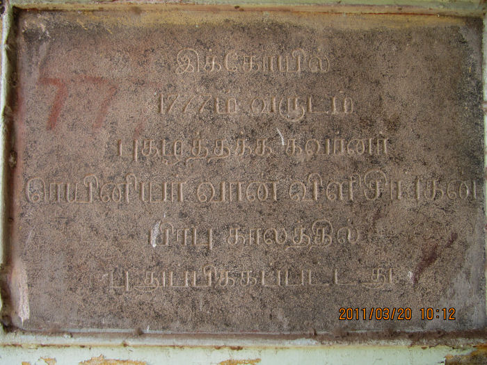 முன்றிலின் தென்சுவரில் உள்ள தமிழ்க் கல்வெட்டு 1777ல் ஆளுநர் ரெயினியர் வான்விளி சிங்கன் பிரபு காலத்தில் இந்தக் கோயில் புதுப்பிக்கப்பட்டதாகக் கூறுகிறது. அதே செய்தியைக் கூறும் ஆங்கிலக் கல்வெட்டு வடசுவரிலும் டச்சு மொழிக் கல்வெட்டு வடக்கு மதில் சுவரிலும் உள்ளன.