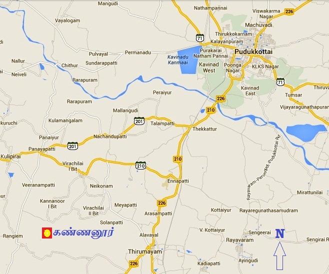 புதுக்கோட்டையிலிருந்து தென்மேற்கில் 26 வது கி.மீ தொலைவில் திருமயம் தாலுக்கவில் அமைந்துள்ளது. இத்திருக்கோயில் இந்திய தொல்பொருள் ஆய்வு (ASI) நிறுவனத்தின் பராமரிப்பில் இருப்பதால் நல்ல நிலையில் உள்ளது. ![]() கண்ணனூர் அமைவிடம். Courtesy:GoogleMaps ![]() கண்ணனூர் அமைவிடம். Courtesy:GoogleMaps ![]() கண்ணனூர் அமைவிடம். Courtesy :Google Earth திருக்கோயில் அமைப்பு பாலசுப்பிரமணியசுவாமி திருக்கோயில், விமானம், முகமண்டபம், அந்தராளம், மகாமண்டபம் என்ற அமைப்பில் அமைந்துள்ளது உபானம் (இருந்திருக்கவேண்டும்-மண்ணில் புதைந்திருப்பதால் காண இயலவில்லை), ஜகதி (பாதி மண்ணில் புதைந்துள்ளது,) எண்பட்டைக் குமுதம், பாதங்களுடன் கூடிய கண்டப்பகுதி மற்றும் பட்டிகையுடன் கூடிய பாதபந்த தாங்குதளம் கொண்ட ஒரு தள வேசர விமானம். ![]() கண்ணனூர் திருக்கோயில் - தென்புறம் சுவர் நான்முக அரைத்தூண்களுடன் அமைய தூண்களின் எளிய விரிகோணப் போதிகைகள் உத்திரம் தாங்குகின்றன அரைத்தூண்கள் கலசம்,கும்பம் பாலிகை பெற்று உரிய உறுப்புகளோடு அமைந்துள்ளன விமானத்தின் சுவர்பகுதியில் மூன்று பக்கங்களிலும் மத்தியில் கோட்டங்கள் காட்டப்பட்டாலும் தென்பகுதியில் மட்டுமே தட்சிணாமூர்த்தி இடம்பெற்றுள்ளார். கருவறைப்பகுதியில் கோட்டங்கள் காட்டப்பட்டாலும் கருவறை மற்றும் முகமண்டபம் பத்திப்பிரிப்பின்மை பெற்றே அமைந்துள்ளது. போதிகைகள் தாங்கும் உத்தரத்திற்கு மேல் வாஜனமும் அதற்குமேல் வலபியும் கூரையும் அமைந்துள்ளன. வலபிப்பகுதியில் பூதவரி காட்டப்பட்டுள்ளது. கூரைப்பகுதியின் முன்னிழுப்பு கபோதமாக செதுக்கப்பட்டு இடையிடையே கூடுகள் கொண்டு அமைந்துள்ளது. கபோதத்திற்கும் பூதவரிக்குமான இடைவெளி மிகவும் குறைவாக உள்ளது. இதன் ஓரப்பகுதியில் கொடிக்கருக்குகள் காட்டப்படுகின்றன கொடிக்கருக்குகளுக்கு கீழும் கபோதக்கூடுகளுக்கு இடதும் வலதும் தொடர்ந்து சந்திரமண்டலம் காட்டப்பட்டுள்ளது. ![]() கண்ணனூர் திருக்கோயில் - வடபுறம் கருவறைக் கோட்ட அணைவுத்தூண்கள் துணைக்கம்பிலிருந்து நான்முக அரைத்தூண்களாக எழுகின்றன.. இவை அளவில் சுவர் தூண்களை விட சற்று சிறியனவாக உள்ளன. இக்கோட்டங்களில் தெற்கு கோட்டம் தவிர்த்து ஏனைய கோட்டங்களில் சிற்பங்கள் இல்லை. கோட்டங்களின் மேலே மகரதோரணங்கள் மூன்றுபுறமும் உருவாக்க முயற்சி செய்யப்பட்டு சிற்பங்கள் பெறாமல் காட்டப்பட்டுள்ளன. கருவறைக் கட்டுமானத்தின் கபோதத்தில் மூன்று பக்கத்திலும் பக்கத்திற்கு நான்கு கபோதக்கூடுகள் உள்ளன., கூரைக்கு மேலே பூமிதேசமும் அதற்கு சற்று உள்ளடங்கிய நிலையில் கூரையின் மேற்பரப்பில் நான்கு மூலைகளிலும் நின்ற நிலையில் யானைச்சிற்பங்களும் காட்டப்பட்டுள்ளன. இவ்வானைச்சிற்பங்களை இவ்வி