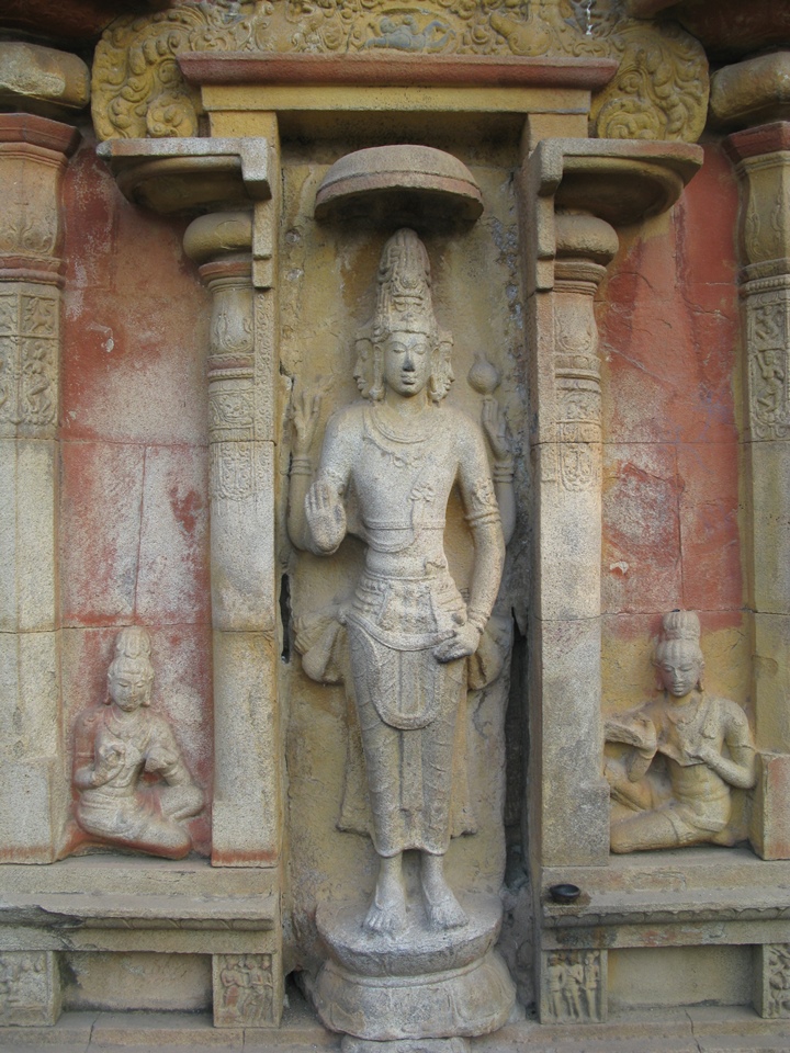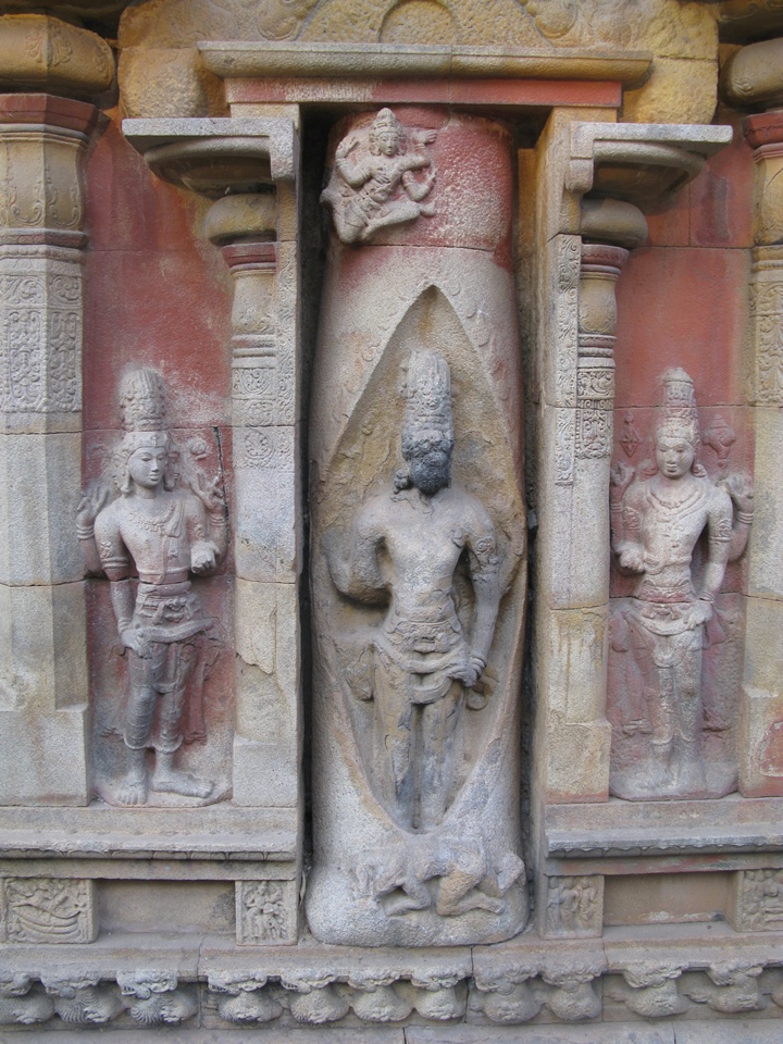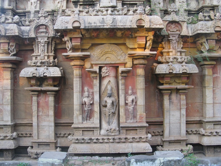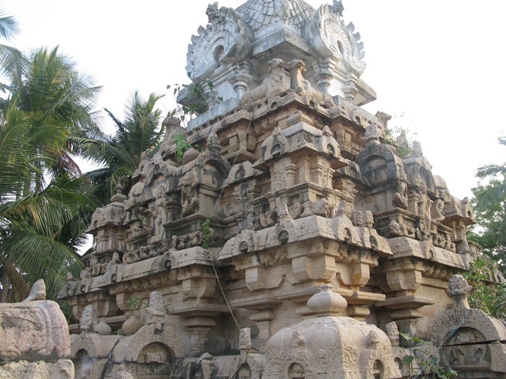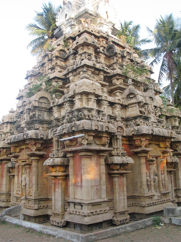 விமானம் கிழக்கு நோக்கி அமைந்துள்ள இக்கோயிலின் முத்தள விமானம் தூய நாகர வகையைச் சேர்ந்ததாகும். விமானம் கர்ணபத்தி - சாலைப்பத்தி - கர்ணபத்தி என்று பிரிக்கப்பட்டுள்ளது. இப்பத்திகள் அனைத்தும் பிதுக்கமாக அமைய, இரண்டு பத்திகளுக்கு இடைப்பட்ட பகுதிகள் ஒடுக்கமாகத் தரைத்தளத்தில் பஞ்சரத்தைக் கொண்டு அமைந்துள்ளன. ![]() தென்மேற்கு மூலையிலிருந்து விமானம் தாங்குதளம் கபோதபந்தத் தாங்குதளத்தைக் கொண்டுள்ள இவ்விமானத்தின் தாங்குதளம், தரையில் உபஉபானத்திலிருந்து துவங்குகிறது. தெற்கிலும் மேற்கிலும் இவ்வுபஉபானம் தரைக்கு வெளியில் தெரியவில்லை. அதற்குமேல் உபானம் அமைந்துள்ளது. உபானத்திற்கு மேல் ஜகதி, உருள்குமுதம் அமைய, கண்டப்பகுதியானது மேலும் கீழும் அணைக்கப்பட்ட கம்புகளுடன் கண்டபாதங்களில் சிற்றுருவச் சிற்பங்களைக்கொண்டு அமைந்துள்ளது. அதன்மேல் சந்திரமண்டலத்துடனும் முனைகளில் கொடிக்கருக்குகளுடனும் கூடிய கபோதமும் பூமிதேசமும் அமைந்துள்ளன. வேதிகைத்தொகுதி பிதுக்க ஒடுக்கங்களில் வேறுபாடின்றி மேலும் கீழும் கம்புகளுடன் கூடிய வேதிகண்டம் மற்றும் வேதிகையைப் பெற்றுள்ளது. இவ்வேதிகையிலும் வேதிபாதங்களில் சிற்றுருவச் சிற்பங்கள் இடம்பெற்றுள்ளன. பஞ்சரங்கள் பிதுக்கமாக அமைந்துள்ள இரு பத்திகளுக்கு இடைப்பட்ட ஒடுக்கங்களில் உபானத்திற்கு மேலிருந்து பத்மஜகதி, உருள்குமுதம், பிரதிவரி என்றமைந்த பிரதிபந்தத் தாங்குதளத்தையும், அதற்குமேல் வேதிகைத்தொகுதி, நான்முக அணைவுத்தூண்களைப் பெற்ற சிற்பங்களற்ற சுவர், கூரை உறுப்புகள், ஆடல் மகளிர் அல்லது அடியவர்களைப் பெற்ற கிரீவம் ஆகியவற்றைப் பெற்று, கபோதத்திலுள்ள நாசிகையில் முடிகிறது. இவற்றை ஒரு தனி விமானம் என்று சொல்ல முடியாதவாறு ஒரு விமானத்திற்கு வேண்டிய சிகரமும் ஸ்தூபியும் கபோதத்தின் நாசிகையால் நிரப்பப்பட்டுள்ளன. சுவர் தரைத்தளத்தின் கர்ணபத்திகள் கோட்டங்களோ இறைத்திருமேனிகளோ இல்லாமல் வெறுமையாக இருக்க, சாலைப்பத்திகள் அனைத்தும் கோட்டங்களைப் பெற்று, அவற்றில் தெற்கில் பிற்காலத்தில் அமைக்கப்பட்ட ஆலமர் அண்ணல், மேற்கில் லிங்கோத்பவர், வடக்கில் நான்முகன் சிற்பங்கள் இடம்பெற்றுள்ளன. இக்கோட்டங்கள் உருள்வடிவ அரைத்தூண்களாலும், சாலைப்பத்திகள் எண்முக அரைத்தூண்களாலும், கர்ணப்பத்திகள் நான்முக அரைத்தூண்களாலும் அணைக்கப்பட்டுள்ளன. சாலைப்பத்தியின் கோட்டம் தவிர்த்த பகுதிகளில் அவ்வவ்விறைத் திருமேனிகளின் தொடர்புடைய சிற்பங்கள் வடிக்கப்பட்டுள்ளன. ஆலமர் அண்ணலின் இருபுறமும் காட்டு விலங்குகள் மற்றும் அடியவர்கள், லிங்கோத்பவரின் இடதுபுறம் திருமால் மற்றும் வலதுபுறம் நான்முகன், வடக்கிலு
