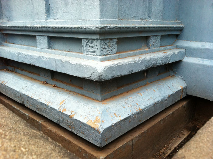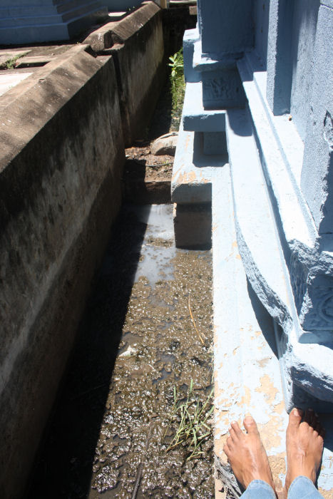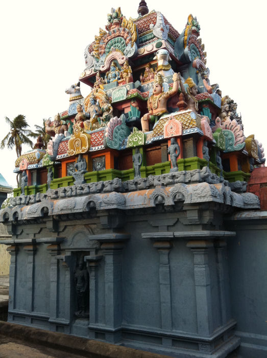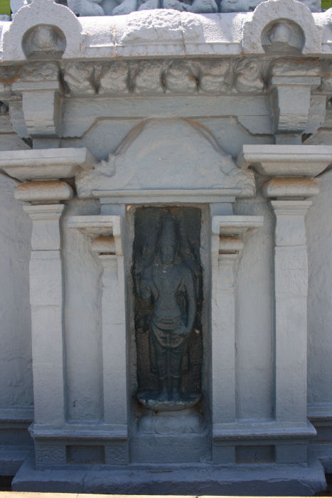இவ்வூர் பற்றிக் குறிப்பிடும் கல்வெட்டுக்களுள் காலத்தால் முற்பட்டது முத்தரைய மன்னரான சுவரன் மாறனின் கல்வெட்டாகும். இம்மன்னரின் சாதனைகளை விளக்கும் கல்வெட்டு நியமத்தில் பிடாரிக்கு இவர் அமைத்த மஹாகாளத்துப் பிடாரியார் எனும் கோயில் பற்றியும் பேசுகிறது. காலமாற்றத்தில் இத்திருக்கோயில் அழிந்துவிட இக்கல்வெட்டு பொறிக்கப்பட்ட அக்கோயிலின் தூண்கள் மட்டும் செந்தலை சுந்தரேஸ்வரர் திருக்கோயிலுக்கு எவ்வாறோ இடம் பெயர்ந்துள்ளன. தற்போது நியமத்தில் காணப்படும் ஒரே பழமையான திருக்கோயில் ஐராவதேஸ்வரர் திருக்கோயிலாகும். இத்திருக்கோயிலில் தற்போது முத்தரையர் கல்வெட்டுக்கள் ஒன்றுகூடக் காணக் கிடைக்கவில்லை. கிடைக்கும் கல்வெட்டுக்களுள் பழமையானது முற்சோழ மன்னரான முதலாம் ஆதித்தரின் கல்வெட்டாகும் (பொது நூற்றாண்டு 9). இத்திருக்கோயிலின் கட்டுமானம் மற்றும் கல்வெட்டுக்களை இக்கட்டுரை ஆராய்கிறது. கட்டுமானக் கூறுகள் வெளி மண்டபம், கோபுரம், உள்மண்டபம், முகமண்டபம், உபதிருமுன்கள் என்று பல பிற்காலக் கட்டுமானங்களைக் கொண்டமைந்துள்ள கோயில் வளாகத்தில் இறைவன் கருவறையை உள்ளடக்கிய விமானம் மட்டுமே தொன்மையான கட்டுமானமாக உள்ளது. கிழக்குப் பார்வையாக அமைந்துள்ள இவ்விமானம் இரு தள தூய நாகர வகையினதாகும். ![]() விமானம் - மேற்குப்புறம் விமானத் தாங்குதளம் உபானம், ஜகதி, எண்பட்டைக் குமுதம், கம்புகள் தழுவிய கண்டத் தொகுதி, பட்டிகை உள்ளிட்ட உறுப்புக்களுடன் பாதபந்த வகையினதாக அமைக்கப்பட்டுள்ளது. இவ்வுறுப்புக்களுள் உபானம் பல இடங்களில் மண்ணில் புதைந்துள்ளது. ![]() தாங்குதளம் மற்றும் வேதிகைத் தொகுதியும் குறுஞ்சிற்பங்களும் தாங்குதளத்திற்கு மேல் வேதிகைத்தொகுதி அமைந்துள்ளது. இத்தொகுதியில் பாதங்களுடன் கூடிய வேதிக்கண்டம், எழுச்சி பெற்ற தாமரை இதழ்களுடன் அமைந்த ஊர்த்துவ பத்மவரி மற்றும் கம்பு காணக்கிடைக்கின்றன. தாங்குதளக் கண்டத்தையும் வேதிக்கண்டத்தையும் ஊடறுத்துச் செல்லும் அரைத்தூண் பாதங்களில் சிற்றுருவச் சிற்பங்கள் செதுக்கப்பட்டுள்ளன. வேதிகைக்கு மேல் எழும் ஆதிதளச் சுவர் முன்று பகுதிகளாக பத்திப்பிரிப்புக்கு ஆட்பட்டுள்ளது. இவற்றுள் சாலைப்பத்தி மட்டும் தாய்ச்சுவரிலிருந்து சிறிதளவு பிதுக்கம் பெற்றுள்ளது. இச்சாலைப்பத்தியில் ஆழமான அகழ்வு பெறாமல் தேவக்கோட்டங்கள் அமைக்கப்பட்டுள்ளன. கர்ண-சாலைப் பத்திகளுக்கிடையே அமைந்துள்ள தாய்ச்சுவர் பஞ்சரம் முதலான அலங்கார உறுப்புக்கள் பெறாமல் வெறுமையாக அமைந்துள்ளது. மூன்று பத்திகளும் சம உயரத்தில் அமைந்த பிரம்மகாந்த அரைத்தூண்களின் அணைப்பைப் பெற்றுள்ளன. எளிமையான அலங்காரங்களுடன் அமைந்துள்ள 