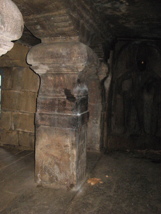 The structural mandapas in front of the rock cut cave are in a raised level and to reach it two way steps are arranged in its front with a flat resting in the middle. Stone blocks are arranged to form the walls of both the mandapas which possess only the adhishthana feature, lacking other wall segmentation and finished with cement roofing. The wall enclosure ends adjoining the mother rock on both sides. An inscription on the basement of the mandapa outer wall near the steps reveals that it was endowed by Raghunatharaya Thondaiman.10 Chola period fragment inscriptions and a beautiful dancing Siva miniature are seen on the southern wall of the outer mandapa.
