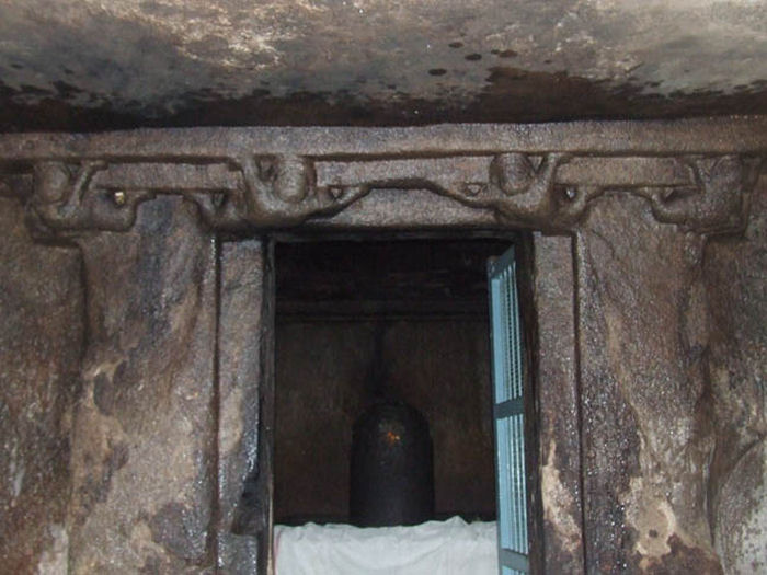 The sanctum is a cubical cell with 3.75mts in east-west and 4.07mts in north-south directions. The height of the sanctum is 2.49mts. The sanctum houses Lord Siva in the form of rock cut linga.18 The avudaiyar is exact square with 1.55mts in length and breadth and to a height of 0.79mts. It is formed as a padabandha adhishthana with the features of jagati, rudra kumuda, kantha with pada and flanked by kampa, pattika and upari kampa. The rock cut rudra bana is 0.75mts height. The gomukha is seen on the northern side of the avudaiyar to the extension of 0.30mts with a spout like formation under it starting from the jagati component extending upto the mouth of the gomukha. The water pit is 0.18 x 0.33mts under the gomukha is closed and the water outlet is shown running along the northern wall of the sanctum, but at present it is closed by a piece of stone slab. On the southern side of the avudaiyar a small rock cut pita up to the height of kampa is shown. Among the prastara components uttira is absent instead double vajana as seen in the mandapa is also seen in the sanctum.