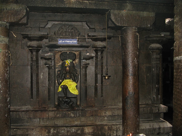 விமானத்தின் தென்புறச் சாலைப்பத்தியின் கோட்டத்தில் ஆலமரத்தின் அடியில் வீராசனத்தில் அமர்ந்திருக்கும் நிலையில் அண்ணலின் சிற்பம் வடிக்கப்பட்டுள்ளது. சடைமுடியுடன் தலையில் பிறையையும் நெற்றிக்கண்ணையும் கொண்டுள்ள இவரது செவிகளை வலப்புறம் மகரகுண்டலமும் இடப்புறம் பனையோலைக்குண்டலமும் அலங்கரிக்கின்றன. கழுத்தில் சரப்பளியையும் முத்துமாலையையும் பெற்றுள்ள இவரது வஸ்திர முப்புரிநூல் உபவீதமாக அமைந்துள்ளது. உதரபந்தமும் இடைக்கட்டும் பெற்றுள்ளார். இவரது வலமுன்கை சின்முத்திரையில் அமைந்து வலப்பின்கை அக்கமாலையைப் பெற்றுள்ளது. இடது கைகள் கடக முத்திரையில் இருக்க, முன்கையில் ஓலைச்சுவடியும் பின்கையில் பாம்பும் இடம்பெற்றுள்ளன. இரு கால்களிலும் காற்சலங்கைகள் இருக்க, வலதுகால் முயலகன் மேல் இருத்தப்பட்டுள்ளது.