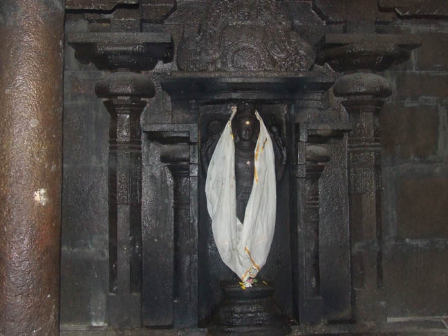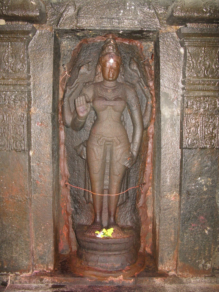 முகமண்டபத்தின் வடபுறச் சுவரில் உள்ள கோட்டத்தில் முன்புறம் பதக்கத்துடன் கூடிய சடைமகுடத்தையும் நெற்றிக்கண்ணையும் கொண்ட கொற்றவையின் சிற்பம் வடிக்கப்பட்டுள்ளது. இக்கோட்டத்தின் மேலுள்ள மகரதோரணத்திற்கு இருபுறமும் கவரியும் குடையும் காட்டப்பட்டுள்ளன. இவரது இரு செவிகளையும் பூட்டுக்குண்டலங்களும் செவிப்பூக்களும் அலங்கரிக்கின்றன. கழுத்தில் சரப்பளியையும் மார்பில் கச்சையும் வீரசங்கிலியையும் கொண்டுள்ளார். வலமுன்கை காக்கும் குறிப்பிலும் பின்கை எறிநிலைச் சக்கரத்தைக் கொண்டும் இடமுன்கை கடியவலம்பிதத்திலும் பின்கை சங்கைக் கொண்டும் அமைந்துள்ளன. இடையில் இடைக்கட்டும் சிற்றாடையும் இடம்பெற்றுள்ளன. தாமரைப்பீடத்தின்மீது இருத்தப்பட்டுள்ள இவரது கால்கள் சமத்தில் உள்ளன.