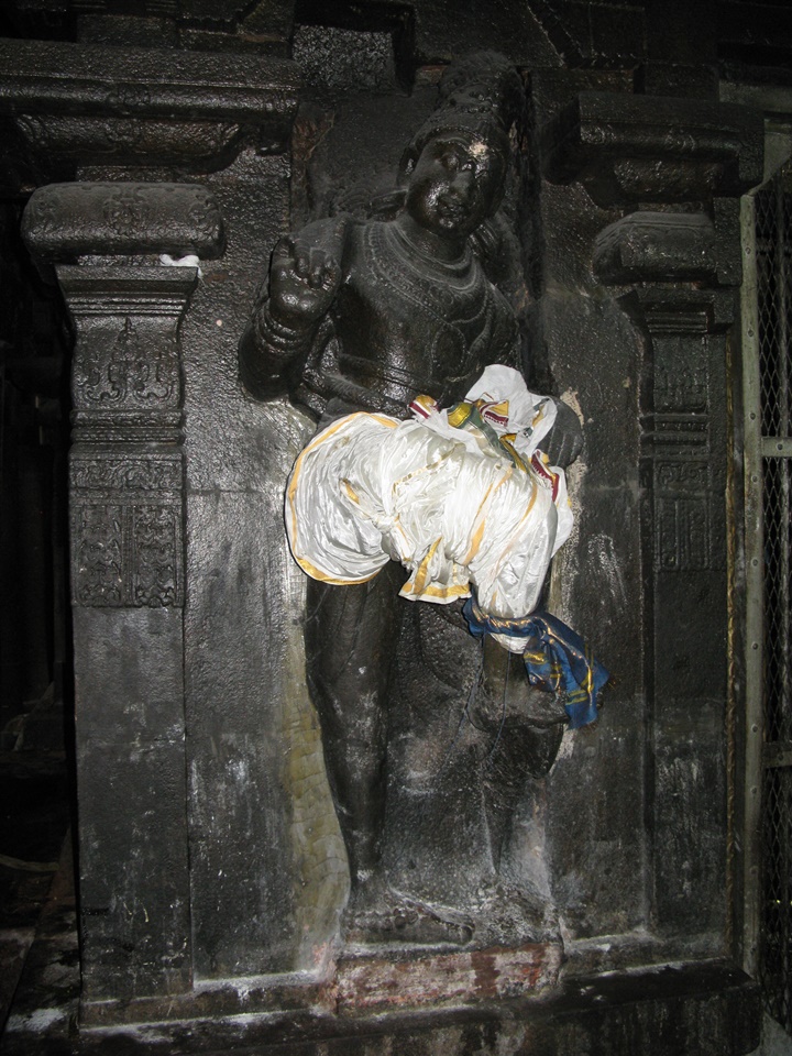 முகமண்டப வாயிலுக்கு தென்புறம் அமைந்துள்ள வாயிற்காவலர் கருவறையை நோக்கி வலப்புறமாக ஒருக்களித்து நின்று சடைமகுடத்தையும் நெற்றிக்கண்ணையும் கோரைப்பற்களையும் கொண்டுள்ளார். இவரது இரண்டு செவிகளையும் பனையோலைக்குண்டலங்கள் அலங்கரிக்கின்றன. சவடியும் முத்துமாலையும் கழுத்தணிகளாக அமைந்து வஸ்திர முப்புரிநூல் உபவீதமாக அமைந்துள்ளது. உதரபந்தமும் இடையில் இடைக்கட்டும் அரைக்கச்சு இருத்தும் தோலாடையும் காணப்படுகின்றன. கைகளில் கேயூரமும் மணிக்கட்டில் வளைகளையும் கொண்டுள்ள இவரது இடதுகை ஆச்சரியக் குறிப்பிலும் வலதுகை தரையில் இருத்தப்பட்ட பாம்பு சுற்றிய மரக்கிளையின்மேல் ஊன்றப்பட்டும் இருக்கின்றன. மரக்கிளையைச் சுற்றியுள்ள பாம்பு, கிளையிலுள்ள பொந்தில் நுழைய முயற்சிக்கும் விலங்கைக் கவ்விக்கொண்டிருக்கிறது. தாள்செறி அணிந்துள்ள இவரது இடதுகால் மரக்கிளையின்மீது இருத்தப்பட்டு, வலதுகால் பீடத்தின்மீது பார்சுவத்தில் இருக்கிறது.