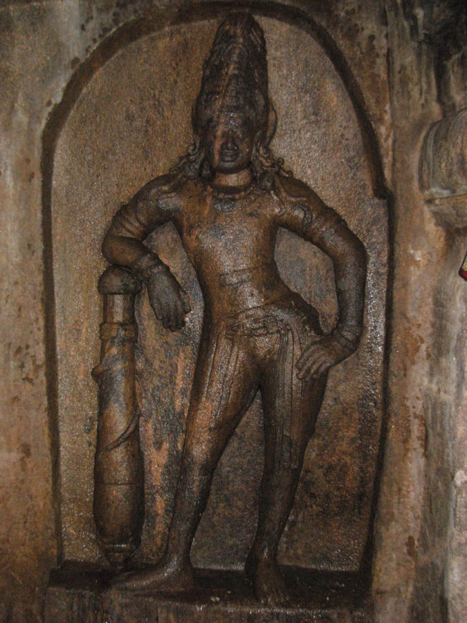 Both the Dvarapalas are standing facing each other. The dvarapala in the south is standing with his right leg in sama and left leg in parsva whereas the northern dvarapala’s legs are in tryasra but oppositely turned. As like, the southern dvarapala’s right hand is in Katyavalampita and the left hand is resting on the plank. The northern dvarapala’s left hand is on the thigh and the right hand is resting on the plank.[19] Both their planks are snake coiled, ornamented and heavy with pointed tip resting on the niche floor, bulging in the middle with upward tapering and finished with a round tip. Their locks are gathered at the apex and fastened as a high jatamakuta, few unfastened tresses floating on their shoulders add grace to their appearance. ![]() With spewed out eyes and elongated ears they are decked with ornaments like head patta, snake coil armlets, bangles, charapali, beaded necklace and udarabandha. The southern dvarapala is wearing a stone studded udarabandha and a beaded yajnopavita which is absent to his counterpart. The kundalas on their ears are like a bunch of droplets suspended on a ring. Both are wearing tightly tucked half dress in their lower part of the body with a belt fastened around the waist cling to a clip in the center and the remaining girdle drooping on the thigh. Their trim structure with inclined pose, nonchalant look and a slight grin on the face, all add grace to them. ![]() Inscriptions Kudumiyamalai is a treasure-trove of inscriptions. Copious inscriptions are found in this temple complex. 119 inscriptions have been copied out of which 45 are found in the rock cut temple alone,[20] numerous inscriptions still remain un-copied from this temple complex. Inscriptions of I Empire Pandyas, Cholas, Muttaraiyas, Velir, II Empire Pandyas, Banas, Hoysalas, Vijayanagar and Nayaks are found. Out of the 45 inscriptions, one of the inscription[21] is the term ‘Parivadini’ found on the back wall of the mandapa, five speak about Thirumerrali Mahadevar and the rest of the inscriptions speak about the endowments to Thirumulattanathu Perumanadigal (Deity in the structural shrine). The inscriptions of the early Cholas constitute major in the rock cut cave. All these shown that the structural temple remained popular in the region and received more patronization than the rock cut shrine. The reason to inscribe the inscriptions of structural temple at rock cut cave temple might be due to its perishable nature (brick work) of structure. The brick structure might have renovated into a stone structure in the later period. Among the five of the inscriptions that speak about the deity of the rock cut cave, three are lamp endowment and two are food offerings. A 14th regnal year inscription[22] of one Parakesari speaks about the endowment of 5 ma and 5 kalanju of gold by one Sadayan Kalacci in favour of Sadayanambi of Parambaiyur and the interest accruing from the deposited amount to be used for feeding 15 Maheswaras during the period of Masimagam for seven days. The endowment is made for Thirumerrali Perumanadigal. The inscription mentions the village Thirunalakkundram as a devadana. An inscription[23] of one Parakesari speaks about the endowment of 5ma and one kalanju of gold for Thirumerrali Mathevar for Masimagam celebration by one Sattam Pidari for Salaiyuttu (may be offering to God while carrying in procession). The village is mentioned as Thirunalakkundram of Kundriyur Nadu. A 15th regnal year inscription[24] of Madurai konda Parakesari (Parantaka I C.E. 907-953) speaks about the endowment 3 kalanju of refined gold for a lamp for Perumanadigal of Thirumerrali, the lamp to be lit during day time by one Virattan of Adiyaraiyamangalam in Mipulai nadu, he was the person who prepare sandal paste for the Prince. A 17th regnal year inscription[25] of Madiraikonda Parakesari (Parantaka I) speaks about two endowments and one of the endowment to Thirumerrali Perumanadigal in which 7 ma of fine gold for perpetual lamp by one Nakkan Sankaran of Vanniyur in Nallur nadu. A 5th regnal inscription26 of Rajaraja II (C.E. 1146-73) speaks about one Vikramalakiya Pallavarayan (a) Narran Periyan one of the Marava chief or nobleman of the Ahambadi sect, serving under Kulothunga chola Kadambarayan (a) Tannan Edirillapperumal, a Sar-araiyan of this nadu made a gift of lamp to the Thirumerrali Mahadevar as the lord of Thirunalakkundram in Kunriyur nadu of Irattapadi konda cola valanadu, for which a ulakku of ghee is to be supplied daily from a flock of 90 sheep. The weight of the lamp and the metal of the lamp is also mentioned. Among the remaining 39 inscriptions two belong to Pandyas of I Empire and the rest belong to the Cholas, and most of the inscriptions belong to the Early Chola period. The two of the Pandya inscriptions forms the earliest available inscriptions of the rock cut cave. The much defaced 23rd regnal year inscription of Pandya Ko Maran Sadayan, (Parantaka Nedunjadaya Varaguna I (C.E. 765-815) speaks about endowment of gold for lamp and the 23rd regnal year corresponds to C.E. 787-88.27 This inscription definitely attribute the presence of the cave during the last quarter of the 8th century AD. Another inscription28 speaks about two endowments at two different years during the King Sadaiyan Maran (Srimara Sri Vallabha C.E. 815-862) one on the 8th regnal year inscription of the king speak about 7½ kalanju of king for lamp and one kalanju of gold for seven day festival. Among the other 37 inscriptions that speak about the endowment to Thirunalakkundrattu Thirumulattanattu Perumanadigal, in which nearly twenty four of the inscriptions speak about lamp endowment to the deity. Most of the inscription mentions the deposit of 7 ma of refine gold for the perpetual lamp. Among this few are royal endowments. The 20th regnal year inscription[29] of Rajakesari speaks about the endowment of lamp by Nangai daughter of Eravagomagalar, wife of Perumpidugu Muttaraiya and sister of Vikrama