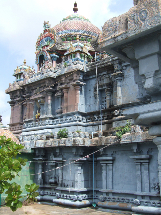 சுற்று கோபுரத்திற்கும் மாடக்கோயிலுக்கும் இடைப்பட்ட சுற்றுவெளியில் கொடிமரம், பலித்தளம், நந்திமண்டபம் இவை உள்ளன. சுற்றின் தெற்கில் உள்ள மண்டபத்தில் திருத்தொண்டர்கள், சண்டேசுவரர், நால்வர் உள்ளனர். தென்மேற்கில் ஒருதள வேசரமாய் வலம்புரிப் பிள்ளையார் திருமுன்னும் மேற்கில் ஒருதள வேசரமாய் வள்ளி, தெய்வானையுடனான முருகன் திருமுன்னும் ஒருதள நாகரமாய் யானைத்திருமகள் திருமுன்னும் உள்ளன. சுற்றின் வடமேற்கில் முன்றில், முன்மண்டபம், பெருமண்டபம், முகமண்டபம் பெற்ற ஒருதள வேசர விமானத்துடன் தேன்மொழி அம்மையின் திருமுன் உள்ளது. முன் மண்டபத் தூணொன்றில் அஞ்சலியில் காணப்படும் அடியவர் இம்மண்டபத்தை எடுத்தவராகலாம். வடக்குச் சுற்றில் அகல்யலிங்கம், உயரமான மேடையில் ஒருதள வேசர விமானத்துடன் கெளதம லிங்கம் இவற்றிற்கான திருமுன்களும் வடகிழக்கில் முன்றில், பெருமண்டபம் என அமைந்துள்ள ஆடவல்லான் திருமுன்னும் உள்ளன. வடகிழக்கு மூலையில் மதிலை ஒட்டியுள்ள அறைகளில் இலிங்கத்திருமேனிகள், அம்மன் சிற்பங்கள் அமைய, கிழக்கு அறைகளில் கதிரவன், பைரவர், சனீசுவரன் சிற்பங்களும் ஒன்பான்கோள் மேடையும் உள்ளன. பெருமண்டபத்திற்கான வெற்றுத்தளம் அருகே ஒருதள நாகர விமானத்தில் சண்டேசுவரர் உள்ளார். வெற்றுத்தளத்தின் மீது விமானம், முகமண்டபம், பெரு மண்டபம், முன்மண்டபம் என இறைவன் கோயிலும் அதன் தென்புறத்தே விமானம், முகமண்டபம், பெருமண்டபம் என சோமாஸ்கந்தர் திருமுன்னும் அமைந்துள்ளன. ![]() தேவூர் - வெற்றுத்தளத்தின் மீது விமானம் வெற்றுத்தளம் பிரதிபந்தத் தாங்குதளம், வேதிகைத்தொகுதி, சதுரபாதங்களின் மீதெழும் எண்முக அரைத்தூண்கள் தழுவிய சுவர், பூமொட்டுப் போதிகைகள் தாங்கும் கூரையுறுப்புகள், ஆழமற்ற கூடுவளைவுகளுடனான கபோதம் பெற்றுள்ள 2. 93 மீ. உயர விமான வெற்றுத்தளத்தின் வலபி பூதவரி பெற்றுள்ளது. அதில், இசைக்கருவிகளை இசைக்கும் பூதங்களையும் ஆடற்கணங்களையும் காணமுடிகிறது. ஒரு பூதத்தின் கண்களை அதன் இரு புறத்தும் உள்ள பூதங்கள் ஆளுக்கொன்றாகப் பிடுங்குமாறு ஒரு காட்சி அமைந்துள்ளது. கபோதக்கூடுகளில் ஆடற்பெண்கள், கழைக்கூத்து, உச்சிஷ்டகணபதி முதலிய சிற்பங்கள் உள்ளன. விமானஞ் சார்ந்த வெற்றுத்தளத்தின் சாலைப்பத்திகளும் கர்ணபத்திகளும் புறந்தள்ளலாக அமைய, ஒடுக்கங்களில் குடப்பஞ்சரங்கள். சாலைப்பத்திக் கோட்டங்களில் தெற்கில் ஆலமர் அண்ணலும் மேற்கில் விஷ்ணுவும் வடக்கில் நான்முகனும் உள்ளனர். பத்திகள் வேதிகைக்கு மாற்றாகப் பட்டிகை கொண்டுள்ளன. விமான வெற்றுத்தளக் கட்டமைப்பில் உள்ள முகமண்டப வெற்றுத்தளக் கோட்டங்களில் தெற்கில் பிள்ளையாரும் வடக்கில் மகிடாசுரமர்த்தனியும் உள்ளன