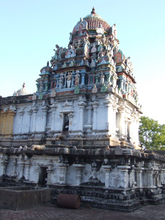 கிழக்கு நோக்கி அமைந்துள்ள இந்த மாடக்கோயிலைத் தெற்கு, மேற்கு, வடக்கு முத்திசைகளிலும் குளம் சூழ்ந்துள்ளது. கோயில் வளாகத்திற்கான முதல் நுழைவாயில் எளிமையான அமைப்புடன் மேலே சாலையும் கர்ணகூடங்களும் கொண்டு அமைந்துள்ளது. இவ்வாயிலுக்கும் இரண்டாம் கோபுர வாயிலுக்கும் இடைப்பட்ட சுற்றில் வட கிழக்கில் பிடாரிக்கோயிலும் வடக்கில் மாழையொண்கண்ணி என்றழைக்கப்படும் இறைவியின் இருதள வேசர விமானமும் அமைந்துள்ளன. ![]() வலிவலம் விமானமும் வெற்றுத்தளமும் பிடாரிக் கோயில் ஒருதளச் சாலை விமானத்தில் உத்குடியில் உள்ள பிடாரி எட்டுக்கையள். வலச்செவியில் மகரகுண்டலமும் இடச்செவியில் பனையோலைக் குண்டலமும் அணிந்துள்ள தேவியின் இடப்பாதம் கீழே விழுந்துள்ளவரின் தலை மேல் அழுந்தப் பதிந்துள்ளது. அரும்புச்சரம், சிற்றாடை அணிந்துள்ள அம்மையின் கைகளில் கேடயம், மணி, தலையோடு, வஜ்ரம், கத்தி, உடுக்கை. இரண்டு கைகளில் உள்ள கருவிகளை அடையாளம் காணமுடியவில்லை. இப்பிடாரியின் அருகிலேயே மற்றொரு பிற்காலப் பிடாரிச் சிற்பமும் உள்ளது. அம்மன் கோயில் முகமண்டபம், விமானம் எனத் தென்பார்வையாக உள்ள அம்மன் கோயிலின் முன்மண்டபக் கூரையை முச்சதுர, இருகட்டுத் தூண்கள் பூமொட்டுப் போதிகைகளின் உதவியோடு தாங்குகின்றன. தூண்களின் கீழ்ச்சதுரம் ஒன்றில் வணக்க முத்திரையில் காணப்படும் ஆடவர் மண்டபத்தை எடுத்தவராகலாம். முன்மண்டபத்தை அடுத்துள்ள சிறுமண்டபத்தின் நுழைவாயில் இருபுறத்தும் காவற்பெண்டுகளைப் பெற்றுள்ளது. அடுத்து முகமண்டபமும் கருவறையும் உள்ளன. கருவறையில் இறைவி சமபங்கத்தில் சடைமகுடம், பட்டாடை இவற்றுடன், பின்கைகளில் அக்கமாலை, மலர்மொட்டு ஏந்தி, முன்கைகளைக் காக்கும் குறிப்பிலும் அருட்குறிப்பிலும் கொண்டுள்ளார். இருதள வேசரமாய் அமைந்துள்ள விமானத்தின் கீழ்த்தளம், துணைத்தளம், பாதபந்தத் தாங்குதளம், வேதிகைத்தொகுதி, நான்முக அரைத்தூண்கள் தழுவிய சுவர், பூமொட்டுப் போதிகைகள், கூரையுறுப்புகள் கொண்டு அமைந்துள்ளது. புறந்தள்ளியுள்ள சாலைப்பத்திகளின் கோட்டப் பஞ்சரங்கள் வெறுமையாக உள்ளன. சுதையாலான அம்மன் உருவங்களைப் பெற்றுள்ள கீழ்த்தள ஆரச்சாலைகளும் புறந்தள்ளியுள்ளன. இரண்டாம் தளத்தையடுத்துக் காணப்படும் கிரீவகோட்டங்களில் சுதையாலான அம்மன் வடிவங்கள். விமானம் ஒத்த கட்டமைப்பிலுள்ள முகமண்டபக் கோட்டங்களும் வெறுமையாக உள்ளன. முகமண்டபத்தருகே உள்ள ஒருதள வேசர விமானத்தில் சண்டேசுவரி தெற்குப் பார்வையாக இடம்பெற்றுள்ளார். முன்மண்டபத்தின் புறச்சுவர் தாங்குதளமற்று, நான்முக அரைத்தூண்கள் அணைத்த நிலையில் கூரையுறுப்புகள் பெற்றுள்ளது. மண்டபக் கூரையின் வடகிழக்கு, வடமேற்கு மூல
