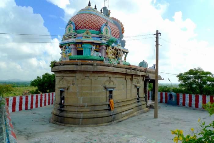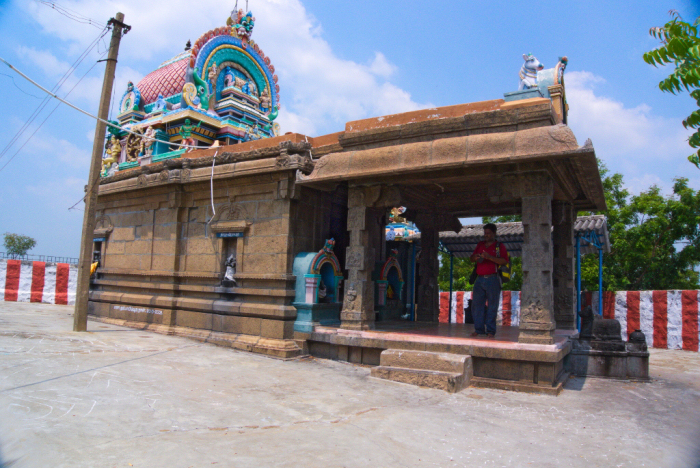 திருப்போரூர் நெடுஞ்சாலையிலிருந்து இடது புறம் விலகி, குண்டும் குழியுமான பாதையில் இறங்கி, ஏறி நிமிர்ந்து பார்த்தபோது ஒரு வண்ணப்புள்ளி போல் தெரிந்தது அந்தக் கோபுரம். உடல் முழுவதும் பச்சை பசேலென்று புடவையை சுற்றிக்கொண்டு எழுந்து நின்றது போல்ஒரு சிறிய குன்று தென்பட்டது. அதன் மேல் பளிச்சென்ற வண்ணத்தில் சின்னக் கோயில்.