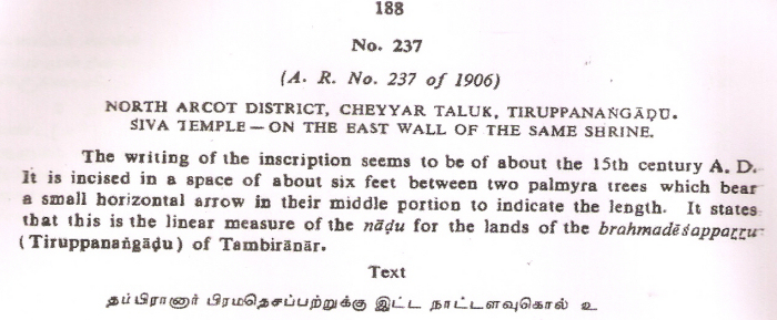 ![]() ![]() கல்வெட்டுக்கள் அழிப்பு இக்கோயில் 1928ஆம் ஆண்டு தேவக்கோட்டையைச் சேர்ந்த பெரி. ஏகப்பச் செட்டியார் குடும்பத்தினரால் திருப்பணி செய்யப்பட்டதை நுழைவு வாயிலில் உள்ள கல்வெட்டால் அறிய முடிகிறது. இத்திருப்பணியினால் கோயில் தொன்மையான கட்டிடப் பகுதிகள் பலவற்றையும் இழந்ததோடு 1928 ஆண்டிற்கு முன் படியெடுக்கப்பட்ட கல்வெட்டுக்களையும் முழுமையாக இழந்து நிற்கிறது. மிகுந்த வரலாற்று முக்கியத்துவம் வாய்ந்த கல்வெட்டுக்களை இதுபோன்று திருப்பணிகளுக்குப் பறிகொடுத்த பழங்கோயில்கள் ஏராளம் ! ஏராளம்! இதுபோன்ற திருப்பணிகளின் வாயிலாகக் பழங்கோயில்களின் சிற்பங்களையும் கல்வெட்டுக்களையும் கட்டுமானங்களையும் அழிக்கும் கொடுமை இன்று வரையில் எந்தத் தடையுமின்றித் தொடர்கிறது என்பதே உண்மை. படியெடுக்கப்பட்ட கல்வெட்டுக்களிலிருந்து அறியப்படும் செய்திகள் இக்கோயிலின் கல்வெட்டுக்கள் 1906 ஆம் ஆண்டு படியெடுக்கப்பட்டுள்ளன. அவற்றின் தொகுப்பு பின்வரும் மத்திய அரசின் தொல்லியல் அளவீட்டுத் துறை கல்வெட்டு அறிக்கைகளிலும் தென்னிந்தியக் கல்வெட்டுக்கள் தொகுதி 22லும் காணப்படுகின்றன. 1. ARE Report : 1906 - 233 to 254 2. ARE Report : 1923 - 421 3. ARE Report : 1968 - 69 - 213 4. South Indian Inscriptions No.22 : 233 - 254 இக்கல்வெட்டுக்களின்படி பண்டைய காலத்தில் இவ்வூரில் பனைமரத்தைப் போற்றிப் பாதுகாப்பதற்கு மிகுந்த முக்கியத்துவம் கொடுத்துள்ளனர் என்பது அரிய செய்தியாகும். அத்துடன் சோழ மன்னர்கள் காலம் தொடங்கி விஜயநகர மன்னர்கள் வரை இக்கோயில் பல்வேறு அரசாங்கங்களால் இத்திருக்கோயில் புரக்கப்பட்டுள்ளது என்பதும் முக்கியமான தரவாக அமைகிறது. மன்னர்கள் முதலாம் இராஜேந்திர சோழர் (1043-44), இராஜாதிராஜன் (1049-50), முதலாம் குலோத்துங்க சோழன் (1114-15), இரண்டாம் குலோத்துங்க சோழன் (1142-43) மூன்றாம் இராஜராஜன் (1233-34) ஆகிய சோழமன்னர்களின் கல்வெட்டுக்களையும் விருப்பண்ண உடையார், விருபாக்ஷ உடையார், கம்பண உடையார், தேவராயர், கிருஷ்ணதேவராயர், அச்சுத தேவ மகாராயர் ஆகிய விஜயநகர மன்னர்களின் காலக் கல்வெட்டுக்களையும் இக்கோயிலில் ஒருகாலத்தில் தாங்கி நின்றது. நாட்டுப்பிரிவு இத்தலம் ஜெயங்கொண்ட சோழ மண்டலத்துக் காலியூர் கோட்டத்துக் கழுமல நாட்டுத் திருப்பனங்காடு என்றும் இக்கோயில் திருப்பனங்காடு உடையார் கோயில் என்றும் கல்வெட்டுக்களில் குறிப்பிடப்படுகிறது. பிரம்மதேசம் என்கிற சோழர்காலத் தொன்மை வாய்ந்த தலம் இவ்வூருக்கு அருகில் உள்ளது குறிப்பிடத்தக்கது. ![]() இறைவன் பெயர் இக்கோயிலில் இரண்டு கருவறைகள் உள்ளன. இன்றைய தேதியில் தாலபுரீசுவரர், கிருபாநாதேசுவரர் என இறைவன் அழைக்கப்படுகிறார். கல்வெட்டுக்கள் இவ்வூர் இறைவனை விடையின் மேல் வருவார் என்றும் அடையிலன்புடையார்