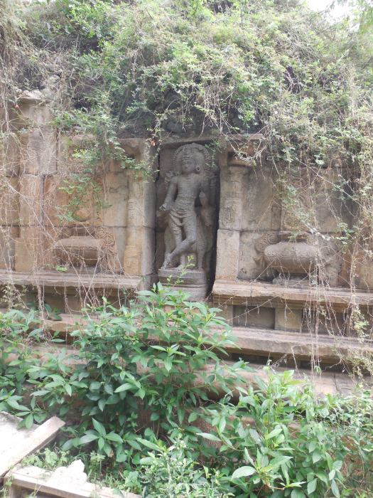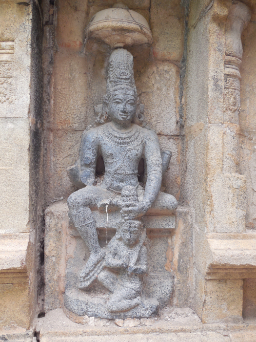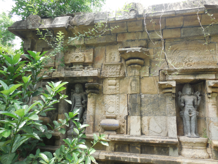 கோயில் அமைப்பு: கிழக்கு நோக்கிய திருக்கோயில். கோயிலுக்கு முன் பலிபீடமும் நந்திமண்டபமும் காட்சி தருகிறது. கோயில் கருவறை, அர்த்த மண்டபம், மகாமண்டபம் என்ற அமைப்புகளுடன் காட்சி தருகிறது. மகாமண்டபத்திற்குள் நுழைவதற்குப் பக்கவாட்டில் படிக்கட்டுகள் உள்ளன. ![]() மகாமண்டபத்தை ஒட்டித் தெற்குநோக்கி அம்பாள் சன்னிதி உள்ளது. அம்மன் ஜடாமகுடம் அணிந்து தனது நான்கு கரங்களில் மேலிரு கரங்களில் அட்சமாலையும், தாமரை மலரைத் தாங்கியும், கீழிரு கரங்களில் அபய-வரத முத்திரை தாங்கி அன்பர்களுக்கு அருள்புரியும் அழகிய வடிவினைக் காணலாம். அம்மன் சன்னிதி கருவறை விமானத்தில் செடிகொடிகள் வளர்ந்து எப்பொழுது இடிந்து விழுமோ என்ற கவலையை ஏற்படுத்துகிறது. ![]() மகாமண்டப நுழைவாயிலின் வலப்புறம் அதிகார நந்தியின் வடிவமும், இடதுபுறம் சிவபெருமான் அர்ச்சுனனுக்குப் பாசுபதம் வழங்கும் கதையை நினைவூட்டும் வகையில் கிராதார்ஜுன வடிவத்தையும் தேவகோட்டங்களில் காணலாம். சூலக்கல்: மேலும் நுழைவு வாயிலின் அருகே சூலக்கல் ஒன்று காணப்படுகிறது. பொதுவாக இத்தகைய கற்கள் சிவன் கோயில்களுக்கு அளிக்கப்பட்ட நிலங்களில் நடப்பட்டிருக்கும். இங்கு காணப்படும் சூலக்கல்லில் சூலமும், அதன் மேற்புறம் சூரியன் - சந்திரன் வடிவமும் சூலத்தின் கீழ்ப்பகுதியில் பன்றியின் வடிவமும் புடைப்புச் சிற்பமாகக் காணப்படுகிறது. சாளுக்கிய மன்னர்களும் விஜயநகர மன்னர்களும் (வராகத்தை) பன்றியை அரசு இலச்சினையில் கொண்டிருந்தனர். ![]() இக்கோயிலில் கல்வெட்டுகள் ஏதும் காணப்படவில்லை. தென்மேற்கு மூலையில் அமைந்துள்ள விநாயகர் ஆலயத்தின் அதிட்டானப் பகுதியில் மட்டும் கல்வெட்டு காணப்படுகிறது. அதுவும் முழுமையாக இல்லை. கட்டடக்கலை, சிற்பக்கலையின் அடிப்படையில் இக்கோயில் முதலாம் குலோத்துங்கசோழன் காலத்தைச் சேர்ந்ததாகக் கொள்ளலாம். இவன் சுங்கம் தவிர்த்த சோழன், சோழன் திரிபுவன சக்கரவர்த்தி என்றெல்லாம் சிறப்புப் பெயர் பெற்றவன். கீழைச் சாளுக்கிய மன்னனாகிய இராஜராஜ நரேந்திரனின் புதல்வன். இவனுடைய தாய் கங்கைகொண்ட சோழன் புதல்வியாகிய அம்மங்கைதேவியார் ஆவார். கீழைச் சாளுக்கிய மரபைச் சேர்ந்த மன்னனால் கட்டப்பட்ட இக்கோயிலில் காணப்படும் சூலக்கல்லில் பன்றி (வராகம்) அரச சின்னம் இடம்பெற்றிருக்க வாய்ப்பு உள்ளதாகக் கருதமுடிகிறது. ![]() மகாமண்டப தேவகோட்டங்களில் ரிஷபாரூடர், அர்த்தநாரீசுவரர், சரசுவதி, லட்சுமி, கங்காதரமூர்த்தி, சந்திரசேகரர், பிட்சாடனார், பைரவர், துவாரபாலகர் ஆகிய தெய்வ வடிவங்கள் அழகிய சிற்பங்களாகக் காட்சி தருகின்றன. சரசுவதி, லட்சுமி வடிவங்களில் தலைக்கு மேலே குடை காட்டப்பட்டுள்ளது. இக்கோயிலில் பல சிற