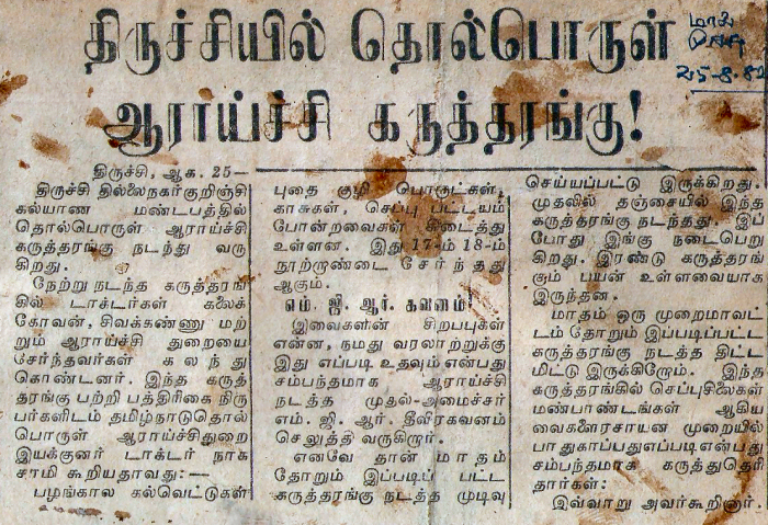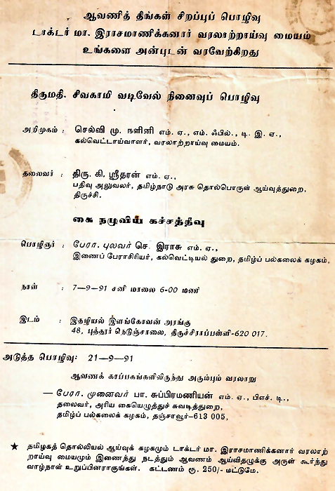 முதன்முதலில் தஞ்சைப் பகுதியில் தொல்லியல் கள ஆய்வினை மேற்கொண்டபோதுதான் மருத்துவர் இரா.கலைக்கோவன் அவர்களது வரலாற்றாய்வுப் பணிகள் பற்றி அறியும் வாய்ப்புக் கிடைத்த து. என்றாலும் நேரில் சந்திக்க இயலவில்லை. தொல்லியல்துறை 1976-80 ஆண்டுகளில் மாவட்டங்கள் தோறும் கருத்தரங்குகள் மற்றும் வரலாற்றுக் கண்காட்சிகளை நடத்தியது. இதில் திருச்சி மாவட்டத்தில் ஏற்பாடு செய்யப்பட்ட கருத்தரங்கு தில்லைநகர் குறிஞ்சி திருமண மண்டபத்தில் நடைபெற்றது. அப்போதுதான் முதன்முறையாக அவரைச் சந்தித்தேன். திருச்சியில் பதிவு அலுவலராகப் பணியாற்றிய திரு.அப்துல் மஜீத் (மேனாள் தொல்லியல்துறை இயக்குனர்) அவர்களின் வழி இந்த அறிமுகம் கிடைத்தது. சிறிது நேரம் உரையாடியதாக ஞாபகம். ![]() கருத்தரங்கு பற்றிய செய்தி அந்தக் காலகட்டத்தில் அமுதசுரபி, கலைமகள் போன்ற இதழ்களின் தீபாவளி மலர்களில் வரலாறு சார்ந்த கட்டுரைகளை நான் எழுதுவது வழக்கம். அதே இதழ்களில் திரு.கலைக்கோவன் அவர்களின் கட்டுரைகளும் வெளிவரும். எனது கட்டுரைகளைப் படித்துப் பாராட்டுவார். இன்னும் நிறைய எழுதுங்கள் என்று உற்சாகப்படுத்துவார். தில்லை நகரில் உள்ள அவரது இல்லத்தில் அப்போது மாதந்தோறும் சொற்பொழிவுகள் நடக்கும். ஒரு முறை அந்தப் பொழிவுத் தொடரில் ‘வரலாறு காட்டும் திருக்கோயில் திருப்பணிகள்’ என்ற தலைப்பில் உரையாற்றினேன். பின்னர் டாக்டர்.மா.இராசமாணிக்கனார் வரலாற்று மையம் இயங்கிய மருத்துவமனை வளாகத்திலும் பல அறிஞர்கள் சொற்பொழிவாற்றியுள்ளனர். 7.09.1991 அன்று ‘கை நழுவிய கச்சத்தீவு’ என்ற தலைப்பில் தமிழ்ப்பல்கலைக்கழகப் பேராசிரியர் புலவர் செ.இராசு அவர்கள் உரையாற்றினார்கள். அந்நிகழ்ச்சிக்கு நான் தலைமை தாங்கினேன். ![]() மைய சொற்பொழிவு அழைப்பிதழ் 1984ல் தஞ்சையில் பதிவு அலுவலராகப் பணியாற்றிக்கொண்டிருந்தேன். அப்போது டாக்டரும் மைய ஆய்வாளர்களும் பழையாறையில் உள்ள பள்ளிப்படைக் கோயிலை ஆய்வு செய்யச் சென்றபோது நானும் உடன்செல்லும் வாய்ப்புக் கிடைத்தது. அந்த ஆய்வுப் பயணம் அனைவருக்குமே பயனுடைய பயணமாய் அமைந்தது. திருச்சி வானொலி நிலையத்தாருக்காக தஞ்சைப் பெருவுடையார் திருக்கோயில் பற்றி மைய ஆய்வாளர்களால் ‘உரைச்சித்திரம்’ தயாரிக்கப்பட்ட பொழுது நானும் உடனிருந்து விவாதங்களில் பங்குபெற்றதும் நினைவில் உள்ளது. அதே வானொலியில் ‘கோயில்கள் வளர்த்த கலைகள்’ என்கிற தலைப்பில் அறிஞர்களில் தொடர் உரைகள் ஒலிபரப்பப்பட்டபோது ‘இசைக்கலை’ பற்றிய உரையை நான் தயாரித்தளித்தேன். என்னுடைய உரையை டாக்டர். கலைக்கோவன் செம்மைப்படுத்தித் தந்து உதவினார். எனது இந்த இசைக்கலை உரையின் சிறப்பைத் தனது எழில் கொஞ்சும் எறும்பியூர் 