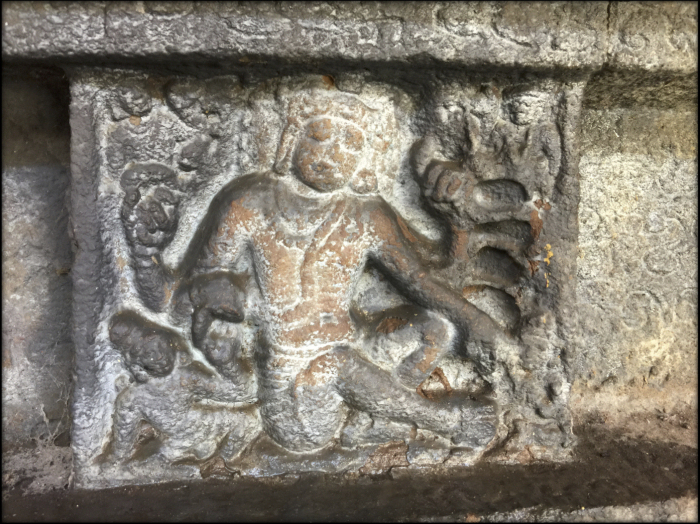 அமைவிடம் - குத்தாலம் சொன்னவாரறிவார் திருக்கோயிலின் முகமண்டபத் தெற்குச் சுவரில் அமைந்துள்ள அகத்தியர் கோட்டத்தின் வலப்புறத் தூணின் வேதிக்கண்டத்தில் 4.5” X 4.5” அங்குலத்திற்குச் செதுக்கப்பட்டுள்ள அற்புதமான குறுஞ்சிற்பம். ![]() இரு கால்களையும் குறுக்கே மடக்கி யோகாசனத்தில் அமர்ந்துள சிவபெருமான், தனது முன் வலது கரத்தினை ஆசனத்தில் அமர்த்தியும் முன் இடது கரத்தினை தொடையின் மீது அமர்த்தியும் பின் வலது கரத்தில் அக்கமாலையையும் பின் இடது கரத்தில் பாம்பினையும் கொண்டுள்ளார். யோக நிலையில் அமர்ந்துள்ள இவரது பார்வை கீழ்நோக்கியுள்ளது. ![]() கழுத்தில் மாலையொன்றும் முத்துமாலையொன்றும் காணப்படுகின்றன. இறைவன் தனது சடைமுடிகளை ஜடாபாரமாக அலங்கரித்துள்ளார். இடது காதில் பத்ர குண்டலமும் வலது காது வெறுஞ்செவியாகவும் சித்தரிக்கப்பட்டுள்ளது. இடுப்புப் பகுதியை மார்பிலிருந்து பிரித்துக் காட்டும் உதர பந்தமும் வஸ்திர முப்புரிநூலும் தரித்து தலையில் மண்டையோட்டுடன் காணப்படும் இக்காமதகன மூர்த்தியின் மேல் இருபுறங்களிலும் கந்தர்வர்களும் கீழ் வலப்பக்கத்தில் மன்மதனும் எழிலுடன் காட்டப்பட்டுள்ளனர். கீழ் இடது பக்கத்தில் உள்ள உருவத்தை இச்சிற்பத்தில் சரிவர அடையாளம் காணமுடியாவில்லை. இதே போன்றதொரு குறுஞ்சிற்பம் திருக்கோடிக்கா திருக்கோயிலில் அமைந்துள்ளது. அக்கோயில் சிற்பத்தில் கீழ்ப்புறமுள்ள உருவத்தை இரதியாக அடையாளம் காண முடிவதால் தற்போதைய சிற்பத்தின் கீழ் இடப்பக்கம் உள்ள உருவத்தையும் இரதியாகவே கொள்ள முடியும். கிடைத்த இடம் நான்கரை சதுர அங்குலம் மட்டும்தான் என்றாலும் அந்த இடத்திற்குள் இத்தனை உருவங்களை எழிலுறச் செதுக்கிய சிற்பியின் கலைத்திறமை காலம் உள்ளவரை வாழுமல்லவா? |