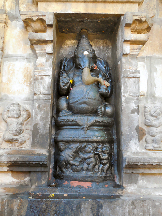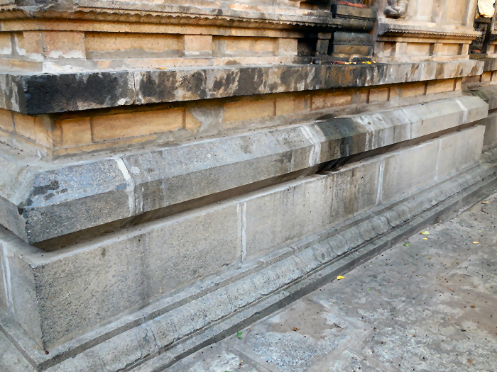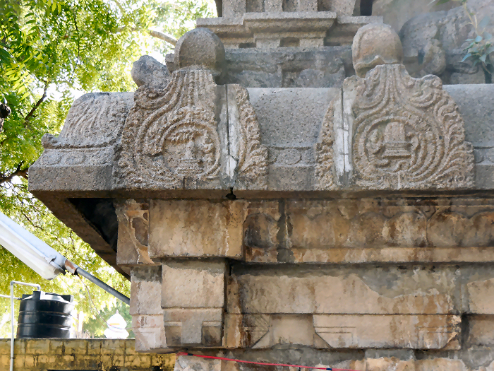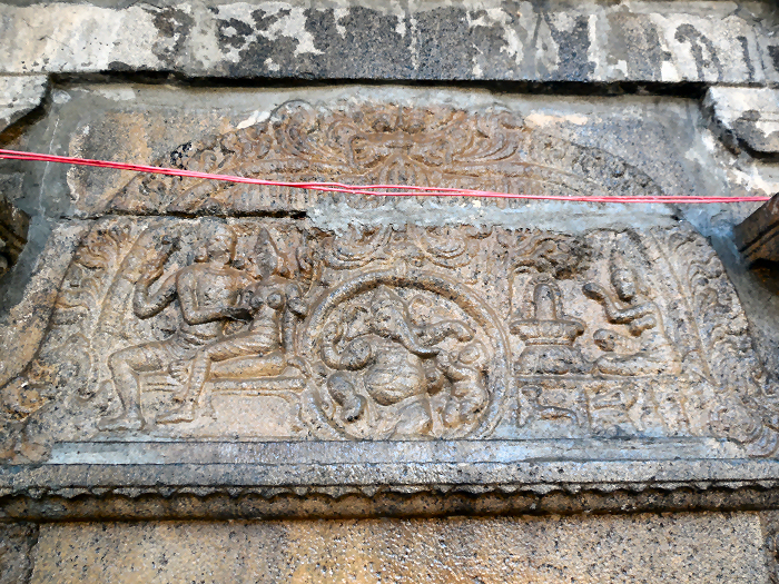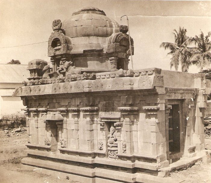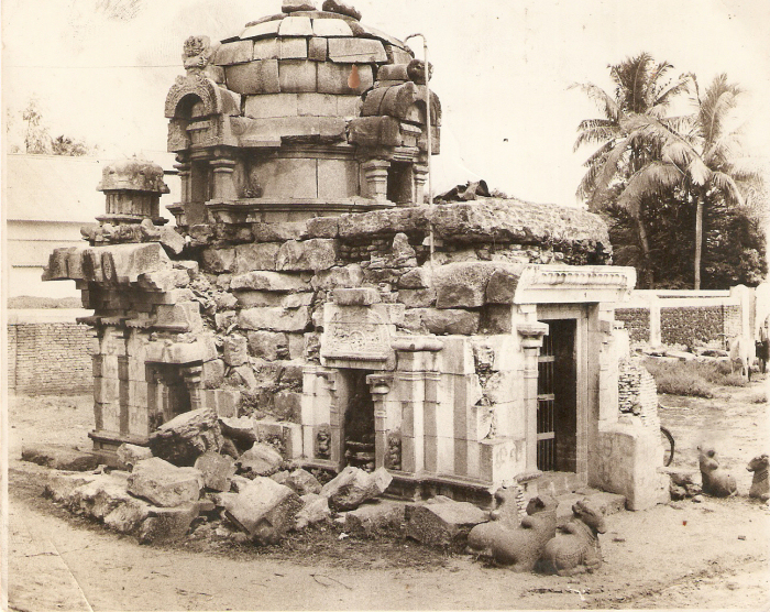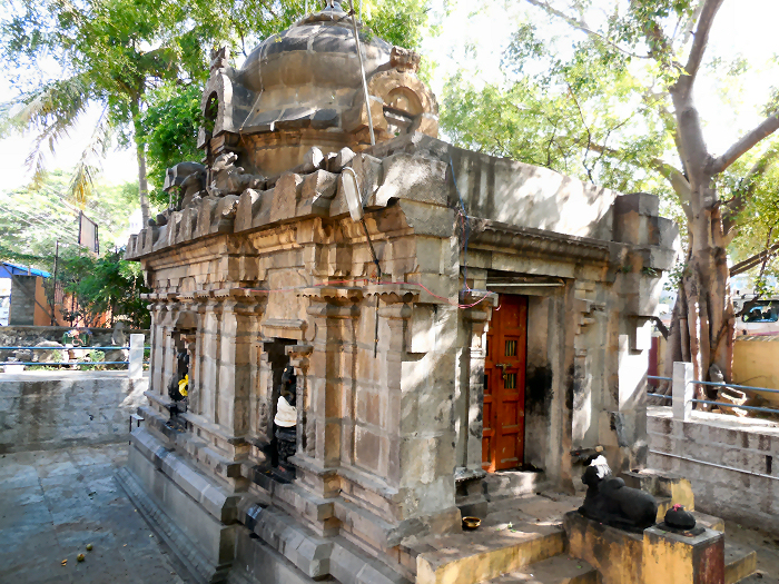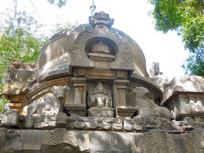 ![]() திருக்கோயில் விமானம் மற்றும் மண்டபம் பல ஆண்டுகளுக்கு முன் சிதைந்த நிலையில் இருந்த இத்திருக்கோயிலை தமிழ்நாடு அரசின் தொல்லியல்துறை உரிய முறையில் பழுதுபார்த்துள்ளமையை துறை வெளியீடான தமிழகம் (Damilica) டிசம்பர் 1970 இதழில் பக்கம் 36ல் உள்ள நிழற்படங்களை நோக்குவதன் மூலம் புரிந்துகொள்ள முடிகிறது. இக்கோயில் தற்போது வழிபாட்டில் உள்ளது. ![]() பழுதுபட்ட நிலையில் திருக்கோயில் ![]() தொல்லியல் துறை சீரமைப்பிற்குப்பின் திருக்கோயில் அமைப்பு கோயில் கிழக்குப் பார்வையாக அமைந்துள்ளது. கோயில் வாயிலில் நந்தியெம்பெருமான் எழுந்தருளியுள்ளார். கருவறையில் சிவலிங்க வடிவில் இறைவன் காட்சியளிக்கிறார். இக்கோயில் கட்டுமானம் விமானம் மற்றும் அர்த்த மண்டபத்தை உள்ளடக்கியுள்ளது. பாதபந்தத் தாங்குதளத்தின் மீதெழும் விமானம் ஒரு தள வேசரமாக நாகர ஆதிதளத்துடனும் வேசர கிரீவ சிகரங்களுடனும் அமைந்துள்ளது. ஸ்தூபம் விழுந்துவிட்டதால் காணப்படவில்லை. விமான ஆதிதளத்தில் மூன்று கோட்டங்களும் மண்டபத்தில் இரண்டு கோட்டங்களும் அமைந்துள்ளன. இவற்றுள் மண்டபத்தின் தெற்குச் சுவரில் அமைந்துள்ள கோட்டத்தில் அமைந்துள்ள விநாயகரின் சிற்பம் மட்டும் பழமையானது. இதர சிற்பங்கள் அண்மைய காலத்தவை. ![]() தாங்குதளம் தாங்குதளம் பத்ம உபானம், ஜகதி, எண்பட்டைக் குமுதம், கம்புகள் தழுவிய கண்டம் பட்டிகை முதலான உறுப்புக்களுடன் அமைந்துள்ளது. தாங்குதளத்திற்கு மேலமைந்த வேதிகையின் மீது சுவர்ப்பகுதிகள் எழுகின்றன. அரைத்தூண்களால் பகுக்கப்பட்டுள்ள ஆதிதளச் சுவரின் மையத்தில் கோட்டங்களுக்கான அகழ்வு காணப்படுகிறது. கோட்டங்களின் பக்க அரைத்தூண்களுக்கு மேல் கபோதத்துடனான கூரைப்பகுதி காட்டப்பட்டிருப்பது சிறப்பு. இக்கபோதம் விமான கோட்டங்களில் மட்டும் காணப்படுகிறதன்றி மண்டபக் கோட்டங்கள் இரண்டிலும் காணப்படவில்லை . கோட்டங்களுக்கு மேல் மகரதோரணங்கள் காணப்படுகின்றன. தூண்களின் வெட்டுப் போதிகைக் கரங்கள் உத்திரம் தாங்குகின்றன. வலபியில் வழக்கமாகக் காட்சியளிக்கும் பூதங்களுக்கு பதில் தாமரை இதழ்கள் போன்ற வேலைப்பாடுகள் காணப்படுவது சிறப்பு. கபோதத்தில் அமைந்துள்ள நாசிக்கூடுகளில் சிற்றுருவங்கள் செதுக்கப்பட்டுள்ளன. கூரைப் பகுதியின் மேல் தென்மேற்கு மற்றும் வடமேற்கு மூலைகளில் இரண்டு கர்ணக் கூடுகள் காட்சியளிக்கிறன. ![]() வடபகுதி கிரீவக் கோட்டத்தில் பிரம்மா. மகாநாசியில் விமானப் புடைப்புச் சிற்பம் வேசர கிரீவத்தின் நாற்புறங்களிலும் கிரீவக் கோட்டங்கள் அமைக்கப்பட்டுள்ளன. அவற்றில் அமர்ந்த நிலையில் தெற்கே தட்சிணாமூர்த்தி, மேற்கில் யோக நரசிம்மர், வடக்கே பிரம்மா முதலான தெய்வத் திருவுருவ