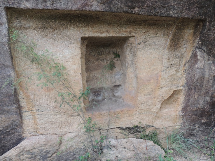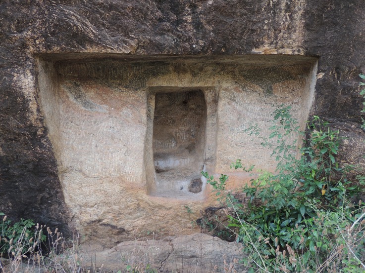 Two unfinished cellars are explored at Narttamalai during our field trip to Vijayalaya Choleeswaram.1 Both the cellars are just few yards south of Pazhiyili Iswaram, lying in a distance of 105 feet beyond. Though we had been to the place for many times, we didn’t think of moving beyond Pazhiyili Iswaram where these two cellars lie inconspicuous behind the overgrown shrubs and bushes. Both the cellars are typical Pazhiyili Iswaram style of attempt; a cellar with anterior wall having kapota and side walls.1 Apart from Pazhiyili Iswaram to its north lies the Pathinenbhumi vinnagaram, a huge mandapa cave. Both the cellars are excavated at the foot on the eastern precipice, on the ledge of the hillock. The mother rock is continuously inclined in this region starting from Pathinenbhumi vinnagaram which extend even far beyond the unfinished cellars. In this inclined precipice the two cellars are excavated facing east. Nearly 40 feet distance is seen between the cellars. The Cellar I is at the extreme south and Cellar II lies to the north of Cellar I. Unfinished Cellar I On the eastern face of the hillock to a width of 2.95mts and to the height of 2.45mts the mother rock is sheared off which gives a well formed anterior wall with kapota and side walls to the cellar. The anterior wall is broad in the top and gradually becomes narrow in the base. The rough rock brow forms the kapota that extends 0.60mts and the canopy is flat. The side walls range between 0.50 mts to 0.10mts due to inclination of mother rock. An attempt of uttira is seen. At the center of the sheared off wall an aperture is formed to a height of 1.28 mts, width of 1.05mts and to a depth of 0.85mts. ![]() Unfinished Cellar II Aslike, the Cellar II also has a well formed anterior wall to the height of 2.62mts and to the width of 3mts. likewise, the anterior wall is broad in the top and gradually become narrow towards the base. The kapota is 0.85mts and the side walls range between 0.85 mts in the top gradually becoming 0mts at the base. Attempt of uttira is seen on the southern corner. The cell is scoped in the centre to a height of 1.32 mts, width 1mts and depth 0.83mts. Jambs and sill are formed in the opening. Among the two, the Unfinished Cellar II is well formed. ![]() Smaller caves are quite common in Pudukkottai district, the cellar shrine Kulalakottaiyur2 and the mandapa cave Mangudi are best examples. Foot Notes : 1. Date of the trip 10-02-2016. It was first cited by Seetharaman Subramanian while he was moving towards south to get a better view of Vijayalaya Chooleswaram. 2. The anterior wall of Pazhiyili Iswaram is 2.38mts height and 4.21mts width. The aperture to the sanctum is 1.70mts height and 0.94mts width. The sanctum is 2.30mts height, width and depth. 3. The anterior wall is 1.42 mts height, 2.06mts breadth. Aperture to the cell is 1.39 mts and width 0.08mts. The sanctum is 1.70mts x 1.21 mts x 1.41mts. |