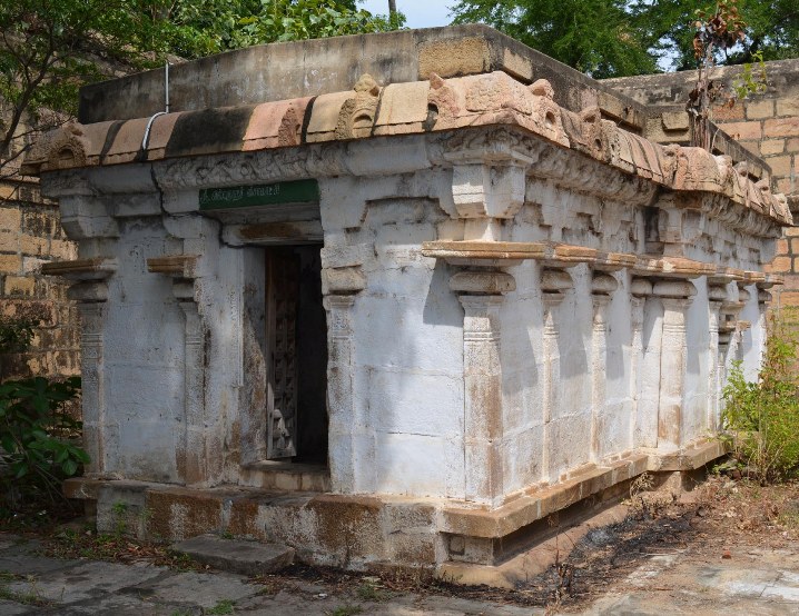 Chandrasekaraswami Temple – Thiruchchedurai Sri Visvanatha – Visalatchi Shrine Sri Visvanatha-Visalatchi shrine lies southwest of the main shrine and it consists of a sanctum and a mukha mandapa. The shrine has an adhishthana, bhitti, prastara. The padabandha adhishthana is partially inside the ground, only the kantha complex, pattika and the upari kampa are visible. The bhitti that raise little inside the uparikampa is sectioned by brahmakantha pilasters that possess capital components of mala, sthana, padmakattu, kalasa, tadi, kumbha, pali, phalaka and virakantha. The mala and the sthana are ornamented with scrolls and festoons and miniatures. The kalasa, kumbha and pali are ornamented with embossed work.