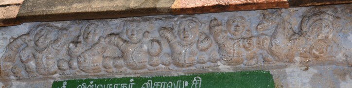 There are nearly ten instrumentalists found on the southern side; two ganas are handling idakkai, one gana mattala, three ganas pot like instrument, two flute, one conch and one cymbal. Among the flutist, the one found in the end of the sanctum is little worn out, while the handling of the instrument for the other two is beautifully exhibited. Their mouth is in gesture of blowing air and fingers blocking the holes accordingly. The gana that blow conch is holding the instrument in both the hands and mouth in gesture of blowing. The ganas that are handling idakkai is holding the instrument on their left hand and their right hand is striking the instrument and their facial expression is to the rhythm. One of the gana is seen carrying the mattala close to his chest. Three of the ganas are handling a pot like instrument. In that two are contiguous to each other, one of the gana placed the pot on his right leg and the other on his left leg and their gestures shows they are elated in their performance and also a sense of contention is seen.