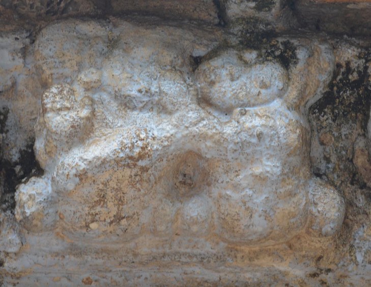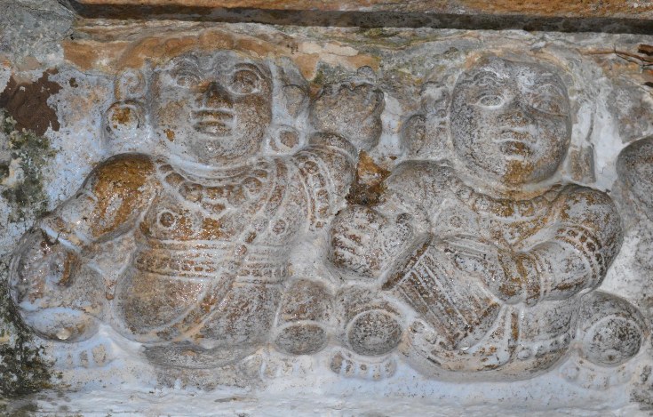 The potikas are angular-taranga with kulavu and are three limbed at the corners. The potikas bear the uttira and followed by vajana and valabhi. Valabhi is adorned with bhuta frieze. The kapota is ornamented with well formed kudus at frequent intervals, pattas in the corners and chandramandalas in the ridges. The tala ends with bhumidesa, represented with aaliga and anthari. Niches are shown on north, south and west which are flanked by brahmakantha split pilasters and crowned by makara torana. Pilasters carry the same ornamentation of the pilasters of mother wall but mala and sthana are absent, as like, the makara toranas also remain incomplete. The mukha mandapa is smaller in width comparing the sanctum. As like the sanctum the mukha mandapa is also cantoned by four brahmakantha pilasters on all sides carrying same features of the pilasters of the sanctum walls. Here the niches are absent. The entrance to the shrine is on the east and the doorway is flanked by split pilasters, the potikas above the split pilasters are plain-angular. Jambs, sill and lintel are arranged in the doorway. The sanctum houses a small Linga and a goddess. Bhuta Ganas The bhuta frieze in the valabhi is a remarkable feature to mention. The series is continuous on the north, south and west but on the eastern side it is absent at two patches. Besides ganas, the corners are adorned with yazhi and along with it on either side other miniatures are shown. The ganas are active; mostly in dancing gestures, apart from that, frisking, frolicking, handling instrument, conversing with the neighbour are also seen. Overall it gives a lively feel. In addition, peacocks are also shown in the series equally in active posture, adding the liveliness of the frieze. The ganas are adorned with short attire and decked with ornaments like charapali, beaded mala, bangles, armlets, patrakundalas and udarabandha. The yajnopavita is worn in upavita fashion. Two of the ganas are seen wearing in different way, from right to left. Some of ganas are decked with beaded ornaments and some are decked with stone studded ornaments. For most of the ganas the locks are arranged as jatabhara while for some the locks are gathered and knotted in the apex. Regarding the number of ganas, six are seen on the eastern side, seventeen on the western side, twenty five on the south and twenty two on the north. Totally there are six peacocks, found on all sides except west, one on the east, two on the south and three on the north. Almost all the ganas are in dancing gestures except few who handle instruments. For the ganas in gestures, their hands are either raised up or positioned down and their palms showing mudras or hastas viz., pataka, recita, danda, kataka, pottri, abhaya, varada, tarjani, suchi, etc. Instrumentalists are seen exclusively on the southern side.