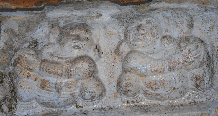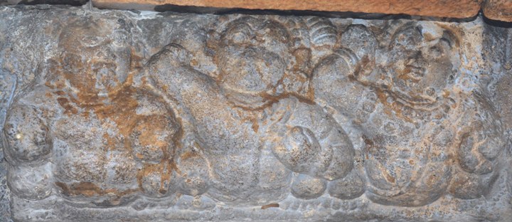 On the western side almost all the ganas are paired with their neighbour in their gestures. On the northern end next to a single female gana is a pair looks like conjoined twins with their right hand folded towards their chest and their left hand in eulogize in different pose. Both the ganas are fully decked with beaded ornaments. The next pair in elated mood; their right hand raised up and in vismaya whereas their left hand is in kataka, their head slightly tilted left and facing up in expression showing that they were awestruck. In between these two pair is a single gana in gesture of kataka. Another pair in the middle of the series is also with their inner hand folded towards their chest and their outer hand raised up and their head tilted left in sequence to their gesture. In that one of the gana is wearing the yajnopavita from right to left. On the southern end, three monkey faced ganas are seen, in that two are chain locking their inner hand and their outer hand stretched on their side. The nature of locking whether joyous or combating is unable to understand due to white wash coating. The other gana is carrying a stick on its right hand.