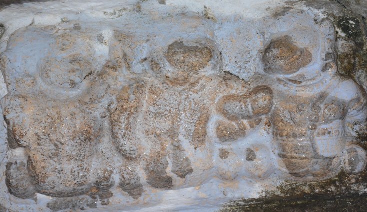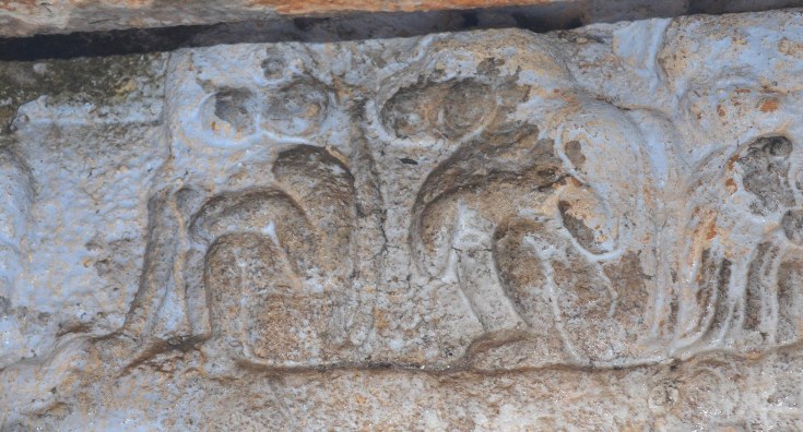 As like other sides, the ganas on the northern side also are with their hands in various gestures. Most of the ganas are showing kataka mudra. One noted addition in this side is a male-female pair, their right hand raised up and in eulogize, their left hand is in suchi. Instead of yajnopavita the female gana is adorned with beaded chhannavira. Contiguous to them another pair seems to be in the gesture of conversation in that one of the gana has placed his hands on his counterpart, looks as if soothing. The peacocks in the series are seen both in profile pose and also in front pose, the features are best exhibited in the profile pose. The birds are with wide eyes, thick plumage, sharp beak and claws. The plumage is beautifully shown as curls.