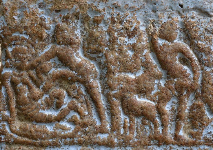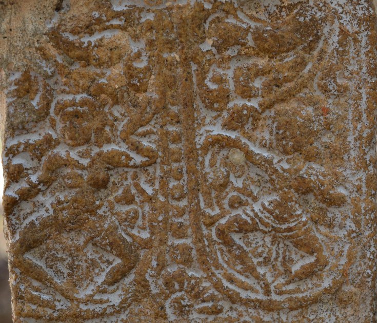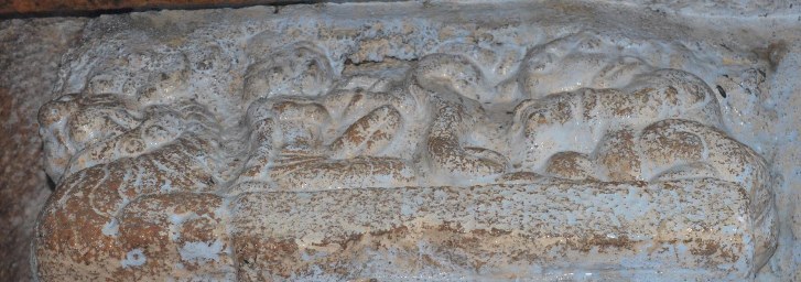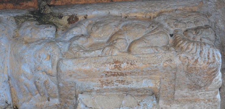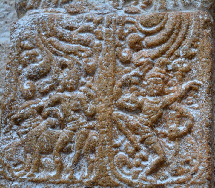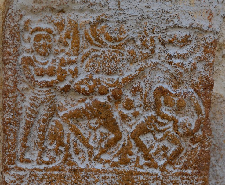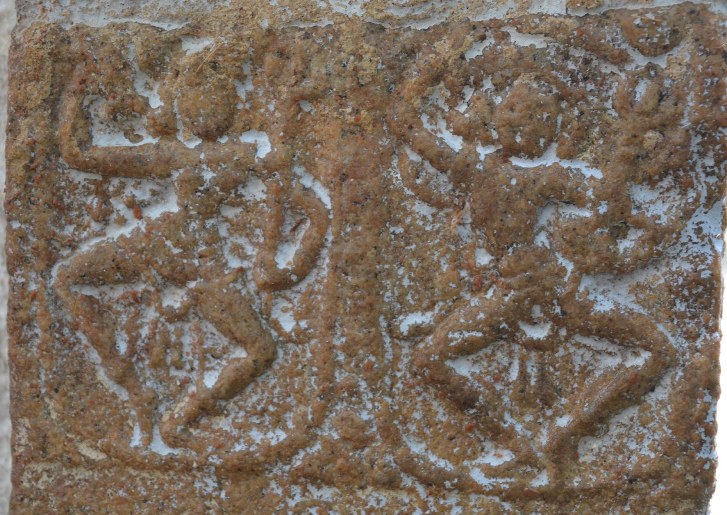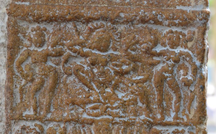 The south-east corner pilaster possesses miniatures both on the eastern and southern faces. Surpanakha’s nose chopping and Kovarthanagiri is depicted on the mala section of the eastern face. Though the miniatures are little worn out but the scenes can be clearly understood. In Kovarthanagiri the deity is standing with his right hand raised holding the hillock and the left hand stretching on his side, cattle are seen to his right. A short attire is visible in his lower body. In Surpanakha’s nose chopping scene, Lakshmana is seen with his left leg planted on the floor and the right leg lifted up and placed on Surpanakha to clutch her, his left hand is holding the face of Surpanakha and his right hand is raised up. His body posture shows the force that he exert. Surpanakha is shown seated on the floor with her left leg folded upright and the right leg stretched, her right hand is placed on the floor to balance herself to bear the thrust exerted by her opponent and the left hand is in protest.