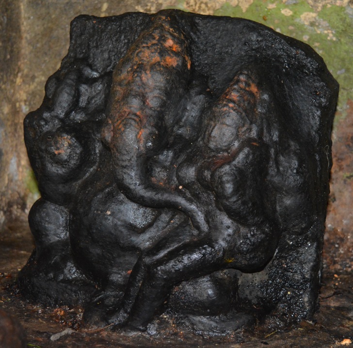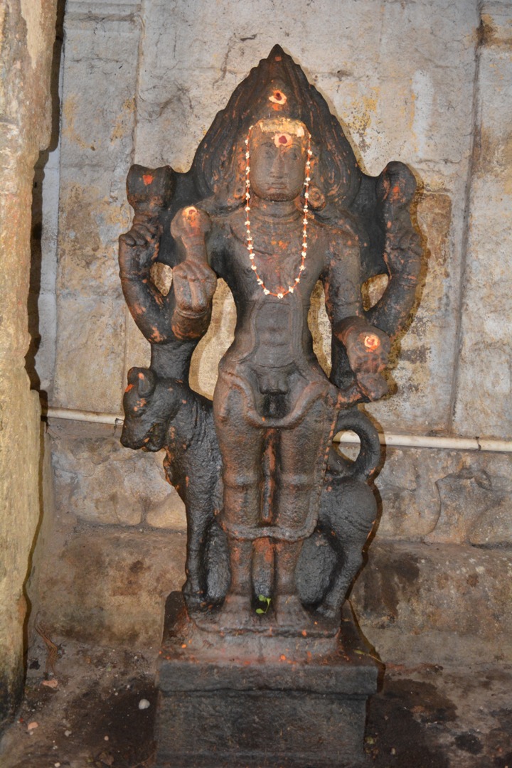 THE MAHA MANDAPA The mukha mandapa and the maha mandapa are connected by a small passage, a closed provision. The walls of the passage lack sectioning and constructed out of stone blocks. The maha mandapa is a pillared hall and bigger than the mukha mandapa both in length and breadth. The walls of the maha mandapa have pratibandha adhishthana, bhitti and prastara, but the prativari of the adhishthana alone is visible at present whereas the rest are inhumed in the ground. The yazhis of the prati series are shallow carving. Six pilasters on the north and south, two pilasters on the western side canton the bhitti of the mandapa and the pilasters are brahmakantha and possess head components viz., kattu, kalasa, tadi, kudam, pali and phalaka. The head components lack embossed ornamentation as found in mukha mandapa and vimana. The potikas are at some places vettu and at some places angular and bear the uttira. Vajana, valabhi and kapota forms the other prastara elements. The kapota is ridged and also adorned with kudus, at some instances it is shallow and at some instances only provision is seen. The roof is covered with stone slabs and the bhumidesa above it. The bhumidesa is plain but provision for makara is seen at the corners. Brick and tile finishing is seen above the roof. Both the bhumidesa and the valabhi are plain. Windows are seen on the northern and southern sides. The pillars inside the mandapa possess three squares and vishnu kattu ornamentation in between with padmakattu at both ends of the vishnu kattu. The vettu potikas that rest above the pillars bear the prastara of the mandapa. Roof slabs are laid to cover the roof of the mandapa. Closed provisions are seen on the western corners of this mandapa. THE OPEN PILLARED MANDAPA The space in between the second gopura and the maha mandapa is covered with an open pillared mandapa and the pillars carry the same features as found in the maha mandapa. But here the squares are adorned with medallions. Few of the potikas are madalai and nunudal. The goddess shrine lies on the northern side of the mandapa. Navagraha and Bikshadana are on the eastern side of the mandapa. Uchchhishta Ganesa is seen on the western side of the mandapa. SCULPTURES VRISHABHARUDHA The southern koshtha is adorned with Vrishabharudha. The god is standing on a pedestal with his right leg in sama and the left leg in trysra. His front right hand is in katyavalambita whereas the front left hand is resting on the Nandi who is standing behind. The back hands are in kataka mudra and carry akshamala in the right but the object in the left hand is not clear. The braids are arranged as jatamakuta in the apex besides head ornament, flowers, skull, crescent moon are decked in the matted hair. His elongated ears are adorned with kundalas; patrakundala in the right and makara kundala in the left. A short attire is draped around the lower body which is fastened by an ornamental hip belt. In addition, the idaikattu is slackly worn above it, heavy knots of it are seen on both the sides. The yajnopavita is worn in upavita fashion. The deity is decked with various ornaments viz., charapali, kandigai, bangles, keyura and udarabandha. In both the hands fingers are adorned with rings. The Nandi is standing cozily with the God with his head on the left side of the God. Though the sculpture is much dilapidated still exhibits the prodigy of the Early Chola sculptors; an excellent poise has been maintained by the sculptor. Slight leaning of God by resting his front left hand on Nandi who is to his left and a light tilt of the head on right side gives an excellent posture. Besides, the God in slim structure, richly adorned ornaments and the untied braids spreading on the shoulders, all add gorgeousness to him. UCHCHHISHTA GANESA Ganesa is seated in maharajalilasana on a pedestal with his front right hand in kataka and holding the broken tusk and his front left hand is embracing the goddess seated on his left lap. The back hands are in kataka mudra and also carry objects; parasu in the right and pasa on the left. He is adorned with karanda makuta, short attire, charapali, udarabandha and yajnopavita. His proboscis is touching the private parts of the goddess. The goddess seated on the left lap of Ganesa is decked with karanda makuta, kundalas, charapali and other ornaments. A short attire drape the lower part of her body but the breast band is absent. Her left hand is carrying a flower whereas her right hand is stretched to her side. It is a unique sculpture rarely found in Tamil Nadu. One such sculpture is found in Nagaswaraswamin temple in Kumbakonam and Okaliswaram in Malayakkoil in Pudukkottai district.