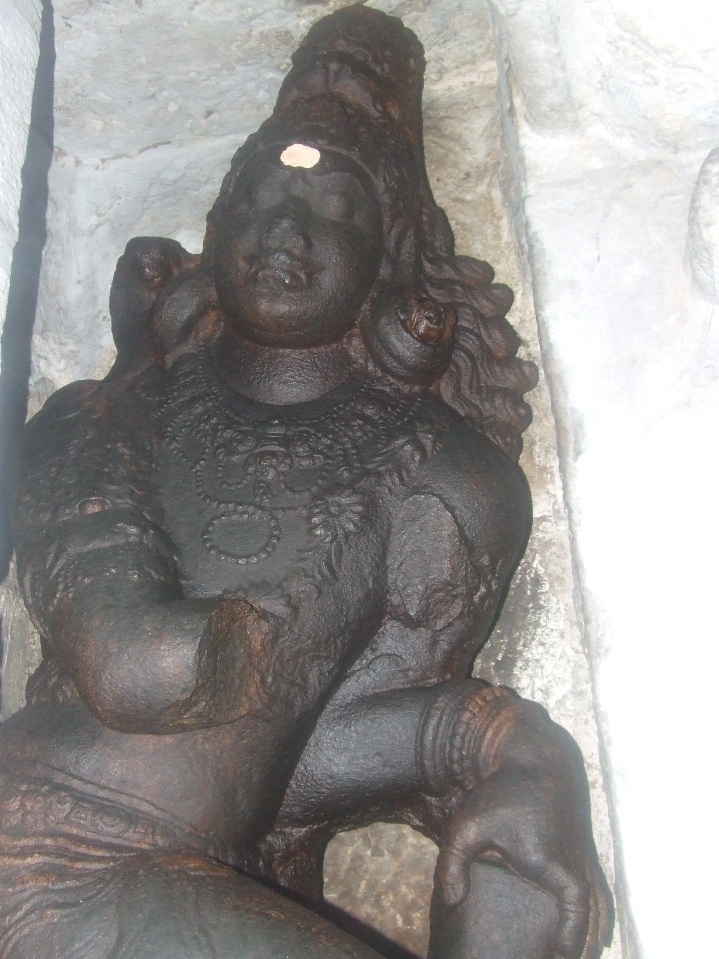 DVARAPALAS Both the dvarapalas are masterpiece of early Chola sculpture. They are standing on the pitha in dvibanga posture with their lower body twisted towards sanctum and the upper body facing straight. The dvarapala in the north has placed his right leg on the pedestal in parsva and the left leg is lifted up and placed on the machete of the cylindrical plank held by him to his right, whereas his counterpart placed his left leg on the pedestal in parsva and the right leg is lifted up and placed on the tree branch held by him on his left. The dvarapalas have positioned their one hand in mudra and the other hand on the plank; the right hand of the northern dvarapala is in vismaya and the left hand is holding the cylindrical plank placed to his right. His counterpart is holding the tree branch on his left hand and the right hand usually in darjani mudra is unfortunately got mutilated. For both the dvarapalas the attire and ornaments are similar. Both are lavishly decked with stone and pearl studded ornaments. Locks are formed as braids, a tuft is matted as jatamakuta in the apex and a portion of braids in the lower head are beautifully curled and left untied spreading behind. The makuta is ornamented with pearl strings that hang throughout and head patta adorns the fore head. Ears are elongated and adorned with owl kundalas. A heavy stone and pearl studded neck ornament is adorned by them, in addition, pearls strings also dangle in the neck ornament. The arms are adorned with bangles in the wrists, simhamukha armlets in the upper hand. Pearl strings also hang in the armlets. Yajnopavita is worn in upavita fashion, it has four different stings and the brahmasutra is shown as flower brooches. Both are adorned with udarabandha which possess brooch and pearl strings. Their lower garment is a short attire (marauri aadai) fastened by stone studded hip belt, excess noose of the hip belt dangle in the front. Idaikattu is slackly worn above the lower garment, the tussles of the knot hangs on sides. Both the dvarapalas are adorned with anklets in addition the northern dvarapala is also adorned with anklet in the calf. A snake is seen with its raised hood behind the left shoulder of the northern dvarapala whereas for the southern dvarapala it is on the right shoulder. The dvarapala in the north is holding a plank which has heavy cylindrical body with a trimmed handle and pointed tip. The tree branch held by the southern dvarapala is also a heavy twig. Two holes are seen on the branch; one in the lower part of the twig and the other in the upper part. A snake is seen emerging out of the lower hole and chasing a rat that runs furiously. Besides, a reptile is also seen climbing the branch.