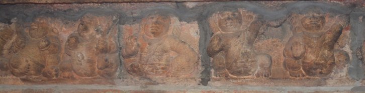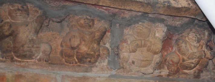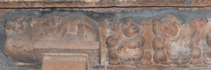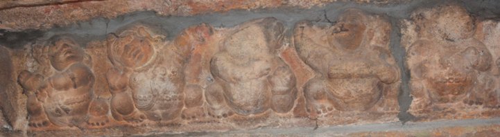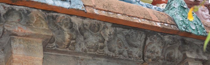 CHANDRASEKARASWAMI TEMPLE SCULPTURES BHUTA GANAS The bhuta frieze is running for both the vimana and the mukha mandapa. As like the Sri Viswanatha-Visalatchi shrine, the bhuta frieze in the Chandrasekaraswami shrine is also a remarkable feature. Ornaments, dressing, amusements and the performing arts that prevailed in the society are pictured. The ganas are depicted in active posture; mostly in dancing gestures or frolicking with the swans, handling instrument, frisking or conversing with the neighbour. In addition, swan, tortoise, snake, owl, monkey are also shown in the series. Overall the series gives a lively experience. Female ganas are absent whereas monkey faced ganas are seen. The ganas are adorned with short attire and decked with various ornaments. The elongated ears are decked with either pootu kundala or patra kundala and some are seen without any kundalas. The locks are arranged as jatabhara and decked with head ornament, but for some of the ganas simply gathered and knotted. Charapali or beaded mala or chavadi are adorned in the neck; bangles, armlets are the ornaments in the hand. Udarabanda is of different patterns, for most of the ganas it is bow knotted in the belly which looks like vastra udarabanda whereas for some it is like interlocking chains or patterned chains. The yajnopavita is worn in upavita fashion. While Sri Viswanatha shrine gana series carries peacock a frequent depiction, here swans replace it. Swans either single or a pair or a gana frolicking it are seen. The birds are depicted in active posture with its wings spread and mouth wide open. Twittering pairs are seen at two places, facing each other. Gana frolicking with the swan is seen both on the northern and southern side, at one place the gana is peeking inside its mouth by wide opening the beak. Every corner is adorned with simha or yazhi and the platforms formed in the junctions are depicted with birds or animals in resting posture. In some of the platforms Nandi is depicted in the usual seated posture. Gana, bull, monkey, lying in relaxed postures with head resting on the floor of the platform are seen at some places. A pair of owl, animal carrying its young ones and baby Krishna in reclining posture also forms part of the depiction. Hands of the ganas are positioned in various ways either raised up or stretched down or folded in half way and showing either a mudra or a hasta. Some of the ganas are seen in gestures like pataka, recita, danda and some are seen with the gestures of kataka, tarjani, vismaya. At some places ganas are paired in gestures. On the northern side a pair is carrying the plank. Instruments like talam, cirattaikinnari, flute, mattalam, idakkai, conch are seen. Both the instrumentalists and the other performers are with their head tilted upward, with vibrant body postures and other gestures show their total involvement in the performance. The gana series in the second tala also possess the same features as found in the first tala.