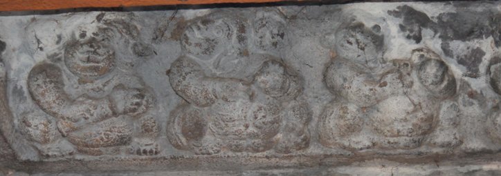 Both the females on the northern side are whisk bearers and are standing straight while the one on the east with her legs in sama while the other one placed in trysra. Both are carrying whisk on their right hand and the left hand is stretched to their side. The female on the east is resting the whisk on the right shoulder while the other is resting over the shoulder stretching behind the neck. Their locks are gathered in the apex and knotted and the excess locks flows like a pony tail from the knot. Patrakundala or pootukundala, bangles, armlets, charapali, hip ornaments are adorned by them. Both are wearing a long attire extending upto their ankle but breast band is absent. The female in the west is adorned with same dressing and ornaments but in profile posture and in anjali hasta. Among the three male figures, two are found in the south and one in the west. Among the three the one on the south east is a rishi with beard and mustache. All the three are with their one hand in katyavalambita and their other hand folded upwards and showing kataka mudra, except the rishi the other two are carrying flower. As like the females all the three are wearing a long attire extending upto to their ankle and adorned with ornaments like pootukundalas, bangles, armlets, charapali. The vastra yajnopavita is worn in upavita style. All the three are standing straight but their foot placed differently, the males on the south have placed in trysra whereas the male on the west placed his left leg in sama and the right leg in parsva.