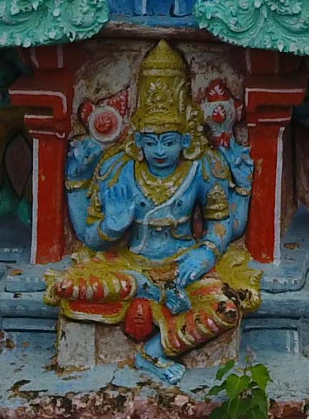 SCULPTURES IN THE GRIVA KOSHTHAS Umasahita, Vishnu, Dakshinamurthy, Brahma are the deities found in the east, west, south and north respectively in the griva koshthas. Vishnu is seated in suhasana on a pitha with his front right hand in abhaya and the front left hand is placed on the thigh whereas his back hands are in kartari mudra and carry chakra in the right and sankha in the left. In kritamakuta and silk dress he is also richly adorned with ornaments.