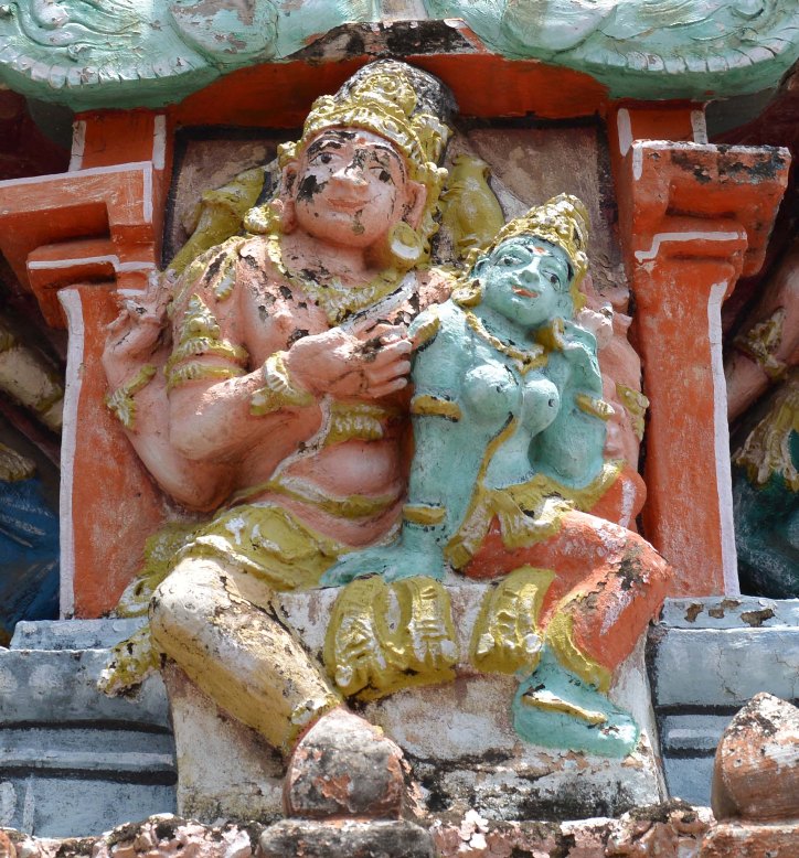 On the east, both the god and the goddess are seated on a pitha in utkutikasana. In jatamakuta and short attire the god is decked with all usual ornaments. His back hands in kartari mudra carry axe in the right and deer in the left. The front left hand is embracing the goddess whereas his front right hand is positioned as like pointing her grace. The goddess seated to his left in the front, between his legs is adorned with karanda makuta, long attire and all usual ornaments, placed her right hand on the floor of the pedestal and the left hand is carrying the lotus. Breast band is absent. Both with their head tilted left, cozily seated in bright grin.