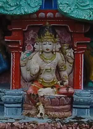 Dakshinamurty is seated in virasana on a hillock with his front right hand in chin mudra carrying akshamala whereas the front left hand is in kataka. The back hands are in kataka and carry snake in the right, fire in the left. In jatabhara and short attire he is decked with various ornaments. The deity is surrounded by rishis and ganas. Brahma is seated in suhasana on the padma pedestal with his front right hand in abhaya and the front left hand is placed on his thigh whereas his back hands carry objects; akshamala in the right and lotus in the left. His locks are arranged as jatamakuta and he is decked with long attire and various ornaments.