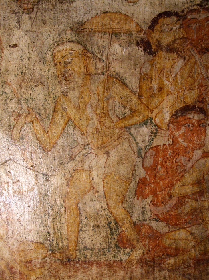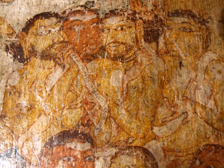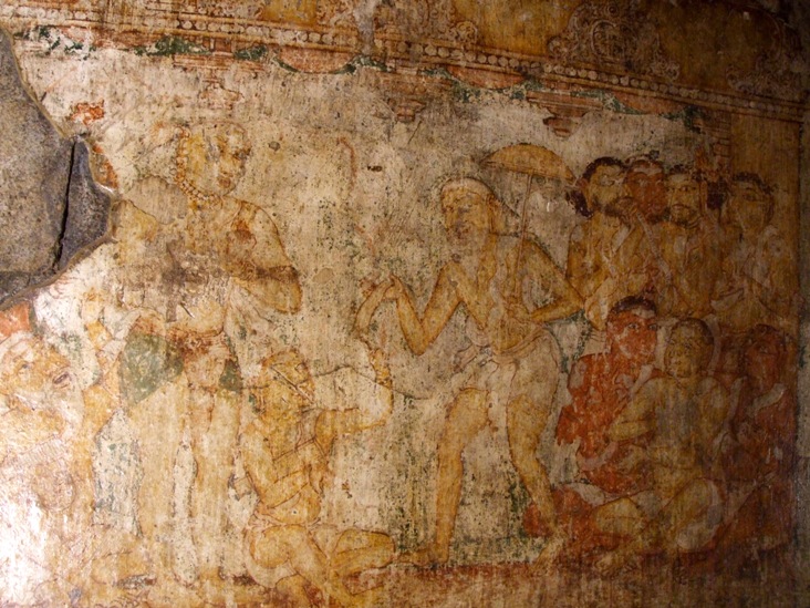 வழக்குரைஞரான சிவபெருமானின் இடப்புறம் மூவர் அமர்ந்துள்ளனர். நால்வர் நிற்கின்றனர். அமர்ந்திருக்கும் இளையவருள் நடுவிருக்கும் மஞ்சள்மேனியர் ஏதோ கூறக் கருதியவர் போல், வலக்கையை மார்பருகே நிறுத்தி, இடக்கையை வலப்புறமாய் நீட்டி, உணர்வலைகள் முகத்தில் பொங்கக் காட்சி தருகிறார். அவரின் இருபுறத்தும் அமர்ந்திருக்கும் சிவப்பு மேனியர்களுள், வலப்புறத்தார் விழிகளை அகல விரித்துப் பெருந் திகைப்போடு வலக்கையில் சின்முத்திரை காட்டி நடுவில் உள்ளவரை நோக்க, இடப்புறத்தார் நடக்கும் வழக்கில் தம்மையிழந்து மெய்மறந்தாராய்க் கண்கொட்டாது பார்க்கிறார். துணியை முப்புரிநூலென அணிந்த முதலிருவர் நெற்றியில் திருநீறு. இடக்கையில் சுவடிக்கட்டேந்தியுள்ள மூன்றாமவர் மார்பின் இருபுறத்தும் தொங்குமாறு மடித்த துணியைக் கழுத்தில் அணிந்துள்ளார். அணிகலன்கள் ஏதுமற்ற நீள் செவியரான இம்மூவரில் யாருக்கும் மீசையில்லை. இடுப்பில் சிற்றாடையும் நெற்றியில் திருநீறுமாய் நீளவளர்த்த செவிகளுடன் நிற்பார் நால்வருள் மூவர் முன்னிருக்க, ஒருவர் பின்னிருந்து பார்க்கிறார். முன்னவர் மூவருள், முதலிருவர் கருங்கொண்டையும் தாடி, மீசையுமாய்க் காட்சிதர, மூன்றாமவர் தாடி, மீசையில் நம்பிக்கையற்றவராய்க் கொண்டையே போதுமென்று நிற்கிறார். அவரது தலையைச் சுற்றி ருத்திராக்கமாலை. மற்றவர் போல் துணியை முப்புரிநூல் என அணிந்துள்ள இம்மூவருள் வலப்புறத்தார் தாடி நன்கு வளர்ந்து முக்கோணமாய் நீள, நடுவர் குறுந்தாடி அழகராய்க் காட்சி தருகிறார். கழுத்தில் கண்டிகை அணிந்தவராய் நடுவிலிருப்பவர் தம் இருகைகளிலும் ஓலைச்சுவடியொன்றைப் பிடித்துள்ளார். சுவடிச் செய்தி தம்மைத் துணுக்குறச் செய்துவிட்டாற்போன்றதொரு பார்வையுடன், வழக்காடி நிற்பவரை நோக்கும் அவரைப் பார்த்தபடி வலப்புறத்தாரும் பின்னவரும் பார்வையிலேயே வியப்பின் விளிம்பு காட்டிக் கேள்விகள் தொடுக்க, வலப்புறத்தார், ‘அவசரப்பட வேண்டாம் பொறுங்கள்’ என்பது போல் வலக்கையில் மெய்ப்பாடு காட்டுகிறார். இடப்புறத்தார் இந்த நிகழ்ச்சிப் பின்னலில் வியப்பின் உச்சிக்கே போனவராய்ச் சுவடிக்கட்டை மார்பின் பக்கவாட்டில் இடுக்கியிருக்கும் இடக் கையை வியப்பில் மலர்த்தி, ‘என்னவிது கொடுமை!’ என்பது போல் பரிதாபப் பார்வை சிந்துகிறார். அறக்களத்தாரின் பல்வேறு உணர்வலைகளுக்குக் காரணமான சிவபெருமான் வலக்கையில் ஓலையும் இடக்கையில் குடையுமாய்ச் சுந்தரரை அடிமைப்படுத்தும் வகையில் வழக்கை நடத்திச் செல்ல, எதிரே சுந்தரர் செய்வதறியாதவராய், மாப்பிள்ளைக் கோலத்தில் மருட்சியுடன் நிற்கிறார். அவரது நீள்செவிகள் வெறுமையாக அமைய, கழுத்தில் பெருமுத்த