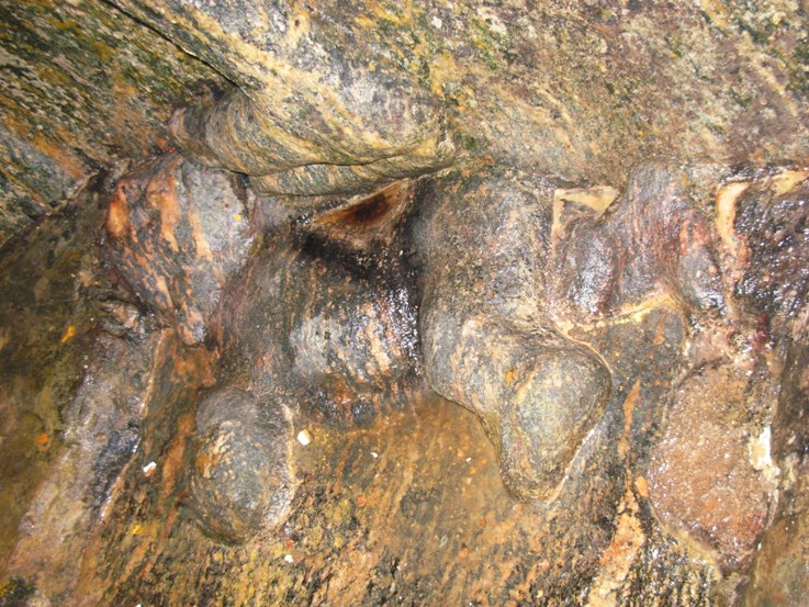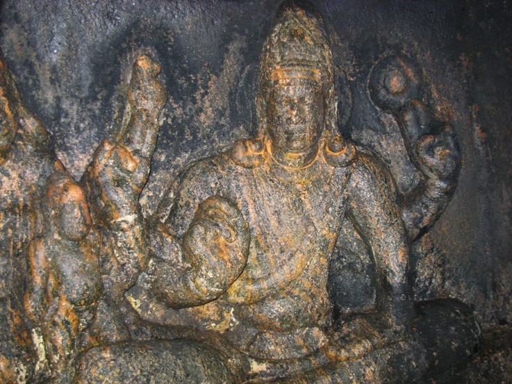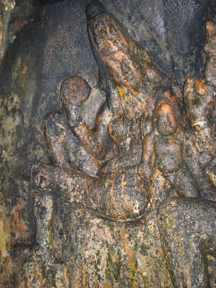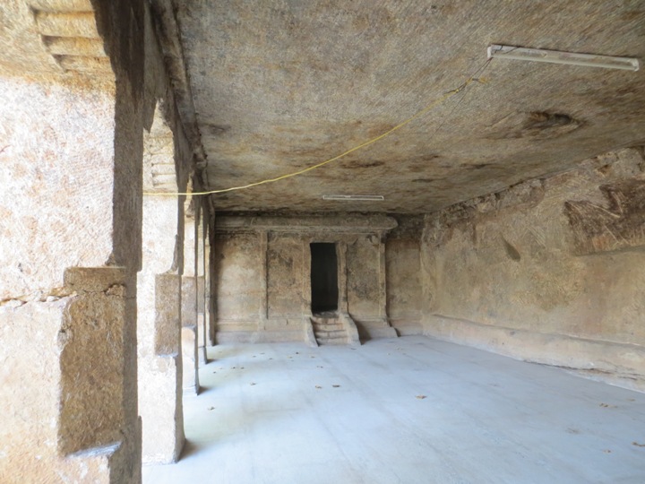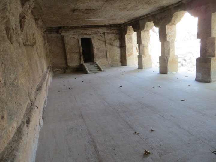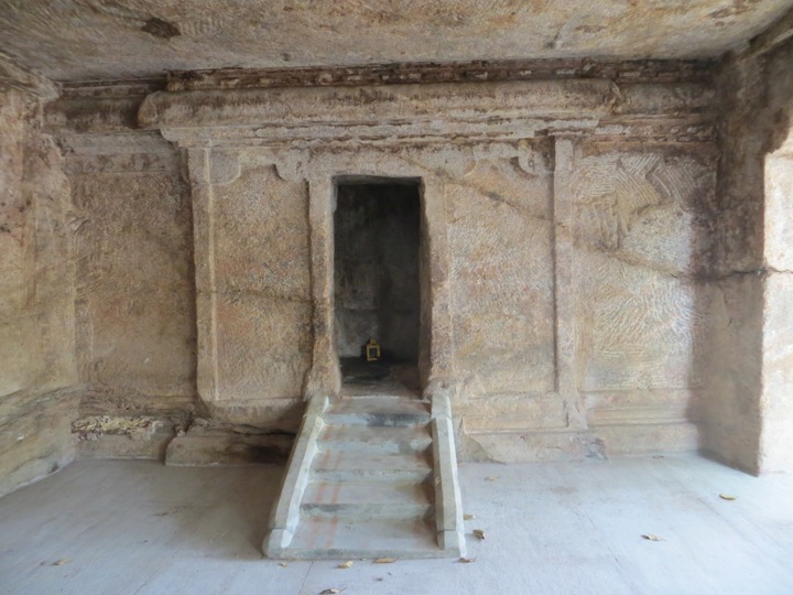 2. குடைவரையின் அர்த்தமண்டபப் பின்சுவர் வெறுமையாக உள்ளது. நூலாசிரியர் குறிப்பிடும் சிற்பங்களுள் ஒன்றேனும் அங்கில்லை. (படம் 2, 3)
