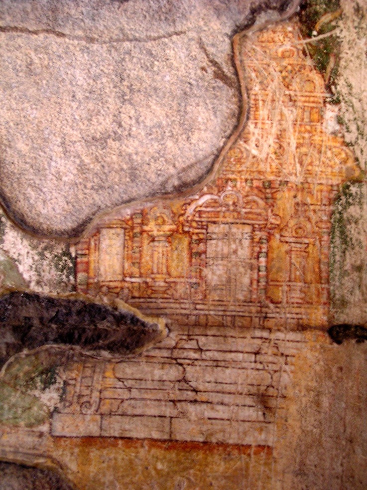 அவர் அமர்ந்திருக்கும் மேடை பல அடுக்குகளுடன் அமைந்துள்ளதெனினும், சிதைவால் மேலடுக்காய் விளங்கும் பெருந்தாமரைத்தளம் மட்டுமே கண்களுக்குப் புலனாகிறது. மேடையமைந்திருக்கும் முன்றிலின் வலஓரத்திலுள்ள நான்முகத் தூண் தரங்கப் போதிகைக் கைகளால் உத்திரம் தாங்க, மேலே கூரையின் முன்னிழுப்பாய் நீட்டப்பட்டிருக்கும் கபோதம், கூடு வளைவுகளுடன் வள்ளி, சந்திரமண்டல அலங்கரிப்புகள் பெற்றுள்ளது. கூரைக்கு மேல் பூமிதேசம் படர்வதைக் கபோத நுனியில் காட்டப்பட்டிருக்கும் மகரத்தலை உணர்த்துகிறது. திருவருட்துறைக் கோயிலின் விமானம் கிழக்கு நோக்கியதெனக் கொள்ளின், அதன் வடக்குப் பரிமாணம் இங்குக் காட்டப்பட்டிருப்பதாகக் கருதலாம். இரண்டு கர்ணம், ஒரு சாலையென மூன்று பத்திப் பிரிப்புகளுடன் அமைந்திருக்கும் ஆதிதளத்தின் தாங்குதளம் உபானத்தில் தொடங்குகிறது. பெருந் தாமரையாக ஜகதியும் அடுத்துக் கம்பும் தாமரைவரிகளால் அணைக்கப்பெற்ற உருள்குமுதமும் பிரதிவரியும் உள்ளமையால் இத்தாங்குதளத்தைப் பிரதிபந்த வகையினதான பத்மபந்தமாகக் கொள்ளலாம். பிரதிவரியின் மேல் படரும் கம்பையடுத்து வேதிக்கண்டமும் தாமரைவரி அணைவு பெற்ற வேதிகையும் உள்ளன. வேதிகைக்கு உள்ளடங்கிப் பரவும் கம்பின் மேல் எழும் இரண்டு நான்முக அரைத்தூண்களுக்கு இடைப்பட்டுள்ள சுவரின் நடுப்பிரிவாக இரண்டு கதவுகளால் அடைபட்டிருக்கும் வாயிலுடன் சாலைப்பத்தி. அதன் இருபுறத்தும் நான்முக அணைவுத் தூண்கள். வாயிலுக்கு மேலிருக்குமாறு இத்தூண்களுக்கு இடைப்பட்ட நிலையில் அழகிய மகர தோரணம். வாயிற் கதவுகளில் ஒவ்வொரு கதவிலும் மூன்று குறுக்குப்பட்டைகளும் இரண்டு நீளப்பட்டைகளும் உள்ளன. இவ்வாயிலுக்கும் சுவர்த்திருப்பத் தூண்களுக்கும் இடைப்பட்ட கர்ணபத்திகளில் கும்பப் பஞ்சரங்கள். சுவர்த்தூண்களின் போதிகைகள் தாங்கும் உத்திரத்திற்கு மேல் கூரையுறுப்புகள். கபோதம் அழகிய கூடுவளைவுகளுடன் அமைய, மேலே வேதிகையும் ஆரஉறுப்புகளும் அமைந்துள்ளன. பூமிதேசத்தை இனங்காணக் கூடவில்லை. ஆதிதளத்திற்கு மேற்பட்ட விமான உறுப்புகளின் பெரும்பகுதி சிதைந்திருப்பதால், ஆரஉறுப்புகளின் அமைப்பை அறியக்கூடவில்லை. அவற்றின் பின்னெழும் இரண்டாம் தள அரமியத்தின் வடமேற்குப்பகுதி ஓவியத்தில் தெளிவாக உள்ளது. அரமியக் கூரையிழுப்பான கபோதம் கூடு வளைவுகளுடன் காட்சிதர, மேலே பூமிதேசம். அதற்கு மேல் உள்ள விமான அமைப்பு முழுவதுமாய் அழிந்துவிட்டதால் கிரீவம், சிகரம், தூபி ஆகியவற்றின் வடிவமைப்பு அறியக்கூடவில்லை. விமானத்தின் சாலைப்பத்தி வாயில் கொண்டுள்ளமையால் இவ்விமானத்தை நாற்புற வாயில் பெற்ற சர்வதோபத்ரமாகக் கொள்ள வாய்ப்புண்டு. மிகச் சி
