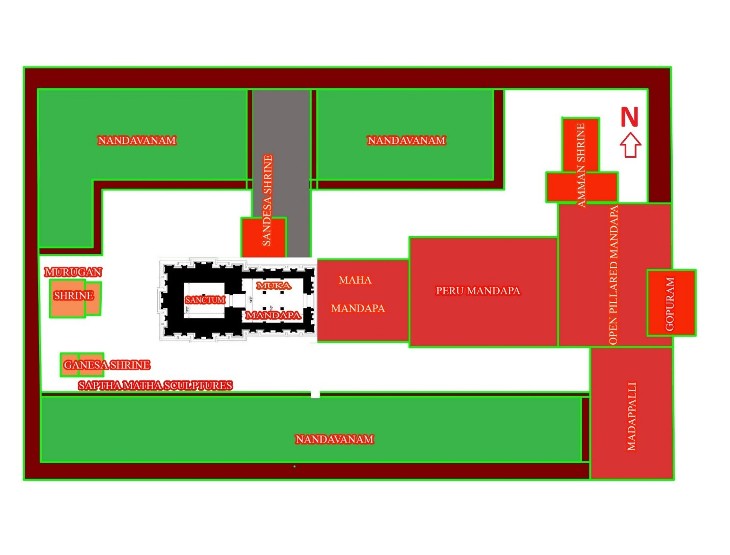 முகமண்டப வெளிச்சுவர் ஆரம்பிக்கும் அவ்விடத்தில் இடப்புறமாக நந்தவனத்தை அடைய ஒரு வழி அமைக்கப்பட்டுள்ளது. இத்திருச்சுற்றுப்பகுதியின் தென்மேற்குப் பாகத்தில் விநாயகர் கோவிலும், விநாயகர் கோவிலை அடையுமுன் இடப்பகுதியில் நந்தவன மதில்சுவரில் சாய்த்து வைக்கப்பட்டுள்ள சப்தமாதர் சிலைகள் வடக்கு நோக்கிய நிலையிலும் உள்ளன. திருச்சுற்றின் மேற்குப்பகுதியில் முருகனின் ஆலயம் அமைந்துள்ளது.