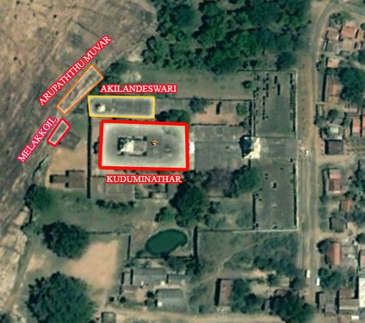 அதனைக்கடந்து உள்ளே செல்லக் குடுமிநாதர் கோயிலின் திருச்சுற்றின் வடக்குப் பக்கம் அகிலாண்டேஸ்வரியின் சன்னதிக்குச் செல்ல ஒரு வாசல் இருந்தது. அதன்வழியே சென்று பின்பக்க மதிலை அடைந்து மேற்கே செல்ல, அங்கு "மேலக்கோயில்" என்றழைக்கப்படும் குடைவரைக்கோயில் இருந்தது.