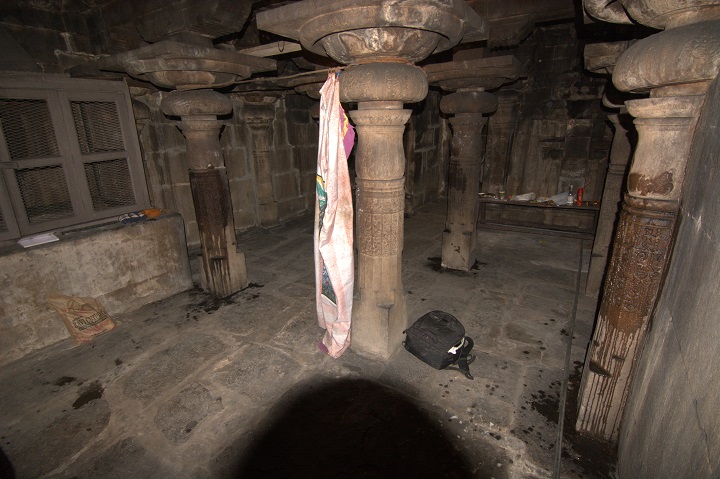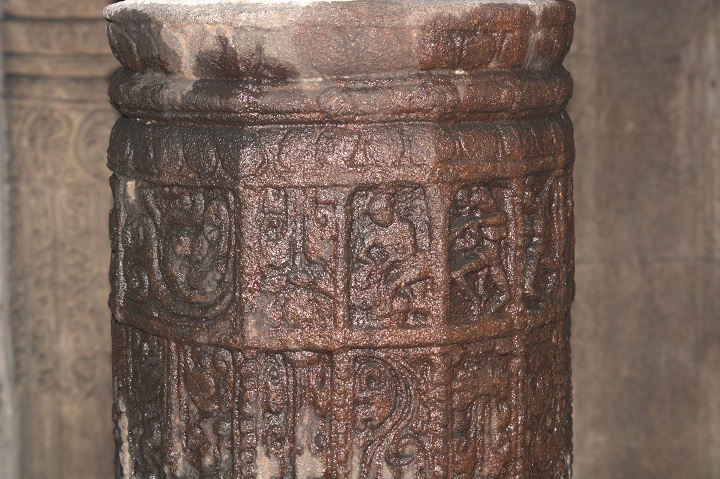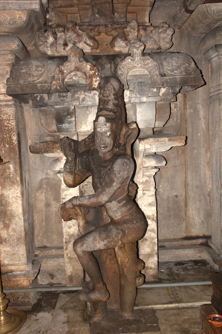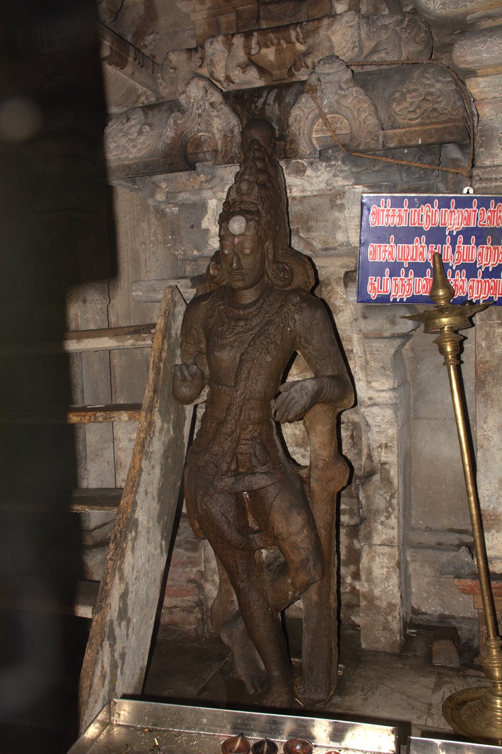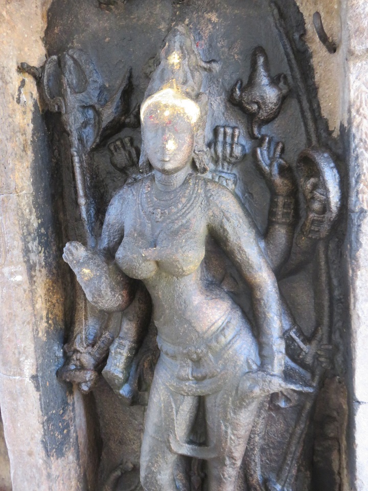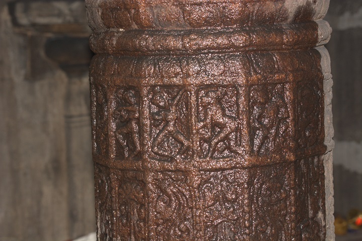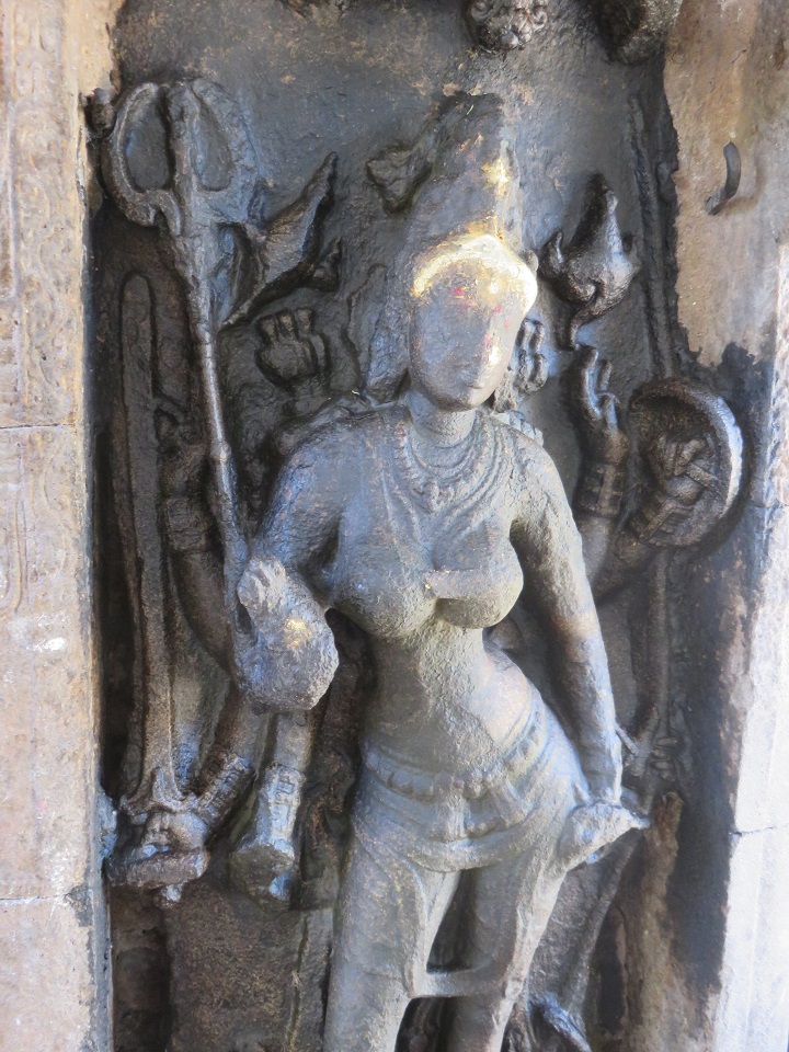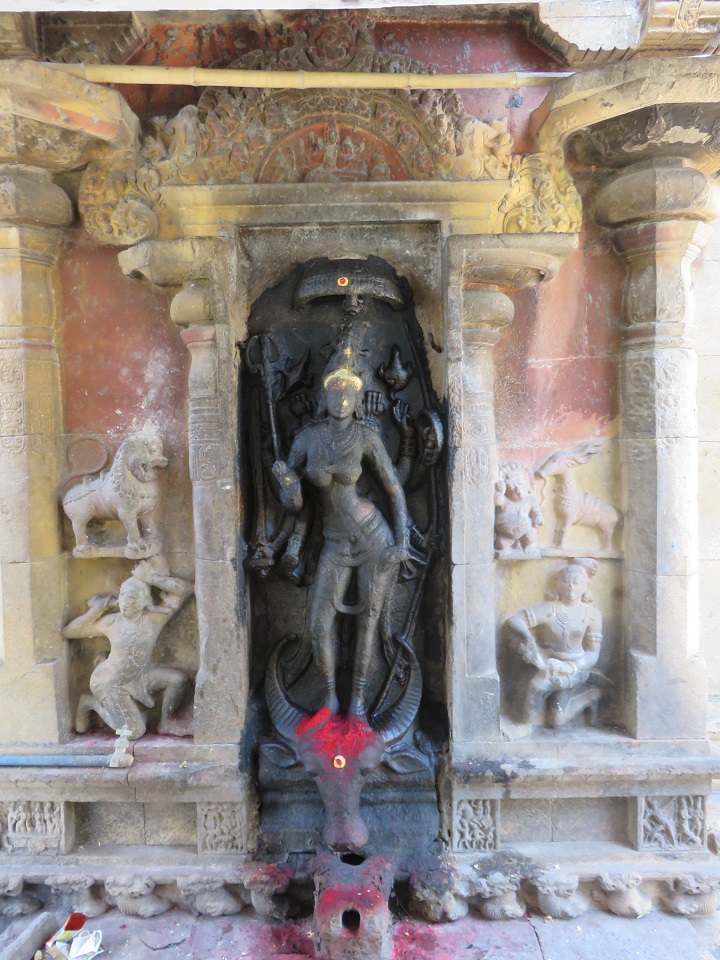 மேலே நன்கு அலங்கரிக்கப்பட்ட குடையுடனும், தலையில் கரண்ட மகுடத்துடனும் காட்சிதரும் அம்மையின் நெற்றியை நெற்றிப்பட்டம் அலங்கரிக்கின்றது. இரு செவிகளிலும் மகர குண்டலங்கள். பின்புறம் இருபுறமும் அம்பறாத்துணியும் இடப்புறம் சங்கும் வலப்புறம் எறிநிலைச் சக்கரமும் காட்டப்பெற்றிருக்கின்றன. வலமுன்கை காக்கும் குறிப்பிலிருக்க, பின்கைகளில் முறையே மணி (?), நீண்ட வாள், சூலம். இடமுன்கை கடியவலம்பிதமாக அமைய, பின்கைகளில் முறையே வில்லும் கேடயமும். மற்றொரு பின்கை திரிபதாக முத்திரையில் இருக்கிறது. மார்புக்கச்சு அணிந்துள்ள அம்மையின் கழுத்தைச் சரப்பளியும் முத்துமாலைகளும் அலங்கரிக்கின்றன. இடமார்பில் முடிச்சுடன் கூடிய உபவீத முப்புரிநூலும் முடிச்சுடன் கூடிய உதரபந்தமும் உள்ளன. அதன்கீழே இடைக்கட்டும் தோலாடையும். எல்லாக் கைகளிலும் மூன்றடுக்கு வளையல்கள் இருக்கின்றன. சிலம்பணிந்து எருமைத்தலையின்மீது இருத்தப்பட்ட கால்களில் வலதுகால் பார்சுவத்திலும் இடதுகால் சமத்திலும் உள்ளன. ![]() ![]() ![]() கோட்ட அணைவுத் தூண்களுக்கும் பத்தி அணைவுத் தூண்களுக்கும் இடைப்பட்ட பகுதியில் கிழக்கில் மேலே சிங்கமும் கீழே தலைப்பலிச் சிற்பமும் வடிக்கப்பெற்று, மேற்கில் மேலே கலைமான் மற்றும் குள்ளப்பூதமும் கீழே நவகண்டச் சிற்பமும் வடிக்கப்பெற்றுள்ளன. கிழக்கில் ஒரு பீடத்தின்மீது நான்கு கால்களையும் ஊன்றியவாறு சுழற்றிய வாலுடன் கர்ஜித்தபடி நின்று கொண்டிருக்கும் சிங்கத்தின் பிடரி மயிர்க்கற்றைகள் சுருண்டிருப்பது செழுமையாகக் காட்டப்பட்டுள்ளது. ஊர்தியாகப் பயன்படுத்தும் வண்ணம் முதுகின்மேல் சிறிய ஆசனமும் அது கீழே விழாமல் இருக்க வயிற்றைச் சுற்றியும் பின்புற உடலைச் சுற்றியும் கட்டப்பட்டிருக்கும் கச்சைகளில் பின்புறக் கச்சை மணிகள் போன்ற அலங்கரிப்புப் பெற்றிருக்கிறது. அதன் கீழே இடது கையால் தலைமுடியைப் பற்றியவாறு வலது கையால் தன் கழுத்தை வெட்டிக் கொள்ளும் தலைப்பலி வீரரின் இடப்புறச் செவியில் பனையோலைக் குண்டலம். கழுத்தைச் சரப்பளியும் கண்டிகையும் அலங்கரிக்க, மார்பை ஸ்வர்ண வைகாக்ஷம் அழகு செய்கிறது. கைகளில் மணிக்கட்டில் வளைகளும் தோளில் கேயூரமும் கொண்டு இடைக்கட்டுடன் கூடிய தோலாடையை அணிந்திருக்கும் இவரது வலக்கால் கருடாசனத்தில் அமைந்துள்ளது. இடுப்பில் குறுவாள் தொங்கிக் கொண்டிருக்கிறது. மேற்கில் கைகளில் இலைத்தாளத்தை இசைத்தவாறு பரவச நிலையில் தலையை வலப்புறமாக ஒருக்கணித்து நின்று கொண்டிருக்கும் குள்ளப்பூதத்தின் தலைமுடி நன்கு அலங்கரிக்கப்பட்டிருக்கிறது. நெற்றியில் பதக்கத்துடன் கூடிய பட்டம் உள்ளது. கழுத்தில் கண்டிகையையும் மார்பில் உபவீத 