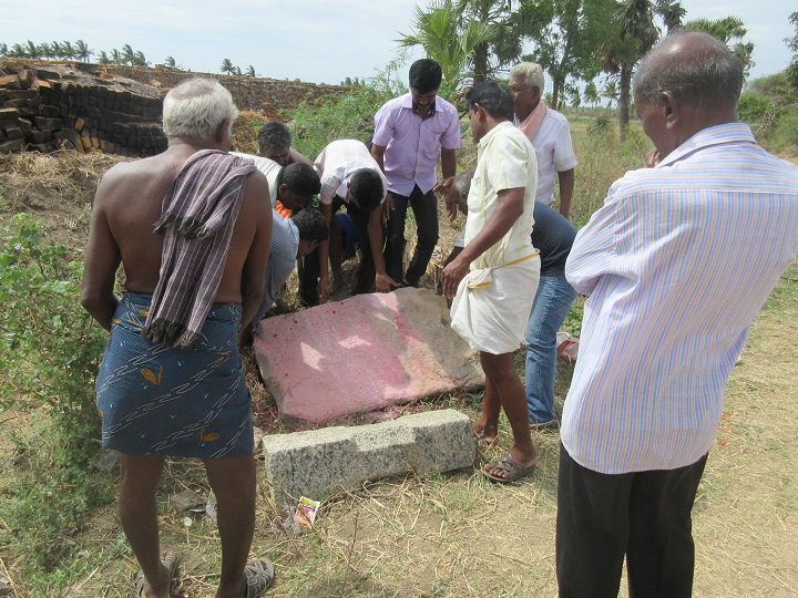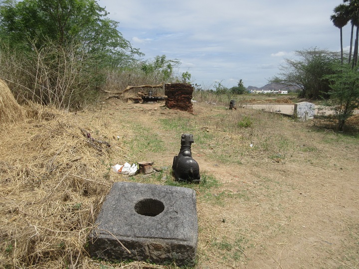 இக்கிராமத்தின் தென்பகுதியில் சிறு மண் மேடுமீது அழகிய சிவலிங்கத்திருமேனி வழிபாட்டில் உள்ளது. சிவலிங்கத்தைச்சுற்றி (நீள்சதுர) செவ்வக வடிவில் இடிந்த கோயிலின் செங்கற்கட்ட்டப் பகுதிகள் காணப்படுகின்றன. ![]() இங்கு கோயில் இருந்து இடிந்து விட்டதாகவும்,பின்னர் வழிபாடு நின்று விட்டதாகவும்.ஊர் மக்கள் கூறுகின்றனர்.தற்போது ஊர்மக்கள் இணைந்து சிவலிங்கத்திருமேனிக்கு வழிபாடுகளை மேற்கொண்டு வருகின்றனர். ![]() கோயிலின் வடக்குப் பக்கத்தில் கோமுகை அருகே அழகிய சண்டிகேஸ்வரர் சிற்பம் பூமியில் பாதி புதைந்த நிலையில் காணப்படுகிறது. அழகிய சோழர் கால சிற்பம். ![]() மேலும் இடிந்த கட்டடப் பகுதியின் மேல் வைக்கப்பட்டுள்ள தட்சிணாமூர்த்தி சிற்ப வடிவம் பாதியாக உடைந்த நிலையில் உள்ளது.இத்திருமேனி 16-17 நூற்றாண்டை சேர்ந்ததாக விளங்குகிறது. ![]() சிவலிங்கத்திருமேனிக்கு எதிரில் நந்தி அமர்ந்த நிலையில் காணப்படுகிறது. அதற்குப்பின்னால் சதுர வடிவ கல் நடுவில் வட்ட வடிவமான துளையுடன் கூடியது தரையில் கிடக்கிறது. இக்கல் கோயில் கொடி கம்பத்தின் அடிப்பாகமாக விளங்கியிருக்க வேண்டும் என ஊகிக்க முடிகிறது.முன்பு இக்கோயிலில் சிறப்பாக நடைபெற்று வந்ததை எடுத்துக்கூறும் சான்றுகளாக விளங்குகின்றன. இக்கோயில் பரிவார ஆலயங்களுடன் இருந்ததற்கு அடையாளமாக விநாயகர் சிற்ப வடிவம்,இவ்வூரில் உடையார் தெரு-முருகன் கோயிலில் வைக்கப்பட்டு வழிபாடுகள் நடைபெற்று வருகின்றன. ![]() கல்வெட்டுகள் இக்கோயிலை ஆய்வு செய்யச்சென்றபோது கோயில் அருகே பலகைக்கல்லில் பொறிக்கப்பட்ட கல்வெட்டினைப் பார்க்க நேரிட்டது. மேலும் ஊரில் இது போன்ற கல்வெட்டு பொறிக்கப்பட்ட கற்கள் ஏதேனும் உள்ளதா என்று இக்கட்டுரை ஆசிரியர் விசாரித்த போது , இவ்வூரில் உடையார் தெரு (மண்பானை செய்பவர்) அருகே கல்வெட்டு பொறிக்கப்பட்ட கற்கள் இருப்பது கண்டறியப்பட்டு ஆய்வு செய்யப்பட்டது. கல்வெட்டுக் குறிப்புகள் ![]() ![]() கல்வெட்டுகளில் தொன்மையான கல்வெட்டாக இராஜாதிராஜன் கல்வெட்டு விளங்குகிறது. எனவே இவர் காலத்திற்கு முன்பே இக்கோயில் கட்டப்பட்டிருக்க வேண்டும். அனைத்தும் பலகைக் கல்வெட்டுகளாக விளங்குவதால் இக்கோயில் முழுவதும் செங்கற்களால் கட்டப்பட்டிருக்கவேண்டும் என்பதை ஊகிக்க முடிகிறது. நாட்டுப்பிரிவு சோழர் காலத்தில் இப்பகுதி ஜெயங்கொண்ட சோழ மண்டலத்து வெண்குன்றக்கோட்டத்து, மருத நாட்டுப்பிரிவில் இருப்பதாக கல்வெட்டுகள் குறிப்பிடுகின்றன. இவ்வூருக்கு அருகில் வெண்குன்றமும், மருத நாடு என்ற ஊரும் உள்ளன. இறைவன் பெயர் : இக்கோயிலின் இறைவன் பெயர் திருவக்கீசுவரமுடைய மகாதேவர் எனக் கல்வெட்டுகளில் குறிக்கப்படுகிறது. ஆனால் இப