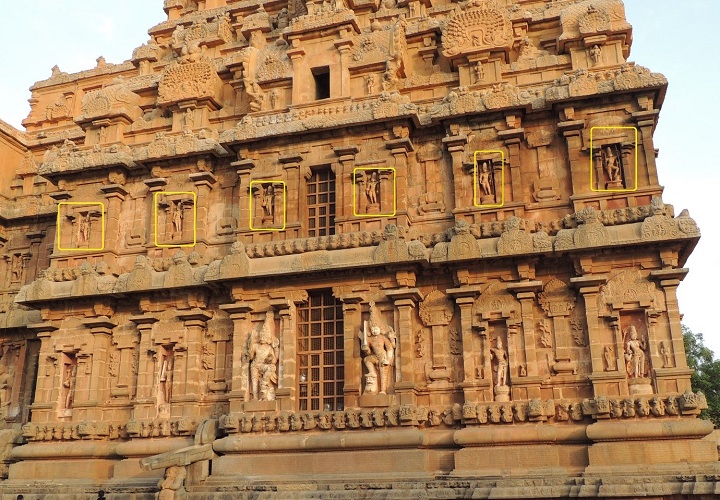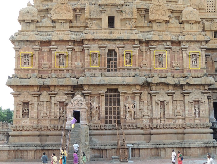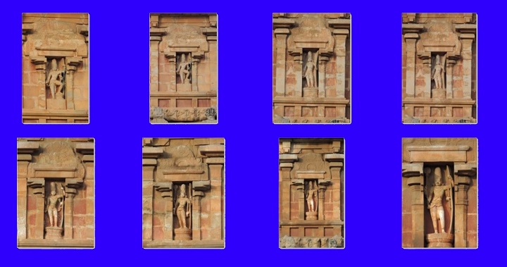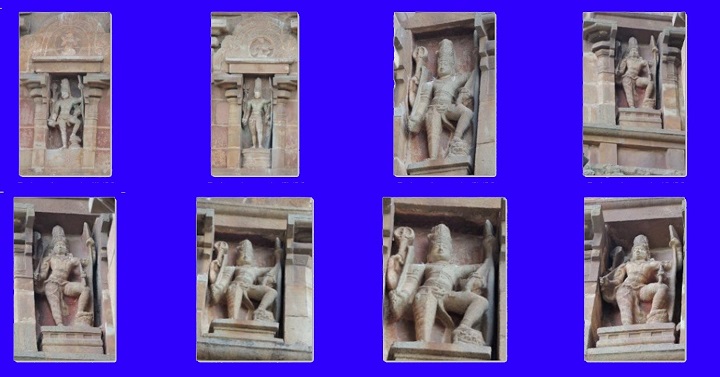 மேலும் தளங்களின் திருப்பங்களில் (கருவறை-கர்ணப்பத்தி)அமைந்த கோட்டங்களிலும், இடைநாழிகை மற்றும் முகமண்டபத்திலமைந்த கோட்டங்கள் அனைத்திலும், ஒரு காலை மடக்கி ஒரு பீடத்தில் ஒய்யாரமாக நிறுத்தி சுமார் பதினெட்டு கோட்டங்களிலும் மீதமுள்ள பதினான்கு கோட்டங்களில் சமபாதராய் சாந்தமாகவும் காட்சியளிக்கிறார். இது மட்டுமல்லாது தரை தளத்தில் நுழைவாயிலை அடுத்து துவாரபாலகருக்கு அருகாமையில் ஈசான பாகத்திலும் திரிபுராந்தகர் இருத்தப்பட்டுள்ளார்.